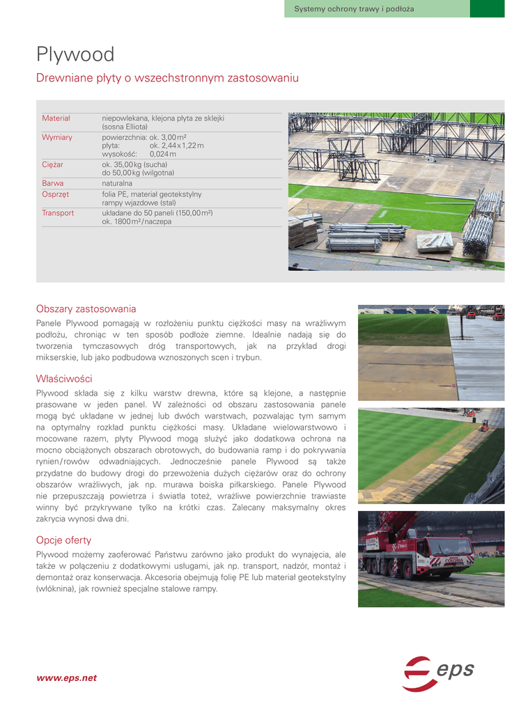 Systemy ochrony trawy i podłoża Plywood Drewniane płyty o wszechstronnym zastosowaniu Materiał Wymiary Ciężar Barwa Osprzęt Transport niepowlekana, klejona płyta ze sklejki (sosna Elliota) powierzchnia: ok. 3,00 m² płyta: ok. 2,44 x 1,22 m wysokość: 0,024 m ok. 35,00 kg (sucha) do 50,00 kg (wilgotna) naturalna folia PE, materiał geotekstylny rampy wjazdowe (stal) układane do 50 paneli (150,00 m²) ok. 1800 m² / naczepa Obszary zastosowania Panele Plywood pomagają w rozłożeniu punktu ciężkości masy na wrażliwym podłożu, chroniąc w ten sposób podłoże ziemne. Idealnie nadają się do tworzenia tymczasowych dróg transportowych, jak na przykład drogi mikserskie, lub jako podbudowa wznoszonych scen i trybun. Właściwości Plywood składa się z kilku warstw drewna, które są klejone, a następnie prasowane w jeden panel. W zależności od obszaru zastosowania panele mogą być układane w jednej lub dwóch warstwach, pozwalając tym samym na optymalny rozkład punktu ciężkości masy. Układane wielowarstwowo i mocowane razem, płyty Plywood mogą służyć jako dodatkowa ochrona na mocno obciążonych obszarach obrotowych, do budowania ramp i do pokrywania rynien / rowów odwadniających. Jednocześnie panele Plywood są także przydatne do budowy drogi do przewożenia dużych ciężarów oraz do ochrony obszarów wrażliwych, jak np. murawa boiska piłkarskiego. Panele Plywood nie przepuszczają powietrza i światła toteż, wrażliwe powierzchnie trawiaste winny być przykrywane tylko na krótki czas. Zalecany maksymalny okres zakrycia wynosi dwa dni. Opcje oferty Plywood możemy zaoferować Państwu zarówno jako produkt do wynajęcia, ale także w połączeniu z dodatkowymi usługami, jak np. transport, nadzór, montaż i demontaż oraz konserwacja. Akcesoria obejmują folię PE lub materiał geotekstylny (włóknina), jak rownież specjalne stalowe rampy. www.eps.net Systemy ochrony trawy i podłoża Plywood Zastosowania Płyty Plywood jako droga tymaczasowa Droga tymczasowa do przewozu skrzyń i materiału na stadion Układanie Plywood, Koncert Elton John, Kopenhaga System ochrony podłoża Plywood, Summerjam Festival, Kolonia © eps Plywood jako droga dla pieszych Kontakt i więcej informacji: [email protected]