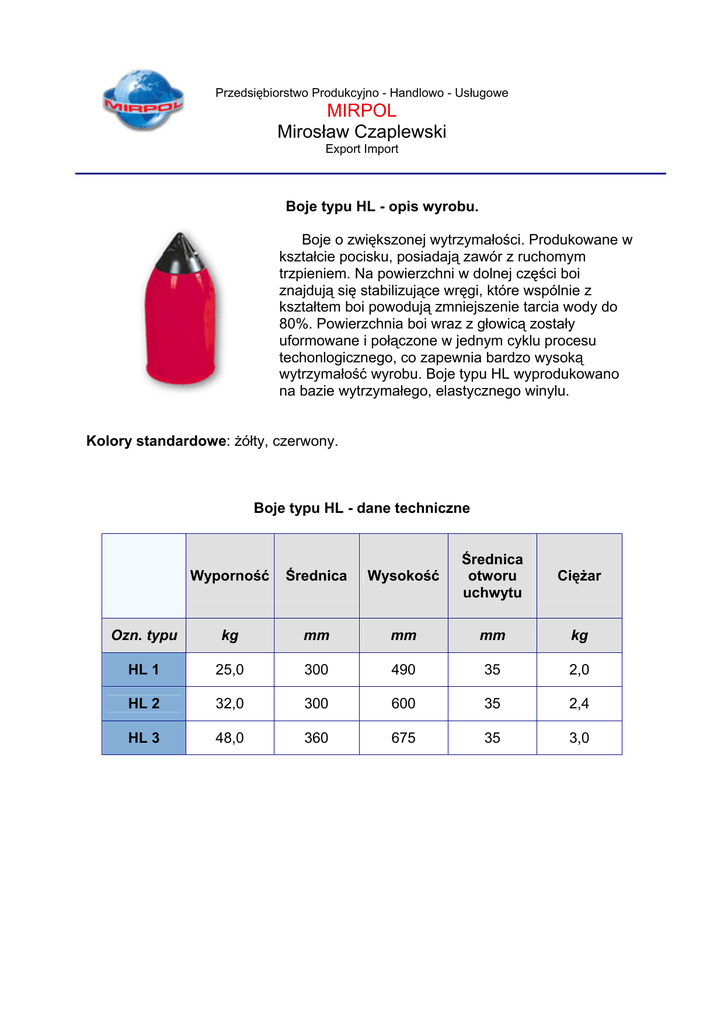 Przedsiębiorstwo Produkcyjno - Handlowo - Usługowe MIRPOL Mirosław Czaplewski Export Import Boje typu HL - opis wyrobu. Boje o zwiększonej wytrzymałości. Produkowane w kształcie pocisku, posiadają zawór z ruchomym trzpieniem. Na powierzchni w dolnej części boi znajdują się stabilizujące wręgi, które wspólnie z kształtem boi powodują zmniejszenie tarcia wody do 80%. Powierzchnia boi wraz z głowicą zostały uformowane i połączone w jednym cyklu procesu techonlogicznego, co zapewnia bardzo wysoką wytrzymałość wyrobu. Boje typu HL wyprodukowano na bazie wytrzymałego, elastycznego winylu. Kolory standardowe: żółty, czerwony. Boje typu HL - dane techniczne Wyporność Średnica Wysokość Średnica otworu uchwytu Ciężar Ozn. typu kg mm mm mm kg HL 1 25,0 300 490 35 2,0 HL 2 32,0 300 600 35 2,4 HL 3 48,0 360 675 35 3,0 Zasady użytkowania wyrobów POLYFORM. Głowica. Produkty POLYFORM charakteryzują się wzmocnioną głowicą w granatowym kolorze. Surowiec używany do jej produkcji jest bardzo wytrzymały i wystarczająco elastyczny do utrzymania dużego obciążenia. Ta kombinacja wytrzymałości oraz elastyczności stanowi o marce handlowej produkcji POLYFORM. Ważny jest także fakt, iż powierzchnia boi wraz z głowicą zostały połączone jednocześnie podczas technologicznego procesu formowania, który zapewnia bardzo wysoką wytrzymałość wyrobu. Zawory. Każdy wyrób POLYFORM zawiera plastykowy zawór. • Typ V20. Podczas napełnienia, trzpień w dolnej części zaworu pozwala na swobodną regulację dopływu powietrza. W celu zabezpieczenia odbijacza przed utratą powietrza, należy mocno zacisnąć trzpień zaworu. • Typ V30. Napełnianie należy wykonać bezpośrednio przez centralny otwór trzpienia zaworu, za pomocą ręcznej pompy lub sprężarki (średnica zaworu musi dokładnie pasować do węża pompy). Nie należy poruszać trzpieniem zaworu, jeśli nie jest wymagana regulacja ciśnienia. • Typ V40. Zawór został skonstruowany z możliwością łatwej regulacji ciśnienia. Nie zawiera trzpienia. Napełnianie. Produkty POLYFORM zaprojektowane są do napełniania od 0,15 do 0,20 bara w temperaturze 20°C. Przy eksploatacji w warunkach tropikalnych, napełnienie wynosi od 0,05 do 0,06 bara. W przypadku napełniania bez ciśnieniomierza, ścianki boi muszą być całkiem napięte. W napełnionym odbijaczu ścianka powinna ugiąć się około 0,65cm pod lekkim naciskiem ręki (przy eksploatacji w warunkach tropikalnych ugięcie wynosi około 1,5cm). Dane dotyczące maksymalnego ciśnienia umieszczono w opisie technicznym. Napełnienie odbijacza większą niż dopuszczalna ilością powietrza spowoduje jego uszkodzenie. Przechowywanie. W wyrobach przechowywanych przez dłuższy okres czasu, niezbędnie jest otwarcie kartonów oraz zaworów odbijaczy. Zaleca się także lekkie napełnienie odbijaczy. Przechowywane wyroby należy chronić przed zamrażaniem, nagrzewaniem do wysokich temperatur oraz światłem słonecznym. Czyszczenie. Można używać środków czyszczących do winylu, alkoholi mineralnych oraz zwykłej wody z mydłem. Silne środki chemiczne jak lakiery do polerowania lub aceton mogą nieodwracalnie uszkodzić wyroby niszcząc chemiczny skład powierzchni. Oznakowanie. Do oznaczenia mogą być wykorzystane farby przeznaczone do lśniących powierzchni z miękkiego PVC oraz marker wodoodporny. Cumowanie. Dla maksymalnego bezpieczeństwa, przy cumowaniu zaleca się wykorzystanie jedynie uchwytu na dolnej, podwodnej części boi. Typ boi należy dostosować do wagi obiektu, który musi utrzymać. Wymiary sztaby metalowej do cumowania oraz uchwytu, należy dostosować do rozmiaru i wagi jednostki pływającej, warunków pogodowych, prądów wodnych i wysokości fal na obszarze przeznaczonym do cumowania. W przypadku wątpliwości zaleca się konsultację ze specjalistą. P.P.H.U. MIRPOL 81-589 Gdynia, ul.Piołunowa 15, tel./fax +48 58 629 03 49 biuro handlowe: 81-017 Gdynia, ul.Janowska 18 tel. +48 58 664 06 16, 663 92 00, fax: +48 58 664 06 06 e-mail: [email protected] www.mirpol.gdynia.pl