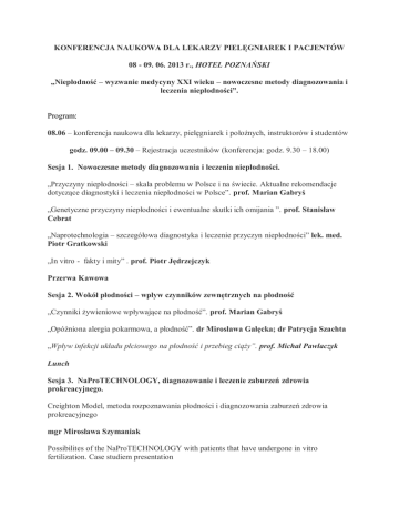 KONFERENCJA NAUKOWA DLA LEKARZY PIELĘGNIAREK I PACJENTÓW 08 - 09. 06. 2013 r., HOTEL POZNAŃSKI „Niepłodność – wyzwanie medycyny XXI wieku – nowoczesne metody diagnozowania i leczenia niepłodności”. Program: 08.06 – konferencja naukowa dla lekarzy, pielęgniarek i położnych, instruktorów i studentów godz. 09.00 – 09.30 – Rejestracja uczestników (konferencja: godz. 9.30 – 18.00) Sesja 1. Nowoczesne metody diagnozowania i leczenia niepłodności. „Przyczyny niepłodności – skala problemu w Polsce i na świecie. Aktualne rekomendacje dotyczące diagnostyki i leczenia niepłodności w Polsce”. prof. Marian Gabryś „Genetyczne przyczyny niepłodności i ewentualne skutki ich omijania ”. prof. Stanisław Cebrat „Naprotechnologia – szczegółowa diagnostyka i leczenie przyczyn niepłodności” lek. med. Piotr Gratkowski „In vitro - fakty i mity” . prof. Piotr Jędrzejczyk Przerwa Kawowa Sesja 2. Wokół płodności – wpływ czynników zewnętrznych na płodność „Czynniki żywieniowe wpływające na płodność”. prof. Marian Gabryś „Opóźniona alergia pokarmowa, a płodność”. dr Mirosława Gałęcka; dr Patrycja Szachta „Wpływ infekcji układu płciowego na płodność i przebieg ciąży”. prof. Michał Pawlaczyk Lunch Sesja 3. NaProTECHNOLOGY, diagnozowanie i leczenie zaburzeń zdrowia prokreacyjnego. Creighton Model, metoda rozpoznawania płodności i diagnozowania zaburzeń zdrowia prokreacyjnego mgr Mirosława Szymaniak Possibilites of the NaProTECHNOLOGY with patients that have undergone in vitro fertilization. Case studiem presentation Dr Philips O Dwyer Niepłodność jako wieloczynnikowa choroba przewlekła, diagnostyka i leczenie w NaProTECHNOLOGY lek. med. Maciej Barczentewicz Metody chirurgiczne w NaProTECHNOLOGY lek. med Piotr Gratkowski 09.06. 2013 Warsztaty praktyczne WYKŁAD OTWARTY 9.30 Dr n. med. Mirosława Galęcka – Zaburzenia ekosystemu pochwy jako potencjalna przyczyna niepłodności i poronień nawykowych – badanie VagiStatus 10.00 – 14.00 Warsztaty wewnętrzne dla lekarzy NaProTechnology. Dr Maciej Barczentewicz, Dr Philip O’Dwyer 10.00 – 14.00 Spotkanie zamknięte dla instruktorów CRMS Godz. 14.00 – 18.00 Zdrowie prokreacyjne Warsztat otwarty dla studentów Uniwersytetu Medycznego i innych Uczelni Wyższych w Poznaniu, dla pielęgniarek i położnych, dla nauczycieli NPR i osób zainteresowanych problematyką zdrowia prokreacyjnego 1. ABC Zdrowej Ciąży mgr Ewa Bielak 2. Wpływ odżywiania i zaburzeń mikroflory na zdrowie prokreacyjne dr n. biol. Patrycja Szachta 1. Antykoncepcja a zdrowie prokreacyjne. mgr Michał Cichocki 2. In vitro czy NaProTECHNOLOGY? Spojrzenie genetyka i neonatologa. prof. Małgorzata Cebrat, prof. Janusz Gadzinowski 1. Karta cyklu CrMS i NaProTECHNOLOGY w diagnozowaniu i leczeniu zaburzeń zdrowia prokreacyjnego. lek. med. Laura Grześkowiak, lek. med. Agnieszka Białecka 2. Panel dyskusyjny. Kierownikiem naukowym konferencji jest :prof. Marian Gabryś