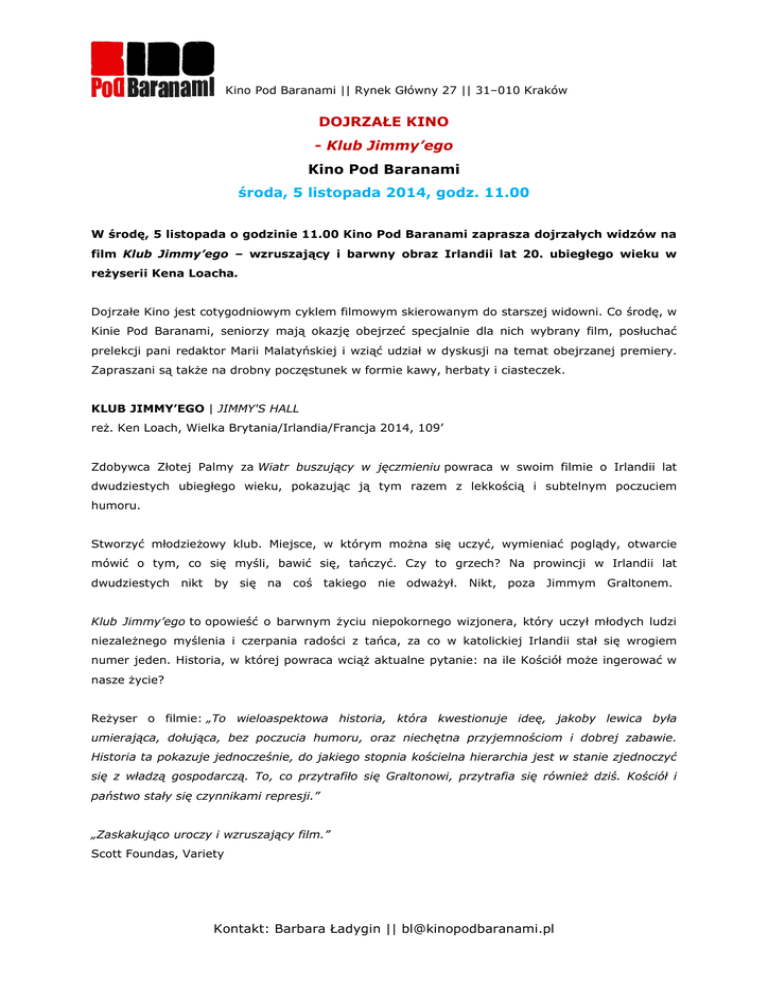 Kino Pod Baranami || Rynek Główny 27 || 31–010 Kraków DOJRZAŁE KINO - Klub Jimmy’ego Kino Pod Baranami środa, 5 listopada 2014, godz. 11.00 W środę, 5 listopada o godzinie 11.00 Kino Pod Baranami zaprasza dojrzałych widzów na film Klub Jimmy’ego – wzruszający i barwny obraz Irlandii lat 20. ubiegłego wieku w reżyserii Kena Loacha. Dojrzałe Kino jest cotygodniowym cyklem filmowym skierowanym do starszej widowni. Co środę, w Kinie Pod Baranami, seniorzy mają okazję obejrzeć specjalnie dla nich wybrany film, posłuchać prelekcji pani redaktor Marii Malatyńskiej i wziąć udział w dyskusji na temat obejrzanej premiery. Zapraszani są także na drobny poczęstunek w formie kawy, herbaty i ciasteczek. KLUB JIMMY’EGO | JIMMY'S HALL reż. Ken Loach, Wielka Brytania/Irlandia/Francja 2014, 109’ Zdobywca Złotej Palmy za Wiatr buszujący w jęczmieniu powraca w swoim filmie o Irlandii lat dwudziestych ubiegłego wieku, pokazując ją tym razem z lekkością i subtelnym poczuciem humoru. Stworzyć młodzieżowy klub. Miejsce, w którym można się uczyć, wymieniać poglądy, otwarcie mówić o tym, co się myśli, bawić się, tańczyć. Czy to grzech? Na prowincji w Irlandii lat dwudziestych nikt by się na coś takiego nie odważył. Nikt, poza Jimmym Graltonem. Klub Jimmy’ego to opowieść o barwnym życiu niepokornego wizjonera, który uczył młodych ludzi niezależnego myślenia i czerpania radości z tańca, za co w katolickiej Irlandii stał się wrogiem numer jeden. Historia, w której powraca wciąż aktualne pytanie: na ile Kościół może ingerować w nasze życie? Reżyser o filmie: „To wieloaspektowa historia, która kwestionuje ideę, jakoby lewica była umierająca, dołująca, bez poczucia humoru, oraz niechętna przyjemnościom i dobrej zabawie. Historia ta pokazuje jednocześnie, do jakiego stopnia kościelna hierarchia jest w stanie zjednoczyć się z władzą gospodarczą. To, co przytrafiło się Graltonowi, przytrafia się również dziś. Kościół i państwo stały się czynnikami represji.” „Zaskakująco uroczy i wzruszający film.” Scott Foundas, Variety Kontakt: Barbara Ładygin || [email protected] Kino Pod Baranami || Rynek Główny 27 || 31–010 Kraków „Ten film jest jak Footloose w Irlandii.” Eric Kohn, Indiewire Spotkania Dojrzałego Kina odbywają się co środę, w okolicach godziny 11.00. Uczestnicy cyklu prowadzą blog z recenzjami obejrzanych filmów: www.dojrzalekino.pl. Cykl zrealizowano przy wsparciu PISF. BILETY dla seniorów: tylko 12 zł Dojrzałe kino, jak dojrzałe wino – to pełnia smaku! PARTNERZY: Kontakt: Barbara Ładygin || [email protected]