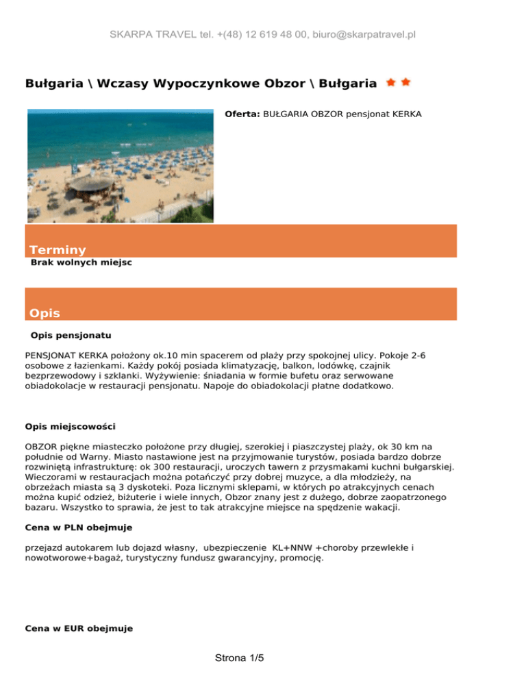 SKARPA TRAVEL tel. +(48) 12 619 48 00, [email protected] Bułgaria \ Wczasy Wypoczynkowe Obzor \ Bułgaria Oferta: BUŁGARIA OBZOR pensjonat KERKA Terminy Brak wolnych miejsc Opis Opis pensjonatu PENSJONAT KERKA położony ok.10 min spacerem od plaży przy spokojnej ulicy. Pokoje 2-6 osobowe z łazienkami. Każdy pokój posiada klimatyzację, balkon, lodówkę, czajnik bezprzewodowy i szklanki. Wyżywienie: śniadania w formie bufetu oraz serwowane obiadokolacje w restauracji pensjonatu. Napoje do obiadokolacji płatne dodatkowo. Opis miejscowości OBZOR piękne miasteczko położone przy długiej, szerokiej i piaszczystej plaży, ok 30 km na południe od Warny. Miasto nastawione jest na przyjmowanie turystów, posiada bardzo dobrze rozwiniętą infrastrukturę: ok 300 restauracji, uroczych tawern z przysmakami kuchni bułgarskiej. Wieczorami w restauracjach można potańczyć przy dobrej muzyce, a dla młodzieży, na obrzeżach miasta są 3 dyskoteki. Poza licznymi sklepami, w których po atrakcyjnych cenach można kupić odzież, biżuterie i wiele innych, Obzor znany jest z dużego, dobrze zaopatrzonego bazaru. Wszystko to sprawia, że jest to tak atrakcyjne miejsce na spędzenie wakacji. Cena w PLN obejmuje przejazd autokarem lub dojazd własny, ubezpieczenie KL+NNW +choroby przewlekłe i nowotworowe+bagaż, turystyczny fundusz gwarancyjny, promocję. Cena w EUR obejmuje Strona 1/5 SKARPA TRAVEL tel. +(48) 12 619 48 00, [email protected] 9 noclegów, wyżywienie 2 x dziennie, opiekę rezydenta. Dopłaty 1. Obowiązkowo płatna taksa klimatyczna: osoba dorosła 1 EUR/dzień, dzieci 2-12 lat 50% 2. Do pokoju 1 osobowego 80 EUR Zniżki W cenie uwzględniona PROMOCJĘ FIRST MINUTE: przy dojeździe autokarem – 100 zł / osoba przy dojeździe własnym – 50 zł / osoba 1. Dziecko do 2 lat płaci tylko płaci tylko 360 zł 2. Dziecko od 2 do 10 lat jako 3 i 4 osoba w pokoju płaci kwotę w złotych + 60% kwoty w EUR3. Dziecko od 10 do 16 lat jako 3 i 4 w pokoju płacą kwotę w złotych + 80% kwoty w EUR. 4. STAŁY KLIENT: obejmuje osoby korzystające trzeci kolejny rok z naszej oferty ! Uwagi organizatora 1.Kwota w złotych płatna jest w Polsce, kwota w EUR płatna w Bułgarii. 2.Przy dojeździe własnym, gdy potrzebna jest faktura na całość i przy zakupie ubezpieczenia od kosztów rezygnacji wtedy obowiązkowo równowartość kwoty w EUR płatna jest w Polsce. Kwota w EUR przeliczana jest na zł wg kursu NBP pieniądz sprzedaż z dnia ostatniej wpłaty. 3.W dniu wykupienia imprezy/ wpłaty zaliczki klient ma możliwość wykupienia dodatkowego ubezpieczenia od kosztów rezygnacji z imprezy zgodnie z Ogólnymi Warunkmi Ubezpieczenia KOSZTÓW IMPREZY TURYSTYCZNEJ w wysokości 3,3% jednak nie później niż 5 dni od dnia podpisania umowy. 4. Wycieczki fakultatywne organizowane są przez lokalne biura podróży. 5.Doba hotelowa rozpoczyna się o godz 14 i kończy o godz 9. 6. Miejsca i godziny odjazdów autokarów podano w rozkładzie jazdy 7. Potrzebny DOWÓD OSOBISTY lub PASZPORT ! Prosze pamiętać również o dokumencie dla dzieci. 8. Dla osób dojeżdżających do Krakowa możemy zarezerwować przednocleg w cenie od 100 zł. Uwagi przewoźnika 1.Transport na trasach antenowych w Polsce możliwy jest mikrobusem, autokarem klasy turystycznej, samochodem osobowym lub innym przewoźnikiem np. Polskim Busem, Luxbusem, PKP, PKS itp. Ewentualną zmianę godzin odjazdów podamy najpóźniej na 24 godziny Strona 2/5 SKARPA TRAVEL tel. +(48) 12 619 48 00, [email protected] przed odjazdem. Trasa połączeń na terenie kraju zależy od zgłoszeń z poszczególnych miast, co może spowodować, ze przejazd nie będzie realizowany najkrótszą z możliwych tras. 2. Na trasach poza granicami Polski transport odbywa się autokarami wyposażonymi w siedzenia uchylne, klimatyzację, toalety, video i nagłośnienie. Przy małej ilości osób, możliwość przewozu uczestników małym autobusem bez WC i mini baru, wtedy toalety na postojach płatne przez przewoźnika. 3. Podane godziny wyjazdów i przyjazdów mogą ulec zmianie z różnych przyczyn np. złe warunki drogowe, atmosferyczne, zwiększanie ruchu na drogach szczególnie w szczycie sezonu letniego i inne. 4. Prosimy o przybycie na miejsce zbiórki najpóźniej 15 minut przed planowaną godziną odjazdu. Miejsca w autokarze są przydzielane w kolejności podpisania umowy, a klienci o miejscach informowani są przez obsługę na miejscu zbiórki. W autokarze obowiązuje całkowity zakaz palenia papierosów oraz spożywania alkoholu. Osoby korzystające z samego przejazdu, powinny obowiązkowo ubezpieczyć się na czas pobytu. Przewoźnik gwarantuje tylko ubezpieczenie na czas przejazdu. Ramowy program imprezy 1 dzień – wyjazd z Polski wg rozkładu jazdy, przejazd przez Słowację (dla chętnych posiłek w cenie ok 5 EUR), Węgry, Serbię lub Rumunię. 2 dzień – przyjazd do Bułgarii w godzinach południowych, zakwaterowanie, nocleg, 3-10 dzień - WYPOCZYNEK, możliwość wykupioenia wycieczek fakultatywnych 11 dzień – wykwaterowanie z pokoi do godz 10:00, czas wolny, wyjazd w droge powrotną ok godz 12:00-14:00 czasu bułgarskiego, przejazd przez Bułgarię i Serbie lub Rumunię, 12 dzień – przejazd przez Węgry, Słowację (dla chetnych posiłek w cenie ok 5 EUR), przyjazd do Krakowa między godziną 14:00 a 18:00 Praktyczne informacje Najbliższa placówka dyplomatyczna: Konsulat RP w Warnie ul. Sławiańska 18, 9000 Warna tel. (00-3595) 260-92-12/13 Obowiązująca waluta 1 LEVA = 100 stotinek 1 EUR = ok 2 LEVA Czas wschodnioeuropejski + 1 godzina Wycieczki fakultatywne organizowane przez lokalne ISTAMBUŁ 1 dzień ok 70 EUR DELFINARIUM W WARNIE ok 35 EUR BURGAS-SOZOPOL-ROPOTAMO ok 25 EUR WIECZÓR BUŁGARSKI-NESSEBER ok 30 EUR Strona 3/5 SKARPA TRAVEL tel. +(48) 12 619 48 00, [email protected] FISH PICNIC ok 20 EUR WARNA – ALADIA MONASTIR ok 20 EUR AQUAPARK SŁONECZNY BRZEG ok 10 EUR Ceny nie zawierają biletów wstępu do zwie