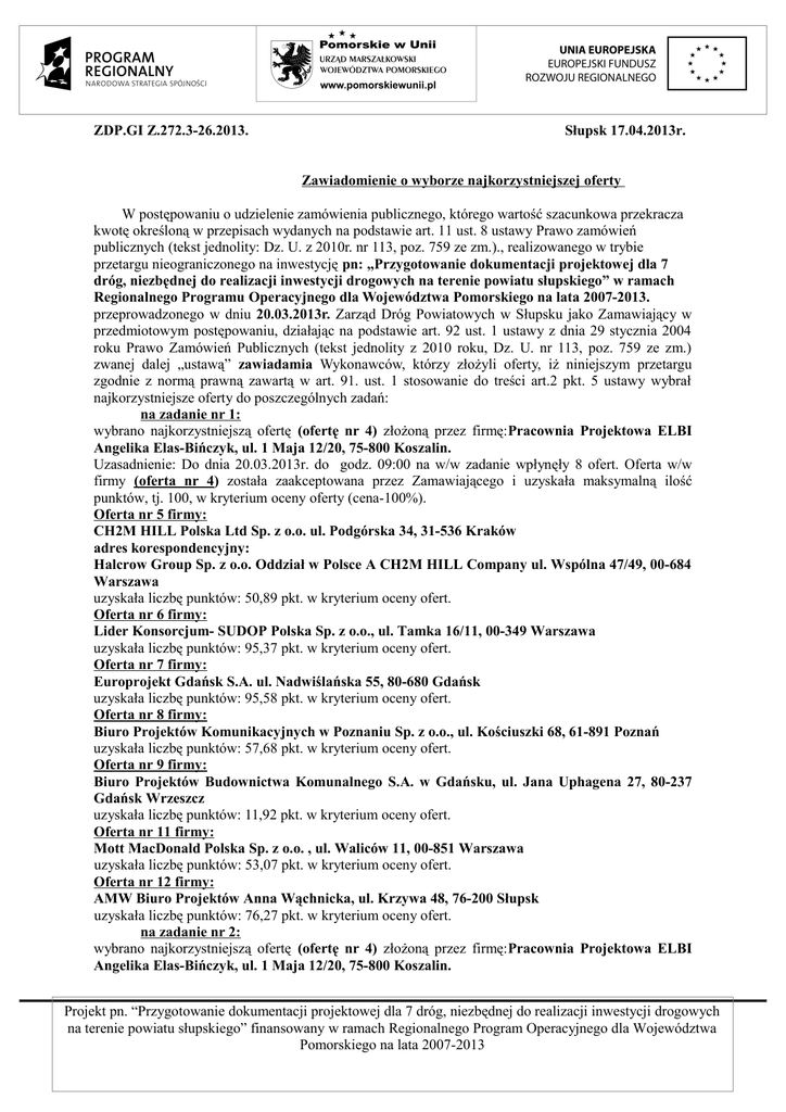 ZDP.GI Z.272.3-26.2013. Słupsk 17.04.2013r. Zawiadomienie o wyborze najkorzystniejszej oferty W postępowaniu o udzielenie zamówienia publicznego, którego wartość szacunkowa przekracza kwotę określoną w przepisach wydanych na podstawie art. 11 ust. 8 ustawy Prawo zamówień publicznych (tekst jednolity: Dz. U. z 2010r. nr 113, poz. 759 ze zm.)., realizowanego w trybie przetargu nieograniczonego na inwestycję pn: „Przygotowanie dokumentacji projektowej dla 7 dróg, niezbędnej do realizacji inwestycji drogowych na terenie powiatu słupskiego” w ramach Regionalnego Programu Operacyjnego dla Województwa Pomorskiego na lata 2007-2013. przeprowadzonego w dniu 20.03.2013r. Zarząd Dróg Powiatowych w Słupsku jako Zamawiający w przedmiotowym postępowaniu, działając na podstawie art. 92 ust. 1 ustawy z dnia 29 stycznia 2004 roku Prawo Zamówień Publicznych (tekst jednolity z 2010 roku, Dz. U. nr 113, poz. 759 ze zm.) zwanej dalej „ustawą” zawiadamia Wykonawców, którzy złożyli oferty, iż niniejszym przetargu zgodnie z normą prawną zawartą w art. 91. ust. 1 stosowanie do treści art.2 pkt. 5 ustawy wybrał najkorzystniejsze oferty do poszczególnych zadań: na zadanie nr 1: wybrano najkorzystniejszą ofertę (ofertę nr 4) złożoną przez firmę:Pracownia Projektowa ELBI Angelika Elas-Bińczyk, ul. 1 Maja 12/20, 75-800 Koszalin. Uzasadnienie: Do dnia 20.03.2013r. do godz. 09:00 na w/w zadanie wpłynęły 8 ofert. Oferta w/w firmy (oferta nr 4) została zaakceptowana przez Zamawiającego i uzyskała maksymalną ilość punktów, tj. 100, w kryterium oceny oferty (cena-100%). Oferta nr 5 firmy: CH2M HILL Polska Ltd Sp. z o.o. ul. Podgórska 34, 31-536 Kraków adres korespondencyjny: Halcrow Group Sp. z o.o. Oddział w Polsce A CH2M HILL Company ul. Wspólna 47/49, 00-684 Warszawa uzyskała liczbę punktów: 50,89 pkt. w kryterium oceny ofert. Oferta nr 6 firmy: Lider Konsorcjum- SUDOP Polska Sp. z o.o., ul. Tamka 16/11, 00-349 Warszawa uzyskała liczbę punktów: 95,37 pkt. w kryterium oceny ofert. Oferta nr 7 firmy: Europrojekt Gdańsk S.A. ul. Nadwiślańska 55, 80-680 Gdańsk uzyskała liczbę punktów: 95,58 pkt. w kryterium oceny ofert. Oferta nr 8 firmy: Biuro Projektów Komunikacyjnych w Poznaniu Sp. z o.o., ul. Kościuszki 68, 61-891 Poznań uzyskała liczbę punktów: 57,68 pkt. w kryterium oceny ofert. Oferta nr 9 firmy: Biuro Projektów Budownictwa Komunalnego S.A. w Gdańsku, ul. Jana Uphagena 27, 80-237 Gdańsk Wrzeszcz uzyskała liczbę punktów: 11,92 pkt. w kryterium oceny ofert. Oferta nr 11 firmy: Mott MacDonald Polska Sp. z o.o. , ul. Waliców 11, 00-851 Warszawa uzyskała liczbę punktów: 53,07 pkt. w kryterium oceny ofert. Oferta nr 12 firmy: AMW Biuro Projektów Anna Wąchnicka, ul. Krzywa 48, 76-200 Słupsk uzyskała liczbę punktów: 76,27 pkt. w kryterium oceny ofert. na zadanie nr 2: wybrano najkorzystniejszą ofertę (ofertę nr 4) złożoną przez firmę:Pracownia Projektowa ELBI Angelika Elas-Bińczyk, ul. 1 Maja 12/20, 75-800 Koszalin. Projekt pn. “Przygotowanie dokumentacji projektowej dla 7 dróg, niezbędnej do realizacji inwestycji drogowych na terenie powiatu słupskiego” finansowany w ramach Regionalnego Program Operacyjnego dla Województwa Pomorskiego na lata 2007-2013 Uzasadnienie: Do dnia 20.03.2013r. do godz. 09:00 na w/w zadanie wpłynęły 8 ofert. Oferta w/w firmy (oferta nr 4) została zaakceptowana przez Zamawiającego i uzyskała maksymalną ilość punktów, tj. 100, w kryterium oceny oferty (cena-100%). Oferta nr 2 firmy: Przedsiębiorstwo Wielobranżowe „FAWAL” Filip Walczak Sp. z o.o., 66-400 Gorzów Wielkopolski, ul. Kobylogórska 16a uzyskała liczbę punktów: 53,37 pkt. w kryterium oceny ofert. Oferta nr 5 firmy: CH2M HILL Polska Ltd Sp. z o.o. ul. Podgórska 34, 31-536 Kraków adres korespondencyjny: Halcrow Group Sp. z o.o. Oddział w Polsce A CH2M HILL Company ul. Wspólna 47/49, 00-684 Warszawa uzyskała liczbę punktów: 40 pkt. w kryterium oceny ofert. Oferta nr 6 firmy: Lider Konsorcjum- SUDOP Polska Sp. z o.o., ul. Tamka 16/11, 00-349 Warszawa uzyskała liczbę punktów: 60 pkt. w kryterium oceny ofert. Oferta nr 7 firmy: Europrojekt Gdańsk S.A. ul. Nadwiślańska 55, 80-680 Gdańsk uzyskała liczbę punktów: 73,06 pkt. w kryterium oceny ofert. Oferta nr 8 firmy: Biuro Projektów Komunikacyjnych w Poznaniu Sp. z o.o., ul. Kościuszki 68, 61-891 Poznań uzyskała liczbę punktów: 60 pkt. w kryterium oceny ofert. Oferta nr 11 firmy: Mott MacDonald Polska Sp. z o.o. , ul. Waliców 11, 00-851 Warszawa uzyskała liczbę punktów: 38,65 pkt. w kryterium oceny ofert. Oferta nr 12 firmy: AMW Biuro Projektów Anna Wąchnicka, ul. Krzywa 48, 76-200 Słupsk uzyskała liczbę punktów: 68,88 pkt. w kryterium oceny ofert. na zadanie nr 3: wybrano najkorzystniejszą ofertę (ofertę nr 4) złożoną przez firmę:Pracownia Projektowa ELBI Angelika Elas-Bińczyk, ul. 1 Maja 12/20, 75-800 Koszalin. Uzasadnienie: Do dnia 20.03.2013r. do godz. 09:00 na w/w zadanie wpłynęły 10 ofert. Oferta w/w firmy (oferta nr 4) została zaakceptowana przez Zamawiającego i uzyskała maksymalną ilość punktów, tj. 100, w kryterium oceny oferty (cena-100%). Oferta nr 2 firmy: Przedsiębiorstwo Wielobranżowe „FAWAL” Filip Walczak Sp. z o.o., 66-400 Gorzów Wielkopolski, ul. Kobylogórska 16a uzyskała liczbę punktów: 52,52 pkt. w kryterium oceny ofert. Oferta nr 5 firmy: CH2M HILL Polska Ltd Sp. z o.o. ul. Podgórska 34, 31-536 Kraków adres korespondencyjny: Halcrow Group Sp. z o.o. Oddział w Polsce A CH2M HILL Company ul. Wspólna 47/49, 00-684 Warszawa uzyskała liczbę punktów: 38,06 pkt. w kryterium oceny ofert. Oferta nr 6 firmy: Lider Konsorcjum- SUDOP Polska Sp. z o.o., ul. Tamka 16/11, 00-349 Warszawa uzyskała liczbę punktów: 54,08 pkt. w kryterium oceny ofert. Oferta nr 7 firmy: Europrojekt Gdańsk S.A. ul. Nadwiślańska 55, 80-680 Gdańsk uzyskała liczbę punktów: 70,05 pkt. w kryterium oceny ofer