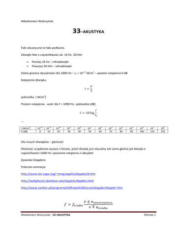Włodzimierz Wolczyński 33–AKUSTYKA Fale akustyczne to fale podłużne. Dźwięki fale o częstotliwości ok. 16 Hz -20 kHz • • Poniżej 16 Hz – infradźwięki Powyżej 20 kHz – ultradźwięki Dolna granica słyszalności dla 1000 Hz – Io = 10-12 W/m2 – poziom natężenia 0 dB Natężenie dźwięku jednostka [ W/m2] Poziom natężenia - wzór dla f = 1000 Hz ; jednostka [dB] 10 log --2 I [W/m ] P [dB] -12 10 0 -11 10 10 -10 10 20 -9 10 30 -8 10 40 -7 10 50 -6 10 60 -5 10 70 -4 10 80 -3 10 90 -2 -1 10 100 10 110 Dla innych dźwięków – głośność Głośność urządzenia wynosi n fonów, jeżeli dźwięk jest słyszalny tak samo głośno jak dźwięk o częstotliwości 1000 Hz i poziomie natężenia n decybeli Zjawisko Dopplera Polecam animacje: http://www.lon-capa.org/~mmp/applist/doppler/d.htm http://webphysics.davidson.edu/Applets/Applets.html http://www.zamkor.pl/programy%20fizyka%20liceum/doppler/doppler.htm źół Włodzimierz Wolczyński - 33–AKUSTYKA źół Strona 1 0 10 120 gdy obserwator się zbliża „+” gdy obserwator się oddala „-” gdy źródło dźwięku się zbliża „-” gdy źródło dźwięku się oddala „+” ZADANIA W zadaniach poniższych prędkość dźwięku w powietrzu przyjąć v = 336 m/s. Zadanie 1 Wrzucono do przepaści o głębokości 1 km wrzucono kamień . Po jakim czasie usłyszano dźwięk? Odpowiedź: Po około 17,1 s Zadanie 2 Wrzucono do przepaści kamień i usłyszano plusk po 5-ciu sekundach od chwili wyrzucenia. Jak głęboka była ta przepaść? Odpowiedź: 109,1 m Zadanie 3 Jaka powinna być długość pudła rezonansowego dla kamertonu wydającego dźwięk o częstotliwości f = 435 Hz? Odpowiedź: około 19 cm Zadanie 4 Do rury wypełnionej wodą zbliżono kamerton. Wzmocnienie dźwięku słyszano po raz pierwszy, gdy wysokość słupa powietrza w rurze wynosiła h1 = 25 cm. Jaka jest częstotliwość wydawanego dźwięku? Przy jakiej kolejnej wysokości słupa powietrza znów usłyszymy wzmocnienie dźwięku? Odpowiedź: f = 336 Hz ; h2 = 75 cm Zadanie 5 Prędkość dźwięku w strunie gitary wynosi około 3000 m/s. Jak i o ile herców zmieni się częstotliwość podstawowego dźwięku wydawanego przez strunę gitary, jeśli początkowa długość lo = 50 cm, palec przesunięto o 5 cm a. zwiększając jej długość b. zmniejszając jej długość Odpowiedź: a. zmniejszy się o ok. 273 Hz. B. zwiększy się o ok. 333 Hz Włodzimierz Wolczyński - 33–AKUSTYKA Strona 2 Zadanie 6 Do obserwatora zbliża się samochód z prędkością 108 km/h i wydaje dźwięk o częstotliwości f = 600 Hz. Oblicz skok częstotliwości jaki wystąpi w momencie minięcia obserwatora. Odpowiedź: Δf = -108 Hz Zadanie 7 Dwa samochody jadą po tej samej prostej drodze z prędkościami v1 = 20 m/s i v2 = 15 m/s. Pierwszy z nich zaczyna trąbić, a jego klakson wydaje dźwięk o częstotliwości f = 600 Hz. Jaką częstotliwość dźwięku usłyszy pasażer drugiego samochodu, jeżeli pojazdy: a. zbliżają się do siebie? Odpowiedź: a: 666 Hz; ź b: 541 Hz ; ź b. oddalają się od siebie? Zadanie 8 Do obserwatora zbliża się źródło dźwięku z przyspieszeniem a = 2 m/s2.Prędkość początkowa vo = 0. Jak długo źródło to może się zbliżać, aby zaszło zjawisko Dopplera? Odpowiedź: t < 168 s Zadanie 9 Poziom natężenia dźwięku o częstotliwości 1000 Hz wzrósł z 80 do 110 dB. Jak zmieniło się natężenie dźwięku? Odpowiedź: Wzrosło 1000 razy. Zadanie 10 Odczytaj z wykresu czułości ucha na stronie 4 i odpowiedz na pytania: a. Jaka jest w przybliżeniu częstotliwość dźwięku, na które ucho ludzkie jest najbardziej czułe? b. Jaki jest w przybliżeniu poziom natężenia dźwięku o głośności 60 fonów dla dźwięków o częstotliwości: 100 Hz, 1000 Hz, 3000 Hz, 10000 Hz? Odpowiedzi: a. b. 3000 Hz 80 dB ; 60 dB ; 55 dB ; 75 dB Włodzimierz Wolczyński - 33–AKUSTYKA Strona 3 Zadanie 11 Zjawisko Dopplera – strona 6 zadanie 3 http://www.voltwo.webd.pl/matura/fizyka/2007 http://www.voltwo.webd.pl/matura/fizyka/2007-rozrzerzony.pdf Włodzimierz Wolczyński - 33–AKUSTYKA AKUSTYKA Strona 4