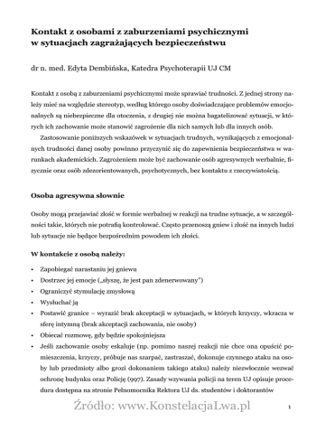 Kontakt z osobami z zaburzeniami psychicznymi w sytuacjach zagrażających bezpieczeństwu dr n. med. Edyta Dembińska, Katedra Psychoterapii UJ CM Kontakt z osobą z zaburzeniami psychicznymi może sprawiać trudności. Z jednej strony należy mieć na względzie stereotyp, według którego osoby doświadczające problemów emocjonalnych są niebezpieczne dla otoczenia, z drugiej nie można bagatelizować sytuacji, w których ich zachowanie może stanowić zagrożenie dla nich samych lub dla innych osób. Zastosowanie poniższych wskazówek w sytuacjach trudnych, wynikających z emocjonalnych trudności danej osoby powinno przyczynić się do zapewnienia bezpieczeństwa w warunkach akademickich. Zagrożeniem może być zachowanie osób agresywnych werbalnie, fizycznie oraz osób zdezorientowanych, psychotycznych, bez kontaktu z rzeczywistością. Osoba agresywna słownie Osoby mogą przejawiać złość w formie werbalnej w reakcji na trudne sytuacje, a w szczególności takie, których nie potrafią kontrolować. Często przenoszą gniew i złość na innych ludzi lub sytuacje nie będące bezpośrednim powodem ich złości. W kontakcie z osobą należy: • Zapobiegać narastaniu jej gniewu • Dostrzec jej emocje („słyszę, że jest pan zdenerwowany”) • Ograniczyć stymulację zmysłową • Wysłuchać ją • Postawić granice – wyrazić brak akceptacji w sytuacjach, w których krzyczy, wkracza w sferę intymną (brak akceptacji zachowania, nie osoby) • Obiecać rozmowę, gdy będzie spokojniejsza • Jeśli zachowanie osoby eskaluje (np. pomimo naszej reakcji nie chce ona opuścić pomieszczenia, krzyczy, próbuje nas szarpać, zastraszać, dokonuje czynnego ataku na osoby lub przedmioty albo grozi dokonaniem takiego ataku) należy niezwłocznie wezwać ochronę budynku oraz Policję (997). Zasady wzywania policji na teren UJ opisuje procedura dostępna na stronie Pełnomocnika Rektora UJ ds. studentów i doktorantów Źródło: www.KonstelacjaLwa.pl 1 Czego należy unikać: • Kłótni, podnoszenia głosu • Działania pod wpływem gniewu (zawstydzania lub ośmieszania osoby) • Naciskania na wyjaśnienie przyczyn agresywnego zachowania • Ignorowania sytuacji • Dotykania osoby. Osoba agresywna werbalnie i fizycznie Agresja może przejawiać się w różnych formach od zastraszania, słownych gróźb lub wyzwisk do agresji fizycznej skierowanej przeciw przedmiotom lub osobom. Jej przejawem mogą być również maile, telefony lub listy z pogróżkami. W kontakcie z osobą należy: • Zadbać o bezpieczeństwo swoje i innych – w sytuacji bezpośredniego zagrożenia (np. atak fizyczny na osoby lub bezpośrednie groźby jego dokonania, rozbijanie przedmiotów, inne formy niszczenia mienia), nakazać opuszczenie pomieszczenia innym osobom oraz niezwłocznie wezwać ochronę budynku oraz Policję (997). Zasady wzywania Policji na teren UJ opisuje procedura dostępna na stronie Pełnomocnika Rektora UJ ds. studentów i doktorantów • Pozostając z osobą do czasu przyjazdu służb porządkowych zapewnić sobie drogę ucieczki • Poprosić o asystę kogoś z personelu • Zachować spokój (może on korzystnie wpłynąć na osobę agresywną) • Wyrażać się jasno • Obiecać rozmowę, gdy będzie spokojniejsza • Podczas rozmowy postawą ciała wyrażać pewność siebie (kontakt wzrokowy, wyprostowana postawa). Czego należy unikać: • Pozostawania w sytuacji zagrożenia • Samotnego rozmawiania z osobą agresywną • Reagowania złością, gniewem lub agresją • • Dotykania osoby, wkraczania w jej sferę intymną 2 Źródło: www.KonstelacjaLwa.pl • Krytykowania osoby • Wykonywania nagłych ruchów. Osoba zdezorientowana, psychotyczna, bez kontaktu z rzeczywistością Myślenie psychotyczne objawia się brakiem prawidłowego kontaktu z rzeczywistością z powodu urojeń lub/i omamów oraz dezorganizacją zachowania (niezrozumiała, nielogiczna mowa, skrajnie dziwaczne zachowanie, wycofanie społeczne, nadmierna, nieuzasadniona podejrzliwość). W sytuacji kontaktu z osobą należy: • Wezwać pogotowie ratunkowe (tel. 999 lub 112), jeśli jej zachowanie jest zdezorganizowane, dziwaczne, a kontakt z rzeczywistością zakłócony przez omamy i/lub urojenia, ale bez zagrożenia dla jej zdrowia i życia lub innych osób • Wezwać policję (tel. 997*) i pogotowie ratunkowe (tel. 999 lub 112), jeśli z powodu zachowania osoby istnieje obawa o jego zdrowie lub życie lub zdrowie i życie innych osób • Rozmawiać z osobą wprost i konkretnie • Wyrazić swoje obawy związane z sytuacją i przekonanie, że potrzebuje pomocy • Zwracać uwagę na uczucia osoby, ale nie potwierdzać jej urojeniowych przekonań („Rozumiem, że boi się pan teraz i nie czuje się pan bezpiecznie”) • Ograniczyć stymulację zmysłową osoby • Koncentrować się jedynie na tym, co dzieje się w chwili obecnej • Poczekać do przyjazdu wezwanych służb. Czego należy unikać: • Wkraczania w sferę intymną osoby • Niepokojenia jej np. niepotrzebnymi pytaniami o sytuację • Dyskutowania z jej myślami urojeniowymi • Braku elastyczności w postępowaniu • Zalecania innym osobom (np. studentom), by zajęli się kolegą/koleżanką. * Zasady wzywania policji na teren UJ opisuje procedura dostępna na stronie Pełnomocnika Rektora UJ ds. studentów i doktorantów. Źródło: www.KonstelacjaLwa.pl 3