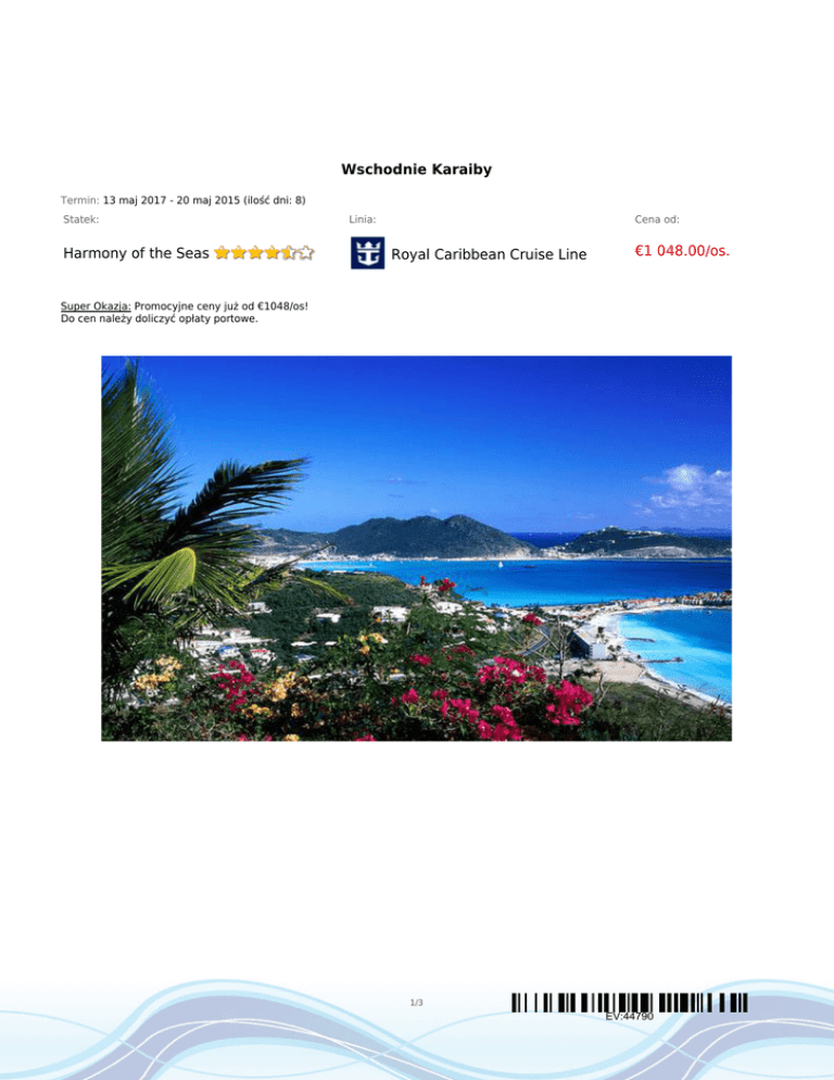 Wschodnie Karaiby Termin: 13 maj 2017 - 20 maj 2015 (ilość dni: 8) Statek: Harmony of the Seas Linia: Cena od: Royal Caribbean Cruise Line €1 048.00/os. Super Okazja: Promocyjne ceny już od €1048/os! Do cen należy doliczyć opłaty portowe. 1/3 EV:44790 TRASA REJSU Data Port Wpłynięcie Wypłynięcie sobota 13.05.2017 Fort Lauderdale, Floryda --:-- 16:30 dzień 2 niedziela 14.05.2017 Dzień na morzu --:-- --:-- dzień 3 poniedziałek 15.05.2017 Dzień na morzu --:-- --:-- dzień 4 wtorek 16.05.2017 Philipsburg 08:00 17:00 środa 17.05.2017 San Juan 07:00 15:00 czwartek 18.05.2017 Labadee 09:30 18:00 dzień 7 piątek 19.05.2017 Dzień na morzu --:-- --:-- dzień 8 sobota 20.05.2017 Fort Lauderdale, Floryda 06:15 --:-- dzień 1 dzień 5 dzień 6 Legenda Stany Zjednoczone Sint Maarten Portoryko Haiti Stany Zjednoczone CENNIK Cena katalogowa Cena promocyjna Kabina wewnętrzna od 6 654.81zł od 4 652.60zł Kabina zewnętrzna z oknem od 7 320.74zł od 5 118.74zł Kabina zewnętrzna z balkonem od 8 031.06zł od 5 615.97zł Suite (apartament) od 13 758.01zł od 9 624.84zł Kabina jednoosobowa na zapytanie 3 i 4 osoba dorosła w kabinie na zapytanie dziecko do 12 lat jako 3 i 4 osoba w kabinie na zapytanie Opłaty portowe 412.87zł Uwaga! Ceny za osobę w kabinie dwuosobowej. 2/3 EV:44790 Uwaga! Podane ceny są cenami orientacyjnymi i ulegają zmianom. Dokładne informacje na zapytanie. Cena zawiera: zakwaterowanie w kabinie wybranej kategorii; wyżywienie - 3 główne posiłki, przekąski między posiłkami, bufet lub przekąski o północy; napoje serwowane do śniadania i w bufetach samoobsługowych; serwis bagażowy podczas wejścia i zejścia ze statku; serwis kabinowy; korzystanie ze wszystkich urządzeń sportowo - rekreacyjnych znajdujących się na pokładzie statku (basen, jacuzzi, sala fitness, itp.); udział we wszystkich imprezach organizowanych na statku (przedstawienia w teatrze, koncerty, programy animacyjne itp.). Cena nie zawiera: kosztów dojazdu do portu; ewentualnych noclegów w hotelu przed/po rejsie i transferów; wycieczek fakultatywnych w trakcie rejsu; korzystania z barów, mini baru w kabinie oraz napojów zamawianych w restauracji; korzystania z punktów usługowych (fryzjer, pralnia, fotograf, salon piękności i odnowy biologicznej, internet) i wydatków osobistych; napiwków dla obsługi na statku (kwota uzależniona od długości rejsu); ubezpieczenia KL, NNW i bagaż, kosztów wiz (tam gdzie wymagane). 3/3 EV:44790