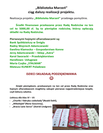 „Biblioteka Marzeń” ciąg dalszy realizacji projektu. Realizacja projektu „Biblioteka Marzeń” przebiega pomyślnie. Środki finansowe przekazane przez Radę Rodziców na ten cel to 5000,00 zł. Są to pieniądze rodziców, którzy opłacają składki na Radę Rodziców. Pierwszymi hojnymi ofiarodawcami są: Bank Spółdzielczy w Śmiglu Radny Wojciech Adamczewski Ewelina Klamecka – Gospodarstwo Konne Jerzy Adamczewski – Sklep „Astra” Karol Sworacki – Przedsiębiorstwo Handlowo- Usługowe Maria Czajka „STALMAR” Mateusz KUNERT Poladowo DZIECI SKŁADAJĄ PODZIĘKOWANIA Dzięki pieniądzom, przekazanym na ten cel przez Radę Rodziców oraz hojnym ofiarodawcom mogliśmy zakupić pierwsze najpotrzebniejsze książki, czyli lektury szkolne. Lektury dla klas IV – VI: „Charlle i fabryka czekolady”(Roald Dahl), „Mikołajek”(Rene Goscinny), „Bracia Lwie Serce” (Astrid Lindgren) Kolejne lektury były zakupione dla klas I-III: Grzegorz Kasdepke „Pozytywka” Wojciech Widłak „Pan Kuleczka” Grzegorz Kasdepke „Mity dla dzieci” oraz wiele książek do wypożyczania. Każda książka zakupiona przez Radę Rodziców opatrzona jest stemplem przygotowanym do tego celu. Kolejny planowany zakup to płyty DVD tematycznie związaną z realizacją podstawy programowej. Otrzymaliśmy również książki od Patrona Honorowego projektu „Biblioteka Marzeń” posła Ziemi Kościańskiej pana Wojciecha Ziemniaka: „966 Chrzest Polski”i Kronikę Sejmową, jest to wydania specjalne dotyczące Jubileuszu 1050-lecia Chrztu Polski, kalendarz Z Janem Pawłem II „Jesteście moja nadzieją”, 50 niesamowitych wojaży „Jantara” Racot. Ofiarodawca złożył dedykację.