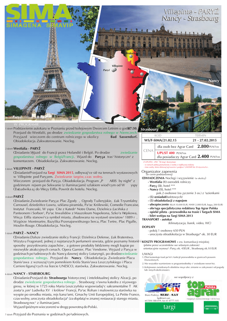 Villepinte - PARY¯ Nancy - Strasbourg Bruksela Villepinte Pary¿ Nancy Strasbourg Nancy Pary¿ 1 dzieñ 2 dzieñ 3 dzieñ W _ _PROGRAMIE _ _ _ _ _ _ _ _ _ _ _ _ _ _ _ _ _ _ _ _ _ Podstawienie autokaru w Poznaniu przed kolejowym Dworcem Letnim o godz. 07:30. Strasbourg Przejazd do Westfalii, po drodze zwiedzanie gospodarstwa rolnego w Niemczech. KOD Przyjazd wieczorm do centrum rolniczego w okolicy Bad Sassendorf. WS/F-SIMA/21.02.15 Obiadokolacja. Zakwaterowanie. Nocleg. Westfalia - PARY¯ zwiedzanie Œniadanie.W yjazd do Francji przez Holandiê i Belgiê. Po drodze gospodarstwa rolnego w Belgii/Francji. Wjazd do Pary¿a tras¹ historyczn¹ z komentarzem. Obiadokolacja. Zakwaterowanie. Nocleg. VILLEPINTE - PARY¯ Œniadanie.Przejazd na Targi SIMA 2015, odbywaj¹ce siê na terenach wystawowych w Villepinte pod Pary¿em. Zwiedzanie targów, czas wolny. Wieczorem przejazd do Pary¿a. Obiadokolacja. Program „P ARIS by night” z godzinnym rejsem po Sekwanie (z iluminacjami) szlakiem wiod¹cym od W yspy Œw .Ludwika a¿ do Wie¿y Eiffla. Powrót do hotelu. Nocleg. CENA TERMIN 21 - 27.02.2015 dla osob bez Agrar Card 2.800 PLN/1os UPUST 400 PLN/1os dla posiadaczy Agrar Card 2.400 PLN/1os Z UPUSTU - ZNI¯KI mog¹ skorzystaæ: - w ramach jednej prenumeraty 2 osoby z najbli¿szej rodziny - inne osoby, które dokonaj¹zg³oszenia i podpisz¹ UMOWÊ do 30 stycznia b.r . Organizator zapewnia (w cenie podstawowej) ŒWIADCZENIA- Noclegi i wy¿ywienie (w okolicy) - Westfalia (1) oœrodek rolniczy - Pary¿ (3), hotel *** - Nancy (1), hotel *** pok.2 osobowe (na ¿yczenie 3 os.) z ³azienkami 4 dzieñ PARY¯ - (5) œniadañ(bufetowych) - (5) obiadokolacji z napojem Œniadanie.Zwiedzanie Pary¿a: Plac Zgody , Ogrody T uileryjskie, £uk Tryumfalny - ubezpieczenie (KLiA 10.000 EUR, NNW 2.000 EUR, baga¿ 200 EUR) Carrousel, dziedziñce Luwru, szklana piramida, Pa³ac Królewski, Comedie Francaise, - obs³uga specjalistyczna redaktora Top Agrar Polska Instytut Francuski, W yspa Cite z Katedr¹ Notre Dame, Dzielnica £aciñska z - opiekê pilota - przewodnika na trasie i Targach SIMA Panteonem i Sorbon¹, Pa³ac Inwalidów z Mauzoleum Napoleona, Szko³a Wojskowa, - bilet wstêpu na Targi SIMA 2013 Wie¿a Eiffla stanowi¹ca symbol miasta, zbudowana na wystawê œwiatow¹ 1889 r . TRANSPORT - autokar Wzgórze Montmartre, Bazylika Przenajœwiêtszego Serca, Plac Tertre, Plac Pigalle, (klimatyzacja, barek, video, WC) Moulin-Rouge. Obiadokolacja. Nocleg. DOP£ATY - pokój 1 osobowy 650 PLN 5 dzieñ PARY¯ - NANCY - uroczysta obiadokolacja w Strasburgu* ok. 30 EUR Œniadanie.Dalsze zwiedzanie stolicy Francji: Dzielnica Defense, £uk Braterstwa. Wizyta u Fragonard, jednej z najstarszych perfumerii œwiata, gdzie poznamy historiê i KOSZTY PROGRAMOWE + ew. komunikacji miejskiej (p³atne przez uczestników we w³asnym zakresie) sposoby pozyskiwania zapachów , a gotowe produkty bêdziemy mogli kupiæ po orientacyjnie wynosz¹: Pary¿ ok. 45EUR , Strasbourg ok.10 EUR niezwykle atrakcyjnych cenach. Opera Garnier, Plac Vendome. Wyjazd z Pary¿a w godzinach po³udniowych do Nancy, dawnej stolicy Lotaryngii, po drodzezwiedzanie UWAGI 1. Pilot komentuje trasê pe³ni¹c funkcjê przewodnika w granicach prawem gospodarstwa rolnego. Przyjazd do Nancy. Obiadokolacja. Zwiedzanie Placu Dozwolonych. Stanis³awa z wzruszaj¹cym pomnikiem Króla Stanis³awa Leszczyñskiego i Placu 2. Nie wszystkie wymienione w programieobiekty s¹ zwiedzane wewn¹trz. Carriere figuruj¹cych na liœcie UNESCO, starówka. Zakwaterowanie. Nocleg. 3. Kolejnoœæ zwiedzanych obiektów mo¿e ulec zmianie w zale¿noœci od pogody lub innych okolicznoœci. 6 dzieñ 7 dzieñ NANCY - STARSBOURG Œniadanie.Przejazd do Strasbourga historycznej i intelektualnej stolicy Alzacji, po drodze zwiedzanie gospodarstwa rolnego . Strasbourg: s³awna katedra z ró¿owego gresu, w której w 1725 roku Maria Leszczyñska wypowiadaj¹c sakramentalne T AK zosta³a ¿on¹ Ludwika XV i królow¹ Francji, Pa³ac Rohan i malownicza starówka na wyspie po œrodku miasta, rejs kana³ami, Gmachy Unii Europejskiej, La Petite France, czas wolny, uroczysta obiadokolacja* (za dop³at¹) w znanej restauracji starego miasta. Strasbourg noc¹ z iluminacjami. Wyjazd (póŸnym wieczorem) w drogê powrotn¹ do Polski. Przyjazd do Poznania w godzinach po³udniowych. we wspó³pracy z ROK ZA£. 1990 ROK ZA£. 1990 Biuro Podró¿y MERI - SAN bp@meri-san tel.504-188-019, fax 61 8777-105 targi Biuro Podró¿y MERI - SAN