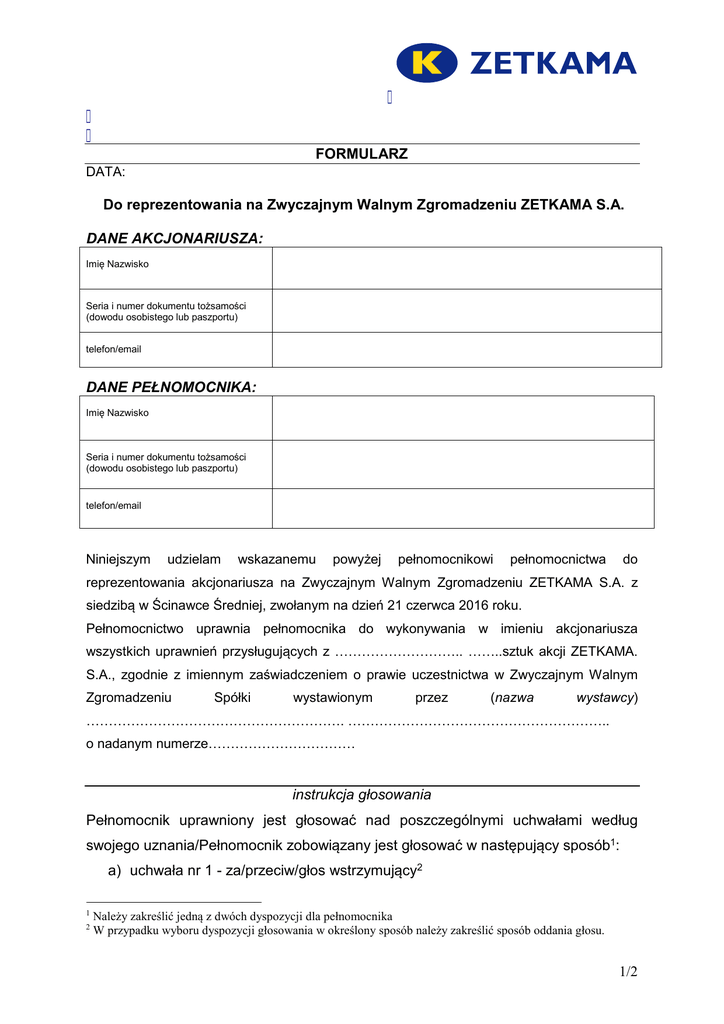 FORMULARZ DATA: Do reprezentowania na Zwyczajnym Walnym Zgromadzeniu ZETKAMA S.A. DANE AKCJONARIUSZA: Imię Nazwisko Seria i numer dokumentu tożsamości (dowodu osobistego lub paszportu) telefon/email DANE PEŁNOMOCNIKA: Imię Nazwisko Seria i numer dokumentu tożsamości (dowodu osobistego lub paszportu) telefon/email Niniejszym udzielam wskazanemu powyżej pełnomocnikowi pełnomocnictwa do reprezentowania akcjonariusza na Zwyczajnym Walnym Zgromadzeniu ZETKAMA S.A. z siedzibą w Ścinawce Średniej, zwołanym na dzień 21 czerwca 2016 roku. Pełnomocnictwo uprawnia pełnomocnika do wykonywania w imieniu akcjonariusza wszystkich uprawnień przysługujących z ……………………….. ……..sztuk akcji ZETKAMA. S.A., zgodnie z imiennym zaświadczeniem o prawie uczestnictwa w Zwyczajnym Walnym Zgromadzeniu Spółki wystawionym przez (nazwa wystawcy) …………………………………………………. ………………………………………………….. o nadanym numerze…………………………… instrukcja głosowania Pełnomocnik uprawniony jest głosować nad poszczególnymi uchwałami według swojego uznania/Pełnomocnik zobowiązany jest głosować w następujący sposób1: a) uchwała nr 1 - za/przeciw/głos wstrzymujący2 1 2 Należy zakreślić jedną z dwóch dyspozycji dla pełnomocnika W przypadku wyboru dyspozycji głosowania w określony sposób należy zakreślić sposób oddania głosu. 1/2 b) uchwała nr 2 - za/przeciw/głos wstrzymujący c) uchwała nr 3 - za/przeciw/głos wstrzymujący d) uchwała nr 4 - za/przeciw/głos wstrzymujący e) uchwała nr 5 - za/przeciw/głos wstrzymujący f) uchwała nr 6 - za/przeciw/głos wstrzymujący g) uchwała nr 7 - za/przeciw/głos wstrzymujący h) uchwała nr 8 - za/przeciw/głos wstrzymujący i) uchwała nr 9 - za/przeciw/głos wstrzymujący j) uchwała nr 10 - za/przeciw/głos wstrzymujący k) uchwała nr 11 - za/przeciw/głos wstrzymujący l) uchwała nr 12 - za/przeciw/głos wstrzymujący m) uchwała nr 13 - za/przeciw/głos wstrzymujący n) uchwała nr 14 - za/przeciw/głos wstrzymujący o) uchwała nr 15 - za/przeciw/głos wstrzymujący p) uchwała nr 16 - za/przeciw/głos wstrzymujący q) uchwała nr 17 - za/przeciw/głos wstrzymujący r) uchwała nr 18 - za/przeciw/głos wstrzymujący s) uchwała nr 19 - za/przeciw/głos wstrzymujący t) uchwała nr 20 - za/przeciw/głos wstrzymujący Świadom konsekwencji karnych składania fałszywych oświadczeń potwierdzam, że wskazane powyżej informacje są zgodne ze stanem faktycznym. PODPIS AKCJONARIUSZA 2/2