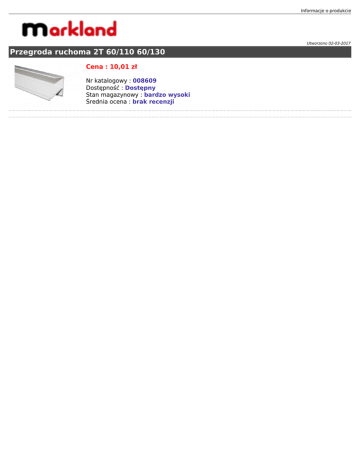 Informacje o produkcie Utworzono 02-03-2017 Przegroda ruchoma 2T 60/110 60/130 Cena : 10,01 zł Nr katalogowy : 008609 Dostępność : Dostępny Stan magazynowy : bardzo wysoki Średnia ocena : brak recenzji