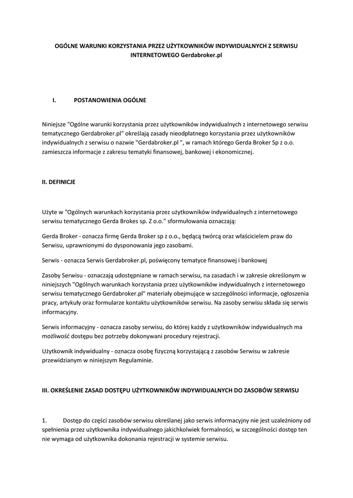 OGÓLNE WARUNKI KORZYSTANIA PRZEZ UŻYTKOWNIKÓW INDYWIDUALNYCH Z SERWISU INTERNETOWEGO Gerdabroker.pl I. POSTANOWIENIA OGÓLNE Niniejsze "Ogólne warunki korzystania przez użytkowników indywidualnych z internetowego serwisu tematycznego Gerdabroker.pl" określają zasady nieodpłatnego korzystania przez użytkowników indywidualnych z serwisu o nazwie "Gerdabroker.pl ", w ramach którego Gerda Broker Sp z o.o. zamieszcza informacje z zakresu tematyki finansowej, bankowej i ekonomicznej. II. DEFINICJE Użyte w "Ogólnych warunkach korzystania przez użytkowników indywidualnych z internetowego serwisu tematycznego Gerda Brokes sp. Z o.o." sformułowania oznaczają: Gerda Broker - oznacza firmę Gerda Broker sp z o.o., będącą twórcą oraz właścicielem praw do Serwisu, uprawnionymi do dysponowania jego zasobami. Serwis - oznacza Serwis Gerdabroker.pl, poświęcony tematyce finansowej i bankowej Zasoby Serwisu - oznaczają udostępniane w ramach serwisu, na zasadach i w zakresie określonym w niniejszych "Ogólnych warunkach korzystania przez użytkowników indywidualnych z internetowego serwisu tematycznego Gerdabroker.pl" materiały obejmujące w szczególności informacje, ogłoszenia pracy, artykuły oraz formularze kontaktu użytkowników serwisu. Na zasoby serwisu składa się serwis informacyjny. Serwis informacyjny - oznacza zasoby serwisu, do której każdy z użytkowników indywidualnych ma możliwość dostępu bez potrzeby dokonywani procedury rejestracji. Użytkownik indywidualny - oznacza osobę fizyczną korzystającą z zasobów Serwisu w zakresie przewidzianym w niniejszym Regulaminie. III. OKREŚLENIE ZASAD DOSTĘPU UŻYTKOWNIKÓW INDYWIDUALNYCH DO ZASOBÓW SERWISU 1. Dostęp do części zasobów serwisu określanej jako serwis informacyjny nie jest uzależniony od spełnienia przez użytkownika indywidualnego jakichkolwiek formalności, w szczególności dostęp ten nie wymaga od użytkownika dokonania rejestracji w systemie serwisu. 2. Gerda Broker sp. Z o.o. zaleca używanie następujących przeglądarek do korzystania z Serwisu: MS Internet Explorer od 8.0, - Firefox od 3.0, - Chrome od 10.0, - Opera od 10.0. -Google Chrom Systemy informatyczne Użytkowników Indywidualnych powinny mieć włączoną obsługę cookies i włączony Javascript. IV. ZOBOWIĄZANIA Gerda Broker Sp. Z o.o. Gerda broker Sp z o.o. zapewnia Użytkownikom indywidualnym nieodpłatny dostęp do zasobów serwisu informacyjnego na czas nieoznaczony. V. ZOBOWIĄZANIA UŻYTKOWNIKA INDYWIDUALNEGO 1. Użytkownik zobowiązany jest do korzystania z serwisu zgodnie z przepisami prawa, postanowieniami niniejszych "Ogólnych warunków korzystania przez użytkowników indywidualnych z internetowego serwisu tematycznego Gerdabroker.pl" oraz dobrymi obyczajami. 2. Użytkownik jest uprawniony do korzystania z zasobów serwisu wyłącznie na własny użytek osobisty. Oznacza to w szczególności, iż w odniesieniu do danych oraz wszelkich innych materiałów zawartych w zasobach serwisu, zarówno takich które podlegają ochronie na gruncie prawa autorskiego, jak i takich które takiej ochronie nie podlegają, nie jest dopuszczalne wykorzystywanie powyższych materiałów w celu prowadzenia przez użytkownika działalności komercyjnej. VI. ODPOWIEDZIALNOŚĆ STRON 1. Gerda broker Sp z o.o. oświadcza, że materiały i informacje składające się na zasoby serwisu, są zbierane i redagowane z należytą starannością. Przedstawione informacje nie stanowią oferty w rozumieniu art. 71 k.c Kodeksu Cywilnego (Dz. U. z 1964r. Nr 16, poz. 93). Gerda Broker Sp. Z o.o. nie ponosi również odpowiedzialności za decyzje użytkownika podjęte w oparciu o informacje uzyskane w wyniku korzystania z zasobów serwisu. 2. Użytkownik ponosi pełną odpowiedzialność w stosunku do osób trzecich za treść podanych przez siebie informacji, jak i umieszczanych w serwisie tekstów. 3. Gerda broker Sp z o.o. nie odpowiada ponadto za przypadki braku dostępności zasobów serwisu zaistniałe w związku z awarią systemu łączności telekomunikacyjnej oraz za inne skutki wadliwego działania łączy telekomunikacyjnych i szkód przez nie wywołanych. VII. PRZETWARZANIE DANYCH OSOBOWYCH UŻYTKOWNIKÓW SERWISU 1. Dane osobowe Użytkownika przetwarzane są na podstawie zgody wyrażonej przez osobę, której dane dotyczą, poprzez odznaczenie odpowiedniego okna na formularzu rejestracyjnym. 2. Dane osobowe Użytkownika przetwarzane są w celach polegających na prowadzeniu doradztwa finansowego, w szczególności na oferowaniu optymalnych form inwestowania środków finansowych oraz pomocy w wyborze najkorzystniejszej oferty kredytowej, zgodnie z ustawą z dnia 29 sierpnia 1997 r. o ochronie danych osobowych (t. j. Dz. U. z 2002 r. Nr 101, poz. 926 ze zm.). Administratorem danych jest Gerda broker Sp z o.o. z siedzibą w Warszawie Al. Jerozolimskie 4200-024 Warszawa. Przedmiotowe dane osobowe są zbierane w celach polegających na prowadzeniu doradztwa finansowego, w szczególności na oferowaniu optymalnych form inwestowania środków finansowych oraz pomocy w wyborze najkorzystniejszej oferty kredytowej, a także w calach archiwalnych i statystycznych. Ich podanie jest dobrowolne, a każda osoba ma prawo dostępu do treści swoich danych oraz ich poprawiania. Dane osobowe nie będą udostępniane innym podmiotom. 4. Na podstawie art. 7 pkt 5 ustawy o ochronie danych osobowych, Użytkownik w każdym czasie ma prawo odwołania zgody na przetwarzanie jego danych osobowych przez Administratora Danych. Skorzystanie z tego prawa jest realizowane poprzez wysłanie pocztą elektroniczną na adres [email protected] stosownego żądania wraz z podaniem imienia i nazwiska Użytkownika. 5. Użytkownik poprzez zaznaczenie odpowiedniego okna w formularzu rejestracyjnym, może odmówić lub wyrazić zgodę na otrzymywanie informacji handlowej za pomocą środków komunikacji elektronicznej, zgodnie z ustawą z dnia 18 lipca 2002 r. o świ