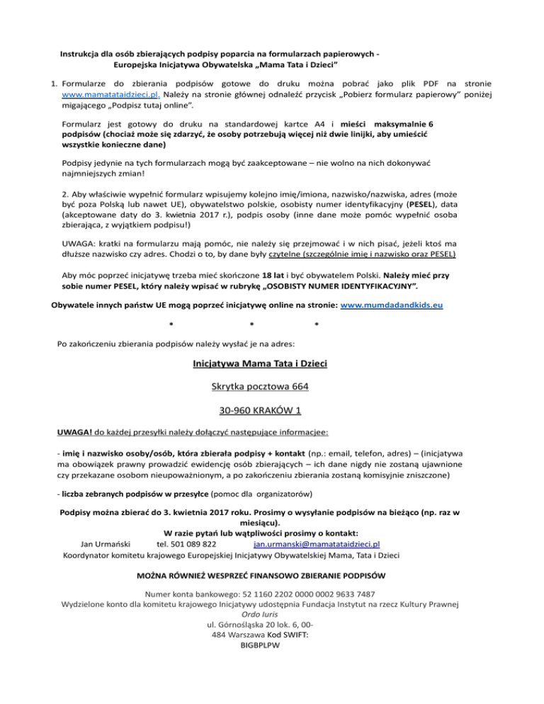 Instrukcja dla osób zbierających podpisy poparcia na formularzach papierowych Europejska Inicjatywa Obywatelska „Mama Tata i Dzieci” 1. Formularze do zbierania podpisów gotowe do druku można pobrać jako plik PDF na stronie www.mamatataidzieci.pl. Należy na stronie głównej odnaleźć przycisk „Pobierz formularz papierowy” poniżej migającego „Podpisz tutaj online”. Formularz jest gotowy do druku na standardowej kartce A4 i mieści maksymalnie 6 podpisów (chociaż może się zdarzyć, że osoby potrzebują więcej niż dwie linijki, aby umieścić wszystkie konieczne dane) Podpisy jedynie na tych formularzach mogą być zaakceptowane – nie wolno na nich dokonywać najmniejszych zmian! 2. Aby właściwie wypełnić formularz wpisujemy kolejno imię/imiona, nazwisko/nazwiska, adres (może być poza Polską lub nawet UE), obywatelstwo polskie, osobisty numer identyfikacyjny (PESEL), data (akceptowane daty do 3. kwietnia 2017 r.), podpis osoby (inne dane może pomóc wypełnić osoba zbierająca, z wyjątkiem podpisu!) UWAGA: kratki na formularzu mają pomóc, nie należy się przejmować i w nich pisać, jeżeli ktoś ma dłuższe nazwisko czy adres. Chodzi o to, by dane były czytelne (szczególnie imię i nazwisko oraz PESEL) Aby móc poprzeć inicjatywę trzeba mieć skończone 18 lat i być obywatelem Polski. Należy mieć przy sobie numer PESEL, który należy wpisać w rubrykę „OSOBISTY NUMER IDENTYFIKACYJNY”. Obywatele innych państw UE mogą poprzeć inicjatywę online na stronie: www.mumdadandkids.eu * * * Po zakończeniu zbierania podpisów należy wysłać je na adres: Inicjatywa Mama Tata i Dzieci Skrytka pocztowa 664 30-960 KRAKÓW 1 UWAGA! do każdej przesyłki należy dołączyć następujące informacjee: - imię i nazwisko osoby/osób, która zbierała podpisy + kontakt (np.: email, telefon, adres) – (inicjatywa ma obowiązek prawny prowadzić ewidencję osób zbierających – ich dane nigdy nie zostaną ujawnione czy przekazane osobom nieupoważnionym, a po zakończeniu zbierania zostaną komisyjnie zniszczone) - liczba zebranych podpisów w przesyłce (pomoc dla organizatorów) Podpisy można zbierać do 3. kwietnia 2017 roku. Prosimy o wysyłanie podpisów na bieżąco (np. raz w miesiącu). W razie pytań lub wątpliwości prosimy o kontakt: Jan Urmański tel. 501 089 822 [email protected] Koordynator komitetu krajowego Europejskiej Inicjatywy Obywatelskiej Mama, Tata i Dzieci MOŻNA RÓWNIEŻ WESPRZEĆ FINANSOWO ZBIERANIE PODPISÓW Numer konta bankowego: 52 1160 2202 0000 0002 9633 7487 Wydzielone konto dla komitetu krajowego Inicjatywy udostępnia Fundacja Instytut na rzecz Kultury Prawnej Ordo Iuris ul. Górnośląska 20 lok. 6, 00484 Warszawa Kod SWIFT: BIGBPLPW