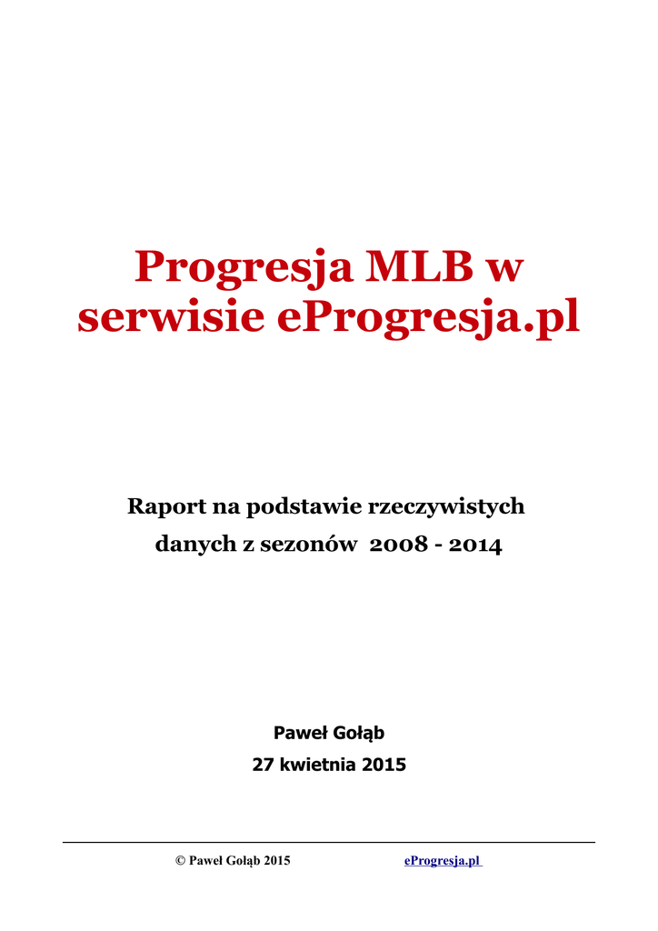 Progresja MLB w serwisie eProgresja.pl Raport na podstawie rzeczywistych danych z sezonów 2008 - 2014 Paweł Gołąb 27 kwietnia 2015 © Paweł Gołąb 2015 eProgresja.pl Baseball to jeden z najbardziej popularnych sportów w USA. Niewiele osób interesuje się tą dyscypliną w Polsce. Warto to zrobić chociażby z tego względu, że jest to jedna z najlepszych dyscyplin do zarabiania na zakładach bukmacherskich z wykorzystaniem progresji. W tym raporcie znajdziesz podsumowanie progresji w MLB, czyli amerykańskiej lidze baseballa. Podsumowanie to sporządziłem na podstawie rzeczywistych progresji użytkowników serwisu eProgresja.pl, prowadzonych z wykorzystaniem Menadżera Progresji dla baseballa. Z raportu dowiesz się, jak dużo zarabiają użytkownicy serwisu na progresji MLB, które sposoby gry i drużyny są najbardziej zyskowne oraz ile najczęściej trwają takie progresje. Zapraszam do lektury. Zyski użytkowników Użytkownicy serwisu eProgresja.pl od 2008 roku mają możliwość prowadzenia progresji MLB z pomocą dedykowanej do tego celu aplikacji internetowej - Menadżer Baseball. Od tego momentu do chwili obecnej, łączny zysk wszystkich użytkowników serwisu na progresji MLB wyniósł 575 301,01 zł (pięćset siedemdziesiąt pięc złotych i jeden grosz). Sumę zysków w poszczególnych sezonach znajdziesz w tabeli 1. Sezon Łączny zysk [PLN] 2008 5 794,98 2009 11 454,70 2010 40 046,06 2011 190 769,96 2012 66 837,32 2013 182 238,24 2014 78 163,75 Razem 575 305,01 Tabela 1: Zyski użytkowników w kolejnych sezonach Jak widzisz, w każdym kolejnym sezonie użytkownicy serwisu osiągnęli znączycy zysk. Oczywiście nie wszyscy użytkownicy mają taki sam udział w łącznym zysku. Zyski najlepszych są znacznie wyższe od pozostałych, ze względu na zaangażowanie znacznie wyższego kapitału. Przeciętny zysk użytkownika, mierzony medianą, został przedstawiony w tabeli 2. © Paweł Gołąb 2015 eProgresja.pl Sezon Przeciętny zysk [PLN] 2008 46,22 2009 52,5 2010 92,5 2011 120,36 2012 80,76 2013 59,05 2014 105,00 Tabela 2: Przeciętny zysk użytkownika w kolejnych sezonach Niestety nie wszyscy osiągają pozytywne wyniki z progresji w baseballu. Zdarzają się użytkownicy kończący sezon z negatywnym bilansem, ale są oni w zdecydowanej mniejszości. Ogromna większość osób prowadzących progresje MLB w serwisie, faktycznie zarabiania na tym. Poniżej znajdziesz tabelę przedstawiającą procent użytkowników, który osiągnęli zysk w poszczególnych sezonach. Sezon Zarabiający użytkownicy [%] 2008 100,00 2009 83,72 2010 78,95 2011 84,74 2012 79,79 2013 83,72 2014 82,35 Średnio 84,75 Tabela 3: Procent zarabiających użytkowników w kolejnych sezonach Poza premierowym sezonem, w którym wszyscy użytkownicy osiągnęli zysk, w kolejnych sezonach zarabiających użytkowników było mniej, lecz również bardzo wiele. Średnia na poziomie 84,75% jest naprawdę znakomita. Dla porównania w najbardziej popularnej progresji w piłce nożnej, zyski osiąga około 75% użytkowników. Wynika z tego, zapewne trochę zaskakujący wniosek, że większe szanse na zyski daje progresja w MLB niż w piłce nożnej. © Paweł Gołąb 2015 eProgresja.pl Dlaczego tak się dzieje? Na pewno nie z większej znajomości baseballa niż piłki nożnej. Na piłce zna się w naszym kraju przecież każdy :) Wynika to zapewne ze specyfiki tego sportu, w którym możliwe są tylko 2 rezultaty, co czyni ten sport znakomitym do progresji. Z pewnością w osiąganiu zysków użytkownikom pomagają także statystyki baseballowe dostępne w serwisie eProgresja.pl. Najlepsze sposoby prowadzenia progresji w MLB Z pomocą Menadżera Progresji dla baseballa użytkownicy serwisu eProgresja.pl mogą prowadzić progresje na zwycięstwo, porażkę, kontynuację serii, parzysty/nieparzysty wynik oraz wynik poniżej/powyżej wskazanej linii punktów. Dodatkowo te progresje mogą być prowadzone dla wszystkich meczów danej drużyny, tylko dla meczów domowych albo dla wyjazdowych lub wyłącznie dla 1. inningu. W poniższej tabeli znajdziesz podsumowanie zysków dla każdego ze sposobów prowadzenia progresji w MLB, który był stosowany przez użytkowników. Znajdziesz w niej również procentowy udział danego sposobu w ogólnej liczbie progresji. © Paweł Gołąb 2015 eProgresja.pl Zdarzenie Rodzaj Zakres Zysk [PLN] Udział [%] Wygrana Klasyczna Wszystkie 516 482,18 70,71 Porażka Klasyczna Wszystkie 38 662,94 14,85 Wygrana Trójkowa Wszystkie 8 064,22 2,93 Wygrana Klasyczna Dom 1 539,92 0,90 Nieparzysty wynik Klasyczna Wszystkie 1 245,00 0,07 Wygrana Klasyczna 1. inning dom 1 078,12 0,19 Porażka Klasyczna 1. inning 1 070,44 0,35 Under Klasyczna Wszystkie 908,70 0,24 Wygrana Klasyczna Wyjazd 861,91 0,12 Remis Klasyczna 1. inning 765,84 2,36 Porażka Klasyczna 1. inning dom 630,67 0,16 Wygrana Klasyczna 1. inning wyjazd 525,45 0,18 Remis Trójkowa 1. inning 293,00 0,22 Remis Klasyczna 1. inning dom 253,50 0,13 Porażka Klasyczna Dom 185,56 0,09 Remis Klasyczna 1. inning wyjazd 117,94 0,15 Kontynuacja serii Klasyczna Dom 55,00 0,01 Under Klasyczna Dom 25 0,04 Over Klasyczna Dom 19,61 0,04 Kontynuacja serii Trójkowa Wszystkie 15,43 0,49 Over Klasyczna Wszystkie 14,25 0,18 Over Klasyczna Wyjazd 9,30 0,02 Under Klasyczna Wyjazd 8,70 0,01 Kontynuacja serii Klasyczna Wyjazd -25,82 0,01 Porażka Klasyczna Wyjazd -37,14 0,29 Porażka Klasyczna 1. inning wyjazd -292,17 0,18 Remis Trójkowa 1. inning -297,45 0,04 Wygrana Klasyczna 1. inning -541,23 0,44 Wygrana Trójkowa Dom -707,41 0,02 Porażka Trójkowa Wszystkie -3 080,89 0,76 Kontynuacja serii Klasyczna Wszystkie -3 439,29 3,54 Parzysty wynik Klasyczna Wszystkie -11 622,78 0,28 Tabela 4: Zyski dla sposobów prowadzenia progresji MLB © Paweł Gołąb 2015 eProgresja.pl Najpopularniejsze i zarazem najbardziej zyskowne okazały się progresje na zwycięstwo i porażkę we wszystkich meczach. Pod względem popularności trzecie miejsce zajęła pr