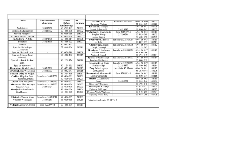 Osoba Numer telefonu domowego Nadleśniczy Zastępca Nadleśniczego Główny Księgowy Inż. Nadzoru – B. Chrobok Inż. Nadzoru - A. Ciba Sekretarz Brakarz Spec. ds. MarketinguG.Olszewski Spec. ds. Hodowli Lasu Spec. ds. Ochrony lasu i Edukacji Spec. ds. szkółek. i szkód górn. Spec. ds. remontów Komendant Straży Leśnej Strażnik Leśny W. Moskwa Strażnik Leśny M. Wójcik Oczków Zbigniew Oroń Ryszard Kurpanik Zacisze Piotr Nieszporek Leboszowice Piotr Kulczyna Bogusław Jania Ochojec Piechota Marcin Józef Łanowy 324103030 324246502 324271705 324218090 - 324512508 324540603 kancelaria: 324317359 kancelaria: 322366493 kancelaria: 322387033 322356524 Numer telefonu komórkowego 60 62 82 983 69 44 66 005 66 04 66 059 60 09 29 604 69 44 66 014 69 44 66 023 60 46 13 362 72 83 48 356 nr skrócony 60 09 29 780 60 64 12 286 288009 288017 288001 288002 288004 288005 288006 288007 288015 66 22 58 326 288010 60 21 38 655 60 44 73 818 66 60 82 647 66 43 14 869 69 44 66 001 60 66 09 140 69 44 66 002 69 44 66 004 66 04 79 390 69 44 66 006 69 44 66 008 288012 288013 288016 288017 288101 288201 288102 288103 288202 288104 288106 Książenice Tomasz Majer Wojciech Wołoszczak kancelaria: 324311310 324359281 69 44 66 007 66 04 30 838 288105 288210 Wielopole Jarosław Chrobok Adam Kozik dom: 322359942 69 44 66 009 60 64 35 027 288011 288301 Szczotki S.Lis Sławomir Walisko Kłokocin K. Brożyna Marek Bojanowski Wodzisław R. Kwapuliński Bogdan Wolny Janusz Ciszek Zwonowice S. Hałacz J. Duda Adamowice K. Hajok Patryk Gaszczyk Chwałęcice A Kochanek Hanna Kuczera Wojciech Kuźnik Syrynia B.Jendrzejczyk Jarosław Mielimąka Ornontowice A. Bryja Stanisław Bąk Żory Adam Ługowy Jerzy Janosz Baranowice S. Grochowski Leszek Gawroński Szkółka G. Adamczyk biuro Kierowca T.Papierok Traktorzysta K.Gojny Dyżurny PAD p.poż. Dyżurny Wieża Wielopole Dyżurny Wieża Żory kancelaria: 4315720 324218987 dom: 324511934 327203244 kancelaria: 324300014 kancelaria: 324300065 kancelaria: 324210074 kancelaria: 324517769 kancelaria: 322215220 322214877 kancelaria: 43 53 466 dom: 324698385 Ostatnia aktualizacja: 02.01.2015 324222372 69 44 66 010 72 83 56 057 69 44 66 011 66 04 60 945 69 44 66 013 60 64 50 008 60 63 85 798 69 44 66 015 78 40 39 079 69 44 66 016 88 21 28 207 69 44 66 017 88 21 99 268 60 67 15 947 69 44 66 018 60 66 09 051 69 44 66 019 66 84 06 863 69 44 66 021 66 04 54 868 69 44 66 022 66 04 02 314 69 44 66 003 66 22 58 246 60 67 85 545 60 63 20 427 66 43 14 871 66 81 93 297 66 04 48 208 288107 288211 288108 288203 288110 288205 288206 288111 288213 288112 288113 288204 288114 288115 288214 288117 288208 288118 288215 288119 288306 288302 288303 288212 288304 288305