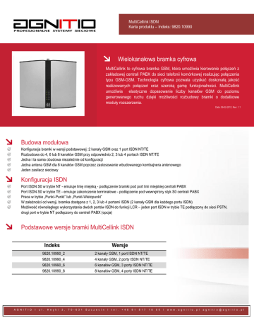 MultiCellink ISDN Karta produktu – Indeks: 9820.10990 Wielokanałowa bramka cyfrowa MultiCellink to cyfrowa bramka GSM, która umożliwia kierowanie połączeń z zakładowej centrali PABX do sieci telefonii komórkowej realizując połączenia typu GSM-GSM. Technologia cyfrowa pozwala uzyskać doskonałą jakość realizowanych połączeń oraz szeroką gamę funkcjonalności. MultiCellink umożliwia elastyczne dopasowanie liczby kanałów GSM do poziomu generowanego ruchu dzięki możliwości rozbudowy bramki o dodatkowe moduły rozszerzenia. Data: 09-02-2012. Rev: 1.1 Budowa modułowa Konfiguracja bramki w wersji podstawowej: 2 kanały GSM oraz 1 port ISDN NT/TE Rozbudowa do 4, 6 lub 8 kanałów GSM przy odpowiednio 2, 3 lub 4 portach ISDN NT/TE Jedna i ta sama obudowa niezależnie od konfiguracji Jedna antena GSM dla 8 kanałów GSM poprzez zastosowanie wbudowanego kombajnera antenowego Jeden zasilacz sieciowy Konfiguracja ISDN Port ISDN S0 w trybie NT - emuluje linię miejską - podłączenie bramki pod port linii miejskiej centrali PABX Port ISDN S0 w trybie TE - emuluje zakończenie terminalowe - podłączenie pod wewnętrzny styk S0 centrali PABX Praca w trybie „Punkt-Punkt” lub „Punkt-Wielopunkt” W zależności od wersji, bramka dostępna z 1, 2, 3 lub 4 portami ISDN (2 kanały GSM dla każdego portu ISDN) Możliwość równoległego wykorzystania dwóch portów ISDN do funkcji LCR – jeden port ISDN w trybie TE podłączony do sieci PSTN, drugi port w trybie NT podłączony do centrali PABX (opcja) Podstawowe wersje bramki MultiCellink ISDN Indeks Wersje 9820.10990_2 9820.10990_4 9820.10990_6 9820.10990_8 A G N I T I O I u l . H e y k i 3 , 2 kanały GSM, 1 port ISDN NT/TE 4 kanały GSM, 2 porty ISDN NT/TE 6 kanałów GSM, 3 porty ISDN NT/TE 8 kanałów GSM, 4 porty ISDN NT/TE 7 0 - 6 3 1 S z c z e c i n I t e l . + 4 8 9 1 8 1 7 1 8 0 0 I w w w . a g n i t i o . p l a g n i t i o @ a g n i t i o . p l MultiCellink ISDN Karta produktu – Indeks: 9820.10990 Funkcje podstawowe Automatyczne podawanie kodu PIN System eliminacji echa Blokowanie karty SIM do sieci operatora niezależnie dla każdego kanału GSM Regulacja poziomu dźwięku w kierunku nadawania i odbioru Odbieranie i wysyłanie wiadomości SMS poprzez port RS232 Funkcje dla ruchu przychodzącego Identyfikacja numeru rozmówcy Bezpośrednie wybieranie numeru wewnętrznego za pomocą tonów DTMF Inteligentne kierowanie połączeń przychodzących na odpowiedni numer DDI na podstawie historii połączeń wychodzących Funkcje dla ruchu wychodzącego Definiowanie kierunków zabronionych Generowanie sygnału „marszruty” podczas wywoływania połączenia System Szybkiego Wybierania numeru Ukrywanie prezentacji własnego numeru Równomierne rozkładanie ruchu dla dostępnych kanałów GSM – funkcja „Trafic share” SMS z podaniem DDI dzwoniącego, jeśli abonent nie odebrał połączenia lub miał zajętą linię Kontrola wykorzystania pakietu minut kart SIM niezależnie dla każdego kanału GSM - funkcja „Talk time” Funkcje serwisowe Lokalne programowanie bramki z poziomu komputera PC poprzez port komunikacyjny RS232 Zdalny dostęp do bramki z wykorzystaniem transmisji danych GSM/CSD Zdalny i lokalny odczyt ostatnich 1500 zdarzeń zarejestrowanych przez bramkę Test połączeń w kierunkach: bramka->GSM oraz bramka->ISDN Odczyt statystyki połączeń dla każdego kanału GSM Odczyt statystyki wysłanych wiadomości SMS dla każdego kanału GSM Możliwość zdalnego lub lokalnego monitoringu pracy bramki w czasie rzeczywistym Przykładowa konfiguracja bramki z 8 kanałami GSM A G N I T I O I u l . H e y k i 3 , 7 0 - 6 3 1 S z c z e c i n I t e l . + 4 8 9 1 8 1 7 1 8 0 0 I w w w . a g n i t i o . p l a g n i t i o @ a g n i t i o . p l MultiCellink ISDN Karta produktu – Indeks: 9820.10990 System zapowiedzi głosowych DISA Działanie funkcji DISA polega na dodzwonieniu się bezpośrednio na numer abonenta wewnętrznego centrali PABX bez pośrednictwa telefonistki. Dzwoniący po połączeniu się z bramką MultiCellink ISDN usłyszy, przygotowaną wcześniej, zapowiedź głosową. MultiCellink umożliwia skonfigurowanie dwóch poziomów zapowiedzi z rozróżnieniem pory na dzień (godziny pracy) i noc. Przykładowa zapowiedź może brzmieć następująco: Dzień Poziom 1. Dzień dobry, dodzwoniłeś się do firmy BD Consult. Aby połączyć się z Działem handlowym - wybierz 1, Wsparciem technicznym – wybierz 2 lub poczekaj na zgłoszenie telefonistki. Poziom 2. Abonent zewnętrzny wybiera numer 1. Jeśli zainteresowany jesteś bramkami analogowymi – wybierz 1, bramkami cyfrowymi – wybierz 2, innymi produktami –wybierz 3. Noc Witamy w firmie BD Consult. Biuro czynne jest od poniedziałku do piątku w godzinach od 8.30 do 16.30. Jeśli chcesz pozostawić wiadomość – wybierz 1. Funkcja oddzwaniania CallBack Funkcja oddzwaniania (CallBack) polega na inicjowaniu połączenia z telefonu komórkowego do bramki MultiCellink i zwrotnym oddzwonieniu bramki na numer inicjujący połączenie. Weryfikacja dostępu abonenta do funkcji odbywa się na podstawie numeru CLIP. Abonent w zależności od przydzielonych mu uprawnień może realizować w trybie oddzwaniania połączenia lokalne, krajowe, międzynarodowe bądź komórkowe. Osoba dzwoniąca nie ponosi kosztów połączenia. Rozmowa w obu kierunkach zestawiana jest przez bramkę, dlatego do osoby odbierającej połączenie nie jest przesyłana prezentacja numeru osoby dzwoniącej. Odbierający połączenie ma przekonanie, że dzwoni do niego osoba z siedziby firmy. Zastosowanie funkcji oddzwaniania pozwala na nieujawnianie prywatnych i służbowych numerów komórkowych osób korzystających z tej funkcji. Funkcja LCR LCR (ang. Least Cost Routing) to funkcja polegająca na kierowaniu ruch wychodzącego drogą, gdzie koszt połączenia jest najtańszy. Określanie najtańszej drogi połączenia definiowane jest w bramce na etapie instalacji. Bramk