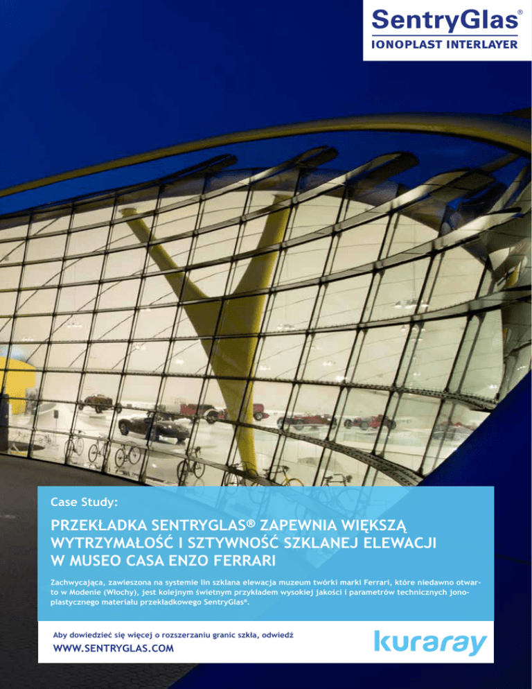 ionoplast interlayer Case Study: Przekładka SentryGlas® zapewnia większą wytrzymałość i sztywność szklanej elewacji w Museo Casa Enzo Ferrari Zachwycająca, zawieszona na systemie lin szklana elewacja muzeum twórki marki Ferrari, które niedawno otwarto w Modenie (Włochy), jest kolejnym świetnym przykładem wysokiej jakości i parametrów technicznych jonoplastycznego materiału przekładkowego SentryGlas®. Aby dowiedzieć się więcej o rozszerzaniu granic szkła, odwiedź www.sentryglas.com ionoplast interlayer Przekładka SentryGlas® zapewnia większą wytrzymałość i sztywność szklanej elewacji w Museo Casa Enzo Ferrari Budynek Museo Casa Enzo Ferrari ma 78 m długości i 45 m szerokości. Inspiracja projektami samochodów sportowych zaowocowała geometrycznymi kształtami oraz przejrzystością elewacji. Photo: Photo Studio 129w Zachwycająca, zawieszona na systemie lin szklana elewacja muzeum twórki marki Ferrari, które niedawno otwarto w Modenie (Włochy), jest kolejnym świetnym przykładem wysokiej jakości i parametrów technicznych jonoplastycznego materiału przekładkowego SentryGlas®. Obecny popyt w architekturze na bryły geometryczne i przezroczyste powłoki wymaga innowacyjnych rozwiązań inżynierskich. Budynek muzeum - o długości 78 metrów i szerokości 45 metrów, projekt Jana Kaplickiego i Andrei Morgante z londyńskiej firmy Future Systems ma kształt złożony z brył geometrycznych i wyróżnia się przejrzystością, a właściwości te wyraźnie zostały zainspirowane projektami samochodów sportowych. W przypadku tego budynku ideą przewodnią było zachowanie nieskomplikowanych kształtów szklanych paneli, które należało połączyć w całość tak, aby, poprzez użycie złożonych i nietypowych detali mocujących, uzyskać powierzchnie różnych brył geometrycznych. Projekt elewacji wykonała włoska firma architektoniczno-inżyniersko-konsultacyjna Politecnica. Szklana elewacja ma wysokość 11 metrów, podtrzymuje ją system lin. Kształt elewacji tworzą dwie łączące się powierzchnie stożkowe, nachylone do wnętrza budynku pod kątem 12,5°. Gładką, lecz atrakcyjnie wygiętą elewację uzyskano przez zastosowanie prostych lin i paneli z płaskiego szkła. Kąty przycięcia paneli dobrano tak, aby umożliwiły utworzenie powierzchni stożkowych. Elewację utrzymuje wygięty w trzech płaszczyznach dźwigar: profil drążony o okrągłym przekroju, średnicy 1 m i długości 62 m. Dźwigar ten, spoczywający na dwóch stalowych filarach w kształcie litery Y, służy jako górne zamocowanie dla lin nośnych elewacji. Liny nie tylko nadają kształt elewacji, ale również przenoszą ciężar paneli na dźwigar. Dolne końce filarów zamocowane są w przegubach, natomiast wierzchołki przymocowano do stalowej konstrukcji dachu. Zestaw przebiegających niemal pionowo lin o średnicy 32 mm ze stali nierdzewnej jest podparciem dla płaskich izolacyjnych paneli szklanych. Zewnętrzną część każdego panelu tworzy arkusz szkła hartowanego o grubości 10 mm, ionoplast interlayer Przekładka SentryGlas® zapewnia większą wytrzymałość i sztywność szklanej elewacji w Museo Casa Enzo Ferrari natomiast część wewnętrzną – laminat złożony z dwóch arkuszy szkła wzmacnianego termicznie o grubości po 6 mm oraz z przekładki o grubości 1,52 mm z materiału SentryGlas®. Przestrzeń między obiema częściami wypełniona jest argonem. Powłoka chroniąca przed promieniowaniem słonecznym ogranicza przenikanie ciepła do wartości Ug = 1,0 W/m2. Inżynierską i budowlaną część projektu zlecono firmie Werner Sobek ze Stuttgartu. Mówi dr Lucio Blandini, dyrektor naczelny: - Prace inżynierskie nad elewacją muzeum były olbrzymim wyzwaniem. Wiele uwagi musieliśmy poświęcić charakterystyce ugięcia całej szklanej elewacji jak również wyginaniu paneli położonych w miejscach największych naprężeń. Żądany skutek uzyskaliśmy częściowo poprzez optymalizację naprężenia wstępnego każdej liny oddzielnie: od 80 do 330 kN. Przekładki z SentryGlas® mają zasadniczą rolę, w szczególności zapewniły znaczne zwiększenie wytrzymałości elewacji na obciążenia. W sumie od samego początku tego projektu zalecamy używanie SentryGlas®. Lżejsze panele elewacyjne umożliwiają delikatniejsze konstrukcje wsporcze Przez dziesięciolecia standardem przemysłowym w dziedzinie laminowanego szkła bezpiecznego był poliwinylobutyral (PVB). Architekci dobrze znają możliwości i ograniczenia Szkła połączonego z tym materiałem w zastosowaniu na elewacje budynków, oszklenie dachów i okien. Materiał Sentryglas® umożliwia całkowicie nowe podejście, ponieważ warstwa pośrednia ma sztywność ponad 100 razy większą, a wytrzymałość 5 razy większą od PVB. W efekcie obciążenia między arkuszami szkła w panelu są przenoszone w prawie 100%, nawet w wysokich temperaturach, co prowadzi do znakomitego zachowania się szkła podczas zginania - również w pełnym słońcu w środku lata. Laminaty z materiałem Sentryglas® uginają się ponad dwa razy mniej w porównaniu do laminatów z PVB pod takim samym obciążeniem, zachowują się prawie identycznie jak monolityczne szkło o takiej samej grubości. Otwarcie muzeum. Zestaw lin (stal nierdzewna, średnica 32 mm) utrzymuje szklane panele izolacyjne z płaskich arkuszy szkła. Zewnętrzna strona elewacji to szkło hartowane o grubości 10mm. Od wewnątrz dwa arkusze szkła wzmacnianego termicznie (po 6 mm) laminowane przekładką SentryGlas® (1,52 mm). Foto: Werner Sobek Stuttgart. ionoplast interlayer Przekładka SentryGlas® zapewnia większą wytrzymałość i sztywność szklanej elewacji w Museo Casa Enzo Ferrari REGIONALNE CENTRA KONTAKTOWE Kuraray Co., LTD Ote Center Bldg. 1-1-3, Otemachi Chiyoda-ku, Tokyo, 100-8115, Japonia Tel.: +81 3 6701 1508 Główne korzyści z SentryGlas®: • Bezpieczeństwo: W przypadku pęknięcia odłamki szkła