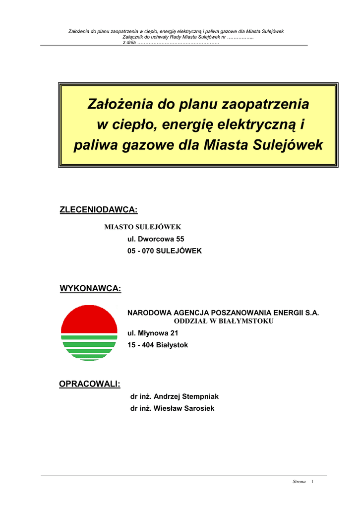 ZałoŜenia do planu zaopatrzenia w ciepło, energię elektryczną i paliwa gazowe dla Miasta Sulejówek Załącznik do uchwały Rady Miasta Sulejówek nr …………….. z dnia …………………………………………… ZałoŜenia do planu zaopatrzenia w ciepło, energię elektryczną i paliwa gazowe dla Miasta Sulejówek ZLECENIODAWCA: MIASTO SULEJÓWEK ul. Dworcowa 55 05 - 070 SULEJÓWEK WYKONAWCA: NARODOWA AGENCJA POSZANOWANIA ENERGII S.A. ODDZIAŁ W BIAŁYMSTOKU ul. Młynowa 21 15 - 404 Białystok OPRACOWALI: dr inŜ. Andrzej Stempniak dr inŜ. Wiesław Sarosiek Strona 1 ZałoŜenia do planu zaopatrzenia w ciepło, energię elektryczną i paliwa gazowe dla Miasta Sulejówek Załącznik do uchwały Rady Miasta Sulejówek nr …………….. z dnia …………………………………………… SPIS TREŚCI 1. PODSTAWA OPRACOWANIA ……………………………………………………… 2. CEL I ZAKRES OPRACOWANIA …………………………………………………. 3. OCENA ISTNIEJĄCEJ GOSPODARKI ENERGETYCZNEJ ……………………... 3.1. CHARAKTERYSTYKA ISTNIEJĄCEJ GOSPODARKI CIEPLNEJ …………...... 3.1.1. Ocena obecnego zapotrzebowania na ciepło ……….…………............................… 3.1.2. Charakterystyka istniejacych źródeł ciepła ……………………………….……....... 3.1.3. Charakterystyka budynków ........................……………………………………....... 3.1.4. Charakterystyka wewnętrznych instalacji odbiorczych ...........................………...... 3.2. CHARAKTERYSTYKA ISTNIEJĄCEJ GOSPODARKI ELEKTROENERGETYCZNEJ ……………………………………….................………………………….. 3.2.1. Źródła zaopatrzenia w energię elektryczną ................................................................ 3.2.2. Obecne zapotrzebowanie na energię elektryczną ..................................................… 3.3 CHARAKTERYSTYKA SYSTEMU GAZOWNICZEGO ……………………......... str. 4 str. 4 str. 5 str. 5 str. 5 str. 9 str. 10 str. 11 str. 12 str. 12 str. 12 str. 13 3.3.1. Źródła zaopatrzenia w gaz ......................................................................................... str. 13 3.3.2. Obecne zapotrzebowanie na paliwa gazowe ..…........................................................ str. 13 4. ANALIZA PRZEDSIĘWZIĘĆ RACJONALIZUJĄCYCH UśYTKOWANIE CIEPŁA, ENERGII ELEKTRYCZNEJ I PALIW GAZOWYCH …................ str. 14 4.1. PRZEDSIĘWZIĘCIA RACJONALIZUJĄCE UśYTKOWANIE CIEPŁA ………..... 4.1.1. Przedsięwzięcia zmniejszające zapotrzebowanie na moc cieplną ………………..... 4.1.2. Przedsięwzięcia zmniejszające zuŜycie energii cieplnej ………………………….... 4.1.3. Przedsięwzięcia dyscyplinujące zuŜycie energii cieplnej ………………………...... 4.2. PRZEDSIĘWZIĘCIA RACJONALIZUJĄCE UśYTKOWANIE ENERGII ELEKTRYCZNEJ …………………………………………………………………...... 4.3. PRZEDSIĘWZIĘCIA RACJONALIZUJĄCE UśYTKOWANIE PALIW GAZOWYCH …………………………………………………………………............. 5. OCENA PRZEWIDYWANYCH ZMIAN ZAPOTRZEBOWANIA NA CIEPŁO, ENERGIĘ ELEKTRYCZNĄ I PALIWA GAZOWE .............................................. 5.1. PROGNOZA PRZYROSTU LUDNOŚCI ................................................................... 5.2. PROGNOZA PRZYROSTU BUDOWNICTWA ………………………………….... 5.3. PRZEWIDYWANE ZMIANY ZAPOTRZEBOWANIA NA CIEPŁO, ENERGIĘ ELEKTRYCZNĄ I PALIWA GAZOWE ………………….………......................… 5.3.1. Przewidywane zmiany zapotrzebowania na ciepło …………………………....…… 5.3.2. Przewidywane zmiany zapotrzebowania na energię elektryczną ……………...…... 5.3.3. Przewidywane zmiany zapotrzebowania na paliwa gazowe …...………………...... str. 14 str. 14 str. 15 str. 20 str. 21 str. 22 str. 23 str. 23 str. 24 str. 29 str. 29 str. 30 str. 31 6. ANALIZA MOśLIWOŚCI WYKORZYSTANIA ISTNIEJĄCYCH NADWYśEK I LOKALNYCH ZASOBÓW PALIW I ENERGII ORAZ ZAGOSPODAROWANIA CIEPŁA ODPADOWEGO Z INSTALACJI PRZEMYSŁOWYCH ….................….. str. 32 7. ANALIZA MOśLIWOŚCI WSPÓŁPRACY Z INNYMI GMINAMI …………….. str. 33 Strona 2 ZałoŜenia do planu zaopatrzenia w ciepło, energię elektryczną i paliwa gazowe dla Miasta Sulejówek Załącznik do uchwały Rady Miasta Sulejówek nr …………….. z dnia …………………………………………… 8. OKREŚLENIE ZAŁOśEŃ DO PLANU ZAOPATRZENIA W CIEPŁO, ENERGIĘ ELEKTRYCZNĄ I PALIWA GAZOWE ………………………………………….… str. 33 ZAŁĄCZNIKI NR 1. CHARAKTERYSTYKA TECHNICZNA ANALIZOWANYCH BUDYNKÓW NR 2. OSZACOWANIE BUDYNKI ZUśYCIA ENERGII CIEPLNEJ PRZEZ ANALIZOWANE NR 3. CHARAKTERYSTYKA ISTNIEJĄCYCH ŹRÓDEŁ CIEPŁA ANALIZOWANYCH BUDYNKÓW NR 4. SZCZEGÓŁOWY WYKAZ STACJI TRANSFORMATOROWYCH NR 5. OCENA ENERGOCHŁONNOŚCI ANALIZOWANYCH BUDYNKÓW NR 6. EFEKTY ENERGETYCZNE BUDYNKÓW TERMOMODERNIZACJI ANALIZOWANYCH CZĘŚĆ GRAFICZNA RYS. NR 1. USYTUOWANIE ANALIZOWANYCH ŹRÓDEŁ CIEPŁA RYR. NR 2. SZCZEGÓŁOWY SCHEMAT SYSTEMU ELEKTROENERGETYCZNEGO RYS. NR 3. SYSTEM GAZOWNICZY MIASTA SULEJÓWEK RYS. NR 4. OBSZARY URBANISTYCZNE MIASTA SULEJÓWEK RYS. NR 5. PLANOWANE UJĘCIE WÓD GEOTERMALNYCH Strona 3 ZałoŜenia do planu zaopatrzenia w ciepło, energię elektryczną i paliwa gazowe dla Miasta Sulejówek Załącznik do uchwały Rady Miasta Sulejówek nr …………….. z dnia …………………………………………… 1. PODSTAWA OPRACOWANIA Podstawą wykonania opracowania były: - Umowa zawarta pomiędzy Miastem Sulejówek i Narodową Agencją Poszanowania Energii S.A. w Warszawie; - Dane udostępnione przez Urząd Miasta Sulejówek; - Dane udostępnione przez Mazowieckiego Operatora Systemu Dystrybucyjnego Sp. z o.o. Oddział Zakład Gazowniczy War