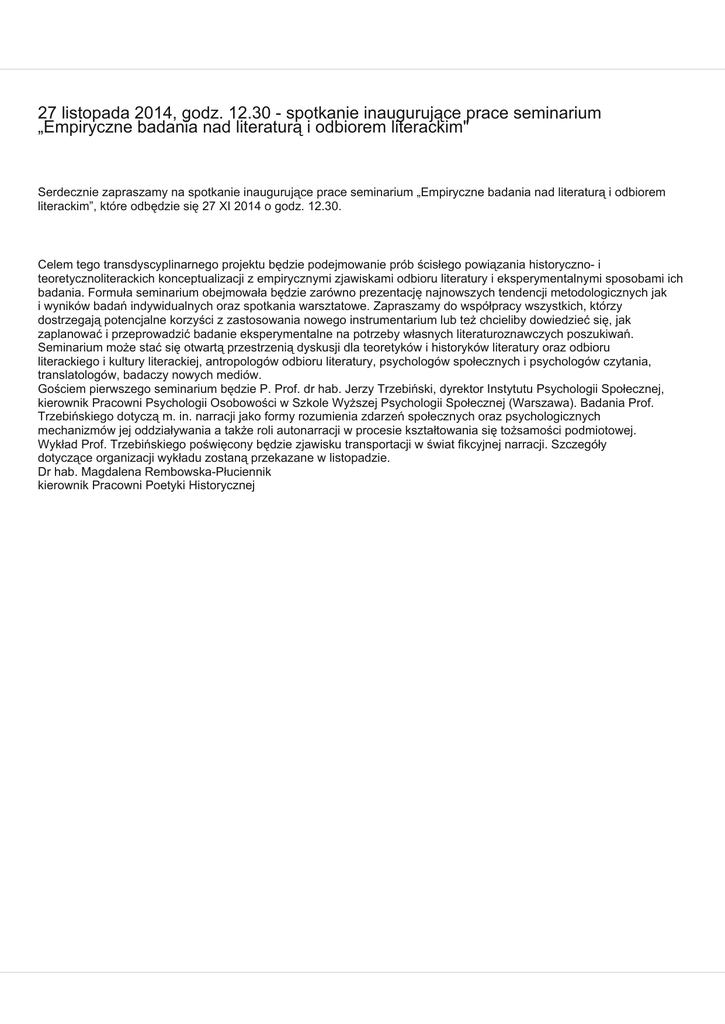 27 listopada 2014, godz. 12.30 - spotkanie inaugurujące prace seminarium „Empiryczne badania nad literaturą i odbiorem literackim" Serdecznie zapraszamy na spotkanie inaugurujące prace seminarium „Empiryczne badania nad literaturą i odbiorem literackim”, które odbędzie się 27 XI 2014 o godz. 12.30. Celem tego transdyscyplinarnego projektu będzie podejmowanie prób ścisłego powiązania historyczno- i teoretycznoliterackich konceptualizacji z empirycznymi zjawiskami odbioru literatury i eksperymentalnymi sposobami ich badania. Formuła seminarium obejmowała będzie zarówno prezentację najnowszych tendencji metodologicznych jak i wyników badań indywidualnych oraz spotkania warsztatowe. Zapraszamy do współpracy wszystkich, którzy dostrzegają potencjalne korzyści z zastosowania nowego instrumentarium lub też chcieliby dowiedzieć się, jak zaplanować i przeprowadzić badanie eksperymentalne na potrzeby własnych literaturoznawczych poszukiwań. Seminarium może stać się otwartą przestrzenią dyskusji dla teoretyków i historyków literatury oraz odbioru literackiego i kultury literackiej, antropologów odbioru literatury, psychologów społecznych i psychologów czytania, translatologów, badaczy nowych mediów. Gościem pierwszego seminarium będzie P. Prof. dr hab. Jerzy Trzebiński, dyrektor Instytutu Psychologii Społecznej, kierownik Pracowni Psychologii Osobowości w Szkole Wyższej Psychologii Społecznej (Warszawa). Badania Prof. Trzebińskiego dotyczą m. in. narracji jako formy rozumienia zdarzeń społecznych oraz psychologicznych mechanizmów jej oddziaływania a także roli autonarracji w procesie kształtowania się tożsamości podmiotowej. Wykład Prof. Trzebińskiego poświęcony będzie zjawisku transportacji w świat fikcyjnej narracji. Szczegóły dotyczące organizacji wykładu zostaną przekazane w listopadzie. Dr hab. Magdalena Rembowska-Płuciennik kierownik Pracowni Poetyki Historycznej