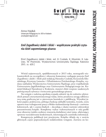 filologia | nauki społeczne | filozofia | teologia 2(25)/2015 Anna Hajduk Uniwersytet Pedagogiczny im. KEN w Krakowie [email protected] Emil Zegadłowicz daleki i bliski – współczesne praktyki czytania dzieł zapomnianego pisarza [Emil Zegadłowicz daleki i bliski, red. H. Czubała, K. Kłosiński, K. Latawiec, W. Próchnicki, Wydawnictwo Uniwersytetu Śląskiego, Katowice 2015, ss. 420.] Wśród najnowszych, opublikowanych w 2015 roku, monografii wieloautorskich na szczegółowy i obszerny komentarz zasługuje pozycja Emil Zegadłowicz daleki i bliski pod redakcją Henryka Czubały, Krzysztofa Kłosińskiego, Krystyny Latawiec i Włodzimierza Próchnickiego. Książka, wydana nakładem Wydawnictwa Uniwersytetu Śląskiego, przy współudziale Uniwersytetu Jagiellońskiego oraz Uniwersytetu Pedagogicznego im. Komisji Edukacji Narodowej w Krakowie, stanowi zbiór rozpraw naukowych poświęconych sylwetce i twórczości gorzeńskiego pisarza. Na wstępie z należną aprobatą wypada odnieść się do walorów edytorskich ponad czterystustronicowego tomu, który przykuwa uwagę odbiorcy swą szatą graficzną już w pierwszym kontakcie z publikacją. Wysokiej jakości papier, praktyczna, pełniąca funkcję zakładki tasiemka, twarda, szyta oprawa oraz wzbogacenie pracy o blisko siedemdziesiąt ilustracji – zarówno kolorowych, jak i czarno-białych – decydują o dużej wartości edytorskiej prezentowanej książki. Kompletny wykaz wykorzystanych w niej grafik oraz obszerny indeks osobowy stanowią dodatkowy atut tomu, ułatwiający sprawne wyszukiwanie konkretnych, interesujących czytelnika informacji. Kompozycja publikacji jest przejrzysta. Książka składa się z sześciu głównych części poprzedzonych redaktorskim wstępem. Zawiera on ko- Materiały, komentarze, recenzje Świat i Słowo 254 Anna Hajduk mentarz dotyczący m.in. wyboru tytułu wydawnictwa, historycznego tła, którego tematyczne i ideologiczne odzwierciedlenie możemy dostrzec w twórczości Zegadłowicza. Nie pominięto też problematyki dzieł bohatera rozważań, przedstawiając w zarysie ich główne wątki tematyczne. Już w przedmowie zasygnalizowane zostają zagadnienia istotne, choć pomijane w dotychczasowych badaniach, jak przykładowo kategoria cielesności, niepoddana dotąd wyczerpującej i nowoczesnej analizie, a także te, które w szczególny sposób wiążą się z kwestią autobiografizmu u Zegadłowicza (np. kategoria pamięci). Po lekturze pięciostronicowego słowa wstępnego redaktorów, które rzuca światło na podejmowane w książce wątki, czytelnik może zapoznać się z właściwą częścią tomu, podzieloną na kilka usystematyzowanych tematycznie działów składowych. Pierwszy z nich skupia się na ogólnej refleksji nad sylwetką twórczą Zegadłowicza, stanowi tym samym wprowadzenie do dalszych rozważań o bardziej zawężonych kręgach tematycznych. W tej partii publikacji umieszczone zostały trzy szkice: Emil Zegadłowicz – punkty widzenia Włodzimierza Próchnickiego, Sentymentalizm Emila Zegadłowicza – strategie językowe Krystyny Latawiec oraz Emila Zegadłowicza doświadczenie świata Henryka Czubały. Pierwszy z autorów podejmuje istotną kwestię przenikania do pisarstwa Zegadłowicza jego indywidualnych doświadczeń biograficznych oraz rzeczywistości historycznej, społecznej czy obyczajowej jemu współczesnej. Na przykładzie powieści Zmory… i Motory oraz dramatu Sind Sie Juden? szczegółowo omawia Próchnicki charakterystyczny dla Zegadłowicza sposób kreowania świata przedstawionego – pod pewnymi względami podobny do strategii narracyjnych przedstawicieli XX-wiecznego realizmu, jednocześnie jednak wyjątkowy, łączący w sobie elementy naturalizmu, symbolizmu i psychologizmu. Autorka kolejnego szkicu, Krystyna Latawiec, za punkt wyjścia refleksji obiera krytycznoliterackie tezy, zarzucające Zegadłowiczowi zbytnią emocjonalność i sentymentalizm. Omawia afektywny aspekt pisarstwa gorzeńskiego twórcy. Dokonuje trafnej diagnozy tej twórczości, wskazując czynniki wywierające na nią wpływ, oraz dając świadectwo zmianom, jakim ta podlegała. Badaczka, analizując wybrane motywy reprezentatywne dla dzieł Zegadłowicza, udowadnia, iż poszczególne utwory autora Motorów zajmują miejsce między dwoma biegunami jego pisarstwa – sentymentalną tkliwością (bliższą poezji) i brutalizującą ekscytacją (obecną w późnej prozie bohatera rozważań). W ujęciu badaczki ekspozycja uczuć szlachetnych bądź wywieranie presji na odbiorcę poprzez brutalistyczną poetykę grozy służy Zegadłowiczowi do wykreowania wrażenia wzniosłości. Autorka Emil Zegadłowicz daleki i bliski – współczesne praktyki… 255 rozprawy zauważa również niebagatelną rolę czytelnika, którego współodczuwające, emocjonalne reakcje są dowodem szczególnej więzi łączącej odbiorcę tekstu z jego twórcą. Nie ulega bowiem wątpliwości, iż ładunek emocjonalny tego pisarstwa, temperatura uczuć – niekiedy zamknięta w ramach konwencji, innym razem przekraczająca jej granice, prowokująca sprzeciw – wciąż budzi duże zainteresowanie czytelników. Ostatni szkic pierwszej części tomu został podzielony przez autora, Henryka Czubałę, na kilka segmentów – „podrozdziałów”, z których każdy odpowiada jednemu wątkowi refleksji. Rozwiązanie to uznać należy za korzystne, sprzyjające przejrzystości tekstu. Badacz zajmuje się tu sposobem, w jaki Zegadłowicz opowiada o figurze Innego – tego, do którego możemy się zbliżyć, niejako przekraczając własną tożsamość. W ujęciu Czubały proza i poezja autora Zmór… staje się miejscem, w którym Inny i inność mogą być doświadczani, mimo że w powszechnej opinii stanowią kategorie, względem których powinniśmy zachowywać dystans. W tej – bez wątpienia interesującej – perspektywie literatura traktowana jest raczej jako „sztuka doświadczania” Inn