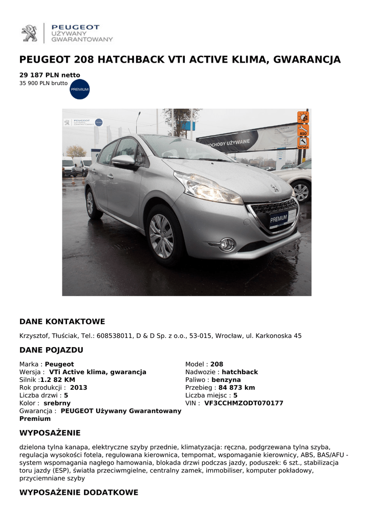 PEUGEOT 208 HATCHBACK VTI ACTIVE KLIMA, GWARANCJA 29 187 PLN netto 35 900 PLN brutto DANE KONTAKTOWE Krzysztof, Tłuściak, Tel.: 608538011, D & D Sp. z o.o., 53-015, Wrocław, ul. Karkonoska 45 DANE POJAZDU Marka : Peugeot Wersja : VTi Active klima, gwarancja Silnik :1.2 82 KM Rok produkcji : 2013 Liczba drzwi : 5 Kolor : srebrny Gwarancja : PEUGEOT Używany Gwarantowany Premium Model : 208 Nadwozie : hatchback Paliwo : benzyna Przebieg : 84 873 km Liczba miejsc : 5 VIN : VF3CCHMZODT070177 WYPOSAŻENIE dzielona tylna kanapa, elektryczne szyby przednie, klimatyzacja: ręczna, podgrzewana tylna szyba, regulacja wysokości fotela, regulowana kierownica, tempomat, wspomaganie kierownicy, ABS, BAS/AFU system wspomagania nagłego hamowania, blokada drzwi podczas jazdy, poduszek: 6 szt., stabilizacja toru jazdy (ESP), światła przeciwmgielne, centralny zamek, immobiliser, komputer pokładowy, przyciemniane szyby WYPOSAŻENIE DODATKOWE bezwypadkowy, pierwszy właściciel, serwisowany w ASO OPIS POJAZDU PAKIET KORZYŚCI: Dlaczego warto kupić auto w D&D PEUGEOT UŻYWANY GWARANTOWANY: -Bo jesteśmy liderem w sprzedaży samochodów Peugeot Używany Gwarantowany na DOLNYM ŚLĄSKU -Dokładnie sprawdzamy stan techniczny, -W każdym samochodzie GWARANTUJEMY przebieg, -Na fakturze sprzedaży zawsze wpisujemy przebieg i wystawiamy na pełną wartość auta -Auto zawsze posiada aktualne badanie techniczne i ważne ubezpieczenie OC -Klient zawsze otrzymuje komplet dokumentów do rejestracji -Gwarantujemy jazdę próbną i profesjonalną obsługą -Dla nas najważniejszy jest Klient KREDYT- dla osób fizycznych i firm do 84 miesięcy, kredyt do 100% wartości auta LEASING – minimalne wpłaty, wykup 1%, od 24-84 miesięcy UBEZPIECZENIA- atrakcyjne PAKIETY DEALERSKIE ODKUPUJEMY SAMOCHODY WSZYSTKICH MAREK ZA GOTÓWKE, ROZLICZAMY BEZGOTÓWKOWO PRZY ZAKUPIE AUTA UŻYWANEGO LUB NOWEGO. Niniejsze ogłoszenie nie stanowi oferty handlowej w myśl art.66, paragraf 1.Kodeksu Cywilnego. Sprzedawca nie odpowiada za ewentualne błędy lub nieaktualność ogłoszenia Światła do jazdy dziennej, Wspomaganie układu kierowniczego, Wycieraczka szyby tylnej, Zamek centralny z pilotem, WIP Sound: Radio CD z MP3, gniazdo AUX, 4 głośniki, sterowanie z kierownicy, Uchwyty ISOFIX do mocowania fotelika dziecięcego - tył, Tylne oparcie składane, dzielone, Tempomat z organicznikiem prędkości, Uchwyty na kubki w konsoli środkowej, Tapicerka materiałowa, Pasy bezpieczeństwa przednie z napinaczami, ogranicznikami napięcia i regulacja wysokości mocowania, Lakier uni, Szyba tylna ogrzewana, Szyby barwione, Pasy bezpieczeństwa z napinaczami - tył, ABS, Schowek w desce rozdzielczej przed pasażerem, zamykany, podświetlany, Klimatyzacja, Lusterka boczne w kolorze nadwozia, Koło zapasowe pełnowymiarowe, AFU - system wspomagania hamowania, Kontrolki zapięcia pasów bezpieczeństwa dla wszystkich miejsc z funkcją ostrzegania o odpięciu pasów, Komputer pokładowy, Oświetlenie bagażnika, Klamki wewnętrzne chromowane, Gniazdo 12V, Zagłówki przednie i tylne z regulacją wysokości, ESP - system stabilizacji toru jazdy, Felgi stalowe 15 z ogumieniem 185/65, Kolumna kierownicy z regulacją w dwóch płaszczyznach, Klamki zewnętrzne w kolorze nadwozia, Immobilizer, Fotel kierowcy z mech. regulacją wysokości, Airbag 6 sztuk: poduszki powietrzne czołowe i boczne dla kierowcy i pasażera, kurtyny powietrzne, Elektryczne podnoszenie szyb, przód, Światła przeciwmgielne, Lusterka boczne ze zintegrowanymi kierunkowskazami, regulowane elektrycznie i ogrzewane, Automatyczna blokada drzwi podczas jazdy, Lakier metalik, Pakiet Widoczność, Elektryczne podnoszenie szyb, przód i tył, pakiet Pierwszy właściciel, Bezwypadkowy, Kupiony w ASO w Polsce, Pojazd regularnie serwisowany, auto sprzedawane z 3 miesięczną gwarancją Samochód sprzedawany w programie PEUGEOT Używany Gwarantowany PREMIUM: Roczna Gwarancja Umowna Certyfikat Jakości Pojazdu Dekra Opieka Peugeot Assitance Specjalna Oferta Ubezpieczeniowa Specjalna Oferta Finansowania Zakupu Wymiana w 30 Dni Dowiedz się więcej na : http://www.UzywanyGwarantowany.pl QR CODE DLA OGŁOSZENIA W SERWISIE UZYWANYGWARANTOWANY.PL Powered by TCPDF (www.tcpdf.org)