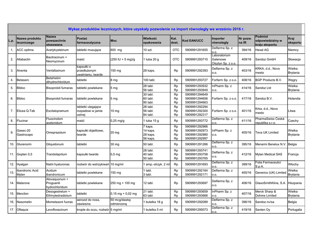 Wykaz produktów leczniczych, które uzyskały pozwolenie na import równoległy we wrześniu 2016 r. Nazwa produktu leczniczego Nazwa powszechnie stosowana Postać farmaceutyczna Moc Wielkość opakowania 1. ACC optima Acetylcysteinum tabletki musujące 600 mg 10 szt. OTC 5909991291655 2. Altabactin Bacitracinum + Neomycinum maść (250 IU + 5 mg)/g 1 tuba 20 g OTC 5909991293710 3. Alventa Venlafaxinum kapsułki o przedłużonym uwalnianiu, twarde 150 mg 28 kaps. Rp 5909991292393 4. Betaserc Betahistini dihydrochloridum tabletki 8 mg 100 tabl. Rp 5. Bibloc Bisoprololi fumaras tabletki powlekane 5 mg 6. Bibloc Bisoprololi fumaras tabletki powlekane 5 mg 7. Elicea Q-Tab Escitalopramum tabletki ulegające rozpadowi w jamie ustnej 10 mg 28 tabl. 56 tabl. 30 tabl. 60 tabl. 90 tabl. 28 tabl. 56 tabl. 84 tabl. 8. Flucinar Fluocinoloni acetonidum maść 0,25 mg/g 9. Gasec-20 Gastrocaps Omeprazolum kapsułki dojelitowe, twarde 10. Glurenorm Gliquidonum 11. Gopten 0,5 12. Hyalgan L.p. 13. Ibandronic Acid Mylan 14. Malarone 15. Mercilon Podmiot odpowiedzialny w kraju eksportu Kraj eksportu 394/16 Hexal AG Niemcy 409/16 Sandoz GmbH Słowacja Delfarma Sp. z o.o. 403/16 KRKA, d.d., Novo mesto Wielka Brytania 5909991293727 Forfarm Sp. z o.o. 408/16 BGP Products B.V. Węgry Rp Rp Rp Rp Rp Rp Rp Rp 5909991293932 5909991293949 5909991294649 5909991294656 5909991294663 5909991292294 5909991292300 5909991292317 InPharm Sp. z o.o. 414/16 Sandoz Ltd Wielka Brytania Forfarm Sp. z o.o. 417/16 Sandoz B.V. Holandia Forfarm Sp. z o.o. 401/16 Krka, d.d., Novo mesto Litwa 1 tuba 15 g Rp 5909991293772 Delfarma Sp. z o.o. 411/16 PharmaSwiss Česká republika s.r.o. Czechy 20 mg 7 kaps. 14 kaps. 28 kaps. 56 kaps. Rp Rp Rp Rp 5909991292966 5909991292973 5909991292980 5909991292997 InPharm Sp. z o.o. 405/16 Teva UK Limited Wielka Brytania tabletki 30 mg 50 tabl. Rp 5909991291266 Delfarma Sp. z o.o. 395/16 Menarini Benelux N.V. Belgia Trandolaprilum kapsułki twarde 0,5 mg 28 tabl. 40 tabl. 50 tabl. Rp Rp Rp 5909991293741 5909991293758 5909991293765 Delfarma Sp. z o.o. 412/16 Mylan Medical SAS Francja Natrii hyaluronas roztwór do wstrzykiwań 10 mg/ml 1 amp.-strzyk. 2 ml Rp 5909991291693 399/16 Fidia Farmaceutici S.p.A. Włochy tabletki powlekane 150 mg 1 tabl. 3 tabl. Rp Rp 5909991292164 5909991292171 400/16 Generics (UK) Limited Wielka Brytania tabletki powlekane 250 mg + 100 mg 12 tabl. Rp 5909991293697 406/16 GlaxoSmithKline, S.A. Hiszpania tabletki 0,15 mg + 0,02 mg 21 tabl. 63 tabl. Rp Rp 5909991293659 5909991293666 407/16 Merck Sharp & Dohme Limited Wielka Brytania 50 mcg/dawkę odmierzoną 1 butelka 18 g Rp 5909991292089 396/16 Sandoz nv/sa Belgia 1 butelka 5 ml Rp 5909991295073 419/16 Santen Oy Portugalia Acidum ibandronicum Atovaquonum + Proguanili hydrochloridum Desogestrelum + Ethinylestradiolum 16. Nasometin Mometasoni fuoras aerozol do nosa, zawiesina 17. Oftaquix Levofloxacinum krople do oczu, roztwór 5 mg/ml Kat. dost. Kod EAN/UCC Importer równoległy Delfarma Sp. z o.o. Laboratorium Galenowe Olsztyn Sp. z o.o. Delfarma Sp. z o.o. Delfarma Sp. z o.o. Delfarma Sp. z o.o. InPharm Sp. z o.o. Delfarma Sp. z o.o. Delfarma Sp. z o.o. Nr pozw. na IR Wykaz produktów leczniczych, które uzyskały pozwolenie na import równoległy we wrześniu 2016 r. L.p. Nazwa produktu leczniczego 18. Polvertic 19. Primacor 20. Rennie Antacidum 21. Saridon Nazwa powszechnie stosowana Betahistini dihydrochloridum Lercanidipini hydrochloridum Calcii carbonas + Magnesii subcarbonas ponderosus Paracetamolum + Propyphenazonum + Coffeinum Postać farmaceutyczna Podmiot odpowiedzialny w kraju eksportu Kraj eksportu 393/16 Medana Pharma SA Słowacja Delfarma Sp. z o.o. 404/16 Berlin-Chemie AG Niemcy 5909991293802 5909991293819 Delfarma Sp. z o.o. 415/16 UAB Bayer Łotwa OTC OTC 5909991291211 5909991291228 PharmaVitae Sp. z o.o. sp. k. 392/16 UAB Bayer Litwa Rp 5909991293734 Moc Wielkość opakowania tabletki 16 mg 20 tabl. 30 tabl. 50 tabl. 60 tabl. 100 tabl. Rp Rp Rp Rp Rp 5909991291310 5909991291327 5909991291334 5909991291341 5909991291358 Laboratorium Galenowe Olsztyn Sp. z o.o. tabletki powlekane 20 mg 60 tabl. Rp 5909991292959 tabletki do ssania 680 mg + 80 mg 24 tabl. 48 tabl. OTC OTC tabletki 250 mg + 150 mg + 50 mg 10 tabl. 20 tabl. Kat. dost. Kod EAN/UCC Importer równoległy Delfarma Sp. z o.o. Forfarm Sp. z o.o. Nr pozw. na IR Paroxetinum tabletki powlekane 20 mg 30 tabl. 23. Skinoren Acidum azelaicum krem 200 mg/g 1 tuba 30 g OTC 5909991294724 Strepsils 24. truskawkowy bez cukru Alcohol 2,4dichlorobenzylicus + pastylki twarde Amylmetacresolum tabletki o Ferrosi sulfas + zmodyfikowanym Acidum folicum uwalnianiu 1,2 mg + 0,6 mg 12 szt. 24 szt. OTC OTC 5909991293789 5909991293796 Forfarm Sp. z o.o. 413/16 Reckitt Benckiser Hellas Chemicals SA Grecja 80 mg jonów żelaza(II) + 0,35 mg 30 tabl. 100 tabl. Rp Rp 5909991293062 5909991293079 Delfarma Sp. z o.o. 418/16 Pierre Fabre Medicament Czechy Rp Rp Rp Rp Rp 5909991291952 5909991291969 5909991291976 5909991291983 5909991291990 Forfarm Sp. z o.o. 402/16 STADA Arzneimittel AG Czechy 25. Tardyferon-Fol 410/16 GlaxoSmithKline d.o.o. Bayer Hellas ABEE 22. Seroxat 416/16 Chorwacja Grecja 26. Zaldiar Tramadoli hydrochloridum + Paracetamolum tabletki powlekane 37,5 mg + 325 mg 10 tabl. 20 tabl. 30 tabl. 50 tabl. 90 tabl. 27. Zulbex Rabeprazolum natricum tabletki dojelitowe 10 mg 14 tabl. 28 tabl. 56 tabl. Rp Rp Rp 5909991291709 5909991291716 5909991291723 InPharm Sp. z o.o. 397/16 KRKA, d.d., Novo mesto Czechy 28. Zulbex Rabeprazolum natricum tabletki dojelitowe 20 mg 14 tabl. 28 tabl. 56 tabl. Rp Rp Rp 5909991291815 5909991291822 5909991291839 InPharm Sp. z o.o. 398/16 KRKA, d.d., Novo mesto Czechy