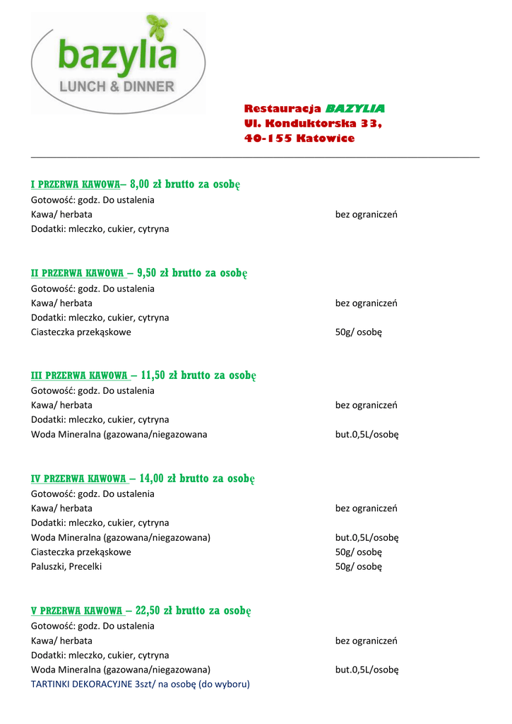 Restauracja BAZYLIA Ul. Konduktorska 33, 40-155 Katowice _______________________________________________________________________________________ I PRZERWA KAWOWA– 8,00 zł brutto za osobę Gotowość: godz. Do ustalenia Kawa/ herbata Dodatki: mleczko, cukier, cytryna bez ograniczeń II PRZERWA KAWOWA – 9,50 zł brutto za osobę Gotowość: godz. Do ustalenia Kawa/ herbata Dodatki: mleczko, cukier, cytryna Ciasteczka przekąskowe bez ograniczeń III PRZERWA KAWOWA – 11,50 zł brutto za osobę Gotowość: godz. Do ustalenia Kawa/ herbata Dodatki: mleczko, cukier, cytryna Woda Mineralna (gazowana/niegazowana bez ograniczeń IV PRZERWA KAWOWA – 14,00 zł brutto za osobę Gotowość: godz. Do ustalenia Kawa/ herbata Dodatki: mleczko, cukier, cytryna Woda Mineralna (gazowana/niegazowana) Ciasteczka przekąskowe Paluszki, Precelki V PRZERWA KAWOWA – 22,50 zł brutto za osobę Gotowość: godz. Do ustalenia Kawa/ herbata Dodatki: mleczko, cukier, cytryna Woda Mineralna (gazowana/niegazowana) TARTINKI DEKORACYJNE 3szt/ na osobę (do wyboru) 50g/ osobę but.0,5L/osobę bez ograniczeń but.0,5L/osobę 50g/ osobę 50g/ osobę bez ograniczeń but.0,5L/osobę VI PRZERWA KAWOWA – 23,50 zł brutto za osobę Gotowość: godz. Do ustalenia Kawa/ herbata Dodatki: mleczko, cukier, cytryna Woda Mineralna (gazowana/niegazowana) Ciasteczka przekąskowe Paluszki, Precelki TARTINKI DEKORACYJNE 3szt/ na osobę (do wyboru) bez ograniczeń but.0,5L/osobę 50g/ osobę Oferta cateringowa RODZAJE TARTINEK /do wyboru/: 1.Tartinki z pastą jajeczną + garni 2.Tartinki z pastą z tuńczyka + garni 3.Tartinki z serami pleśniowymi + garni 4.Tartinki z pastą ziołową + garni 5.Tartinki z pastą paprykową + garni 6.Tartinki z wędlinami staropolskimi 7. Tartinki z łososiem 8. Tartinki z salami + garni W skład garni wchodzą elementy dekoracyjne takie jak: oliwka czarna i zielona, pomidor, ogórek zielony, majonezy niskokaloryczne, wszelkie warzywa kolorystycznie dobierane przez Szefa Kuchni. Istnieje możliwość wyboru pieczywa: pszenne, razowe, graham z dodatkiem ziaren zbóż/słonecznika, pieczywo typu wasa. Do każdego zestawu proponujemy soki owocowe serwowane w dzbankach 200ml na osobę / 2,00 zł. /pomarańczowy, jabłkowy, grejfrutowy, czarna porzeczka/ NAPOJE KOMPOT WIELOOWOCOWY PEPSI PEPSI LIGHT MIRINDA 7UP pomarańczowy jabłkowy grejfrutowy pomidorowy multiwitamina czarna porzeczka 250ml but.0,5l but.0,5l but.0,5l but.0,5l SOK TYMBARK 100% but. 0,2ml but. 0,2ml but. 0,2ml but. 0,2ml but. 0,2ml but. 0,2ml WODA MINERALNA gaz./niegaz. but. 0,5l 2,50 zł 4,00 zł 4,00 zł 4,00 zł 4,00 zł 3,00 zł 3,00 zł 3,00 zł 3,00 zł 3,00 zł 3,00 zł 3,00 zł Gazowana TYMBARK but. 0,3 ml but. 0,3 ml 3,50 zł 3,50 zł wiśnia jabłko jabłko mięta TYMBARK Apesik napój but. 0,3 ml but. 0,3 ml 3,50 zł 3,50 zł Liczi Kaktus Kakaowiec Mango Żurawina TYMBARK Owoce Świata but. 0,250ml but. 0,250ml but. 0,250ml but. 0,250ml but. 0,250ml 3,00 zł 3,00 zł 3,00 zł 3,00 zł 3,00 zł KOKTAIL 0,250 ml malinowy truskawkowy kiwi z bananem brzoskwinia z gruszką 4,50 zł 4,50 zł 4,50 zł 4,50 zł ZAPRASZAMY !