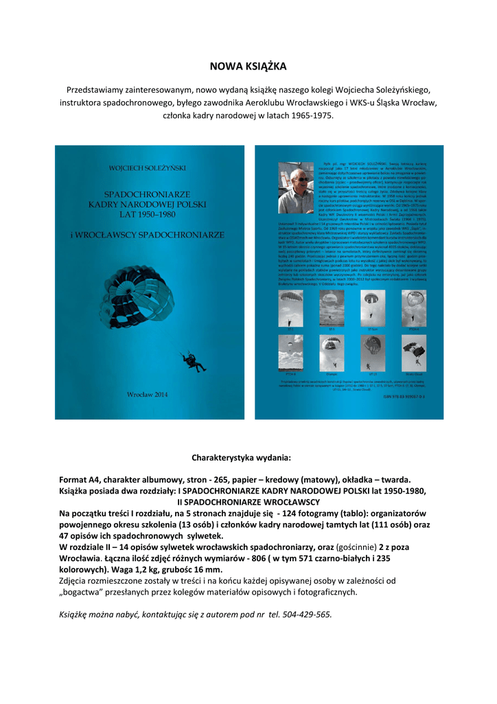 NOWA KSIĄŻKA Przedstawiamy zainteresowanym, nowo wydaną książkę naszego kolegi Wojciecha Soleżyńskiego, instruktora spadochronowego, byłego zawodnika Aeroklubu Wrocławskiego i WKS-u Śląska Wrocław, członka kadry narodowej w latach 1965-1975. Charakterystyka wydania: Format A4, charakter albumowy, stron - 265, papier – kredowy (matowy), okładka – twarda. Książka posiada dwa rozdziały: I SPADOCHRONIARZE KADRY NARODOWEJ POLSKI lat 1950-1980, II SPADOCHRONIARZE WROCŁAWSCY Na początku treści I rozdziału, na 5 stronach znajduje się - 124 fotogramy (tablo): organizatorów powojennego okresu szkolenia (13 osób) i członków kadry narodowej tamtych lat (111 osób) oraz 47 opisów ich spadochronowych sylwetek. W rozdziale II – 14 opisów sylwetek wrocławskich spadochroniarzy, oraz (gościnnie) 2 z poza Wrocławia. Łączna ilość zdjęć różnych wymiarów - 806 ( w tym 571 czarno-białych i 235 kolorowych). Waga 1,2 kg, grubośc 16 mm. Zdjęcia rozmieszczone zostały w treści i na końcu każdej opisywanej osoby w zależności od „bogactwa” przesłanych przez kolegów materiałów opisowych i fotograficznych. Książkę można nabyć, kontaktując się z autorem pod nr tel. 504-429-565. Tu krótkie wyjaśnienie autora: „Ponieważ miałem zamiar wydania osobnego pracowania sylwetek wrocławskich spadochroniarzy z którego ze względu na stan zdrowia, musiałem zrezygnować, postanowiłem przy okazji tego wydania, wykorzystać przesłane już przez kolegów materiały i poszerzyć książkę o drugi rozdział, umieszczając w nim 16 wrocławskich spadochroniarzy (w tym – gościnnie dwóch z poza Wrocławia), wzbogacając tenże materiał książkowy, (kolejnych14 wrocławskich spadochroniarzy - członków kadry narodowej, ujętych zostało w I rozdziale), a jednocześnie, przynajmniej częściowo wywiązać się z pierwotnego zamiaru. Szanowni koledzy spadochroniarze i sympatycy spadochroniarstwa Dobiegający nieuchronnie zmierzch ludzi pierwszego powojennego, 30-letniego okresu sportowej działalności spadochroniarzy, stał się inspiracją do niniejszego opracowania sylwetek zawodników (cywilnych i wojskowych), tworzących ówczesną kadrę narodową. Spadochroniarzy, stanowiących sportową czołówkę krajową, reprezentującą Polskę w Międzynarodowych Zawodach Spadochronowych, Mistrzostwach Armii i Mistrzostwach Świata. Niestety, do tej pory nie doczekaliśmy się uhonorowania tych ludzi trwałym nośnikiem (książką, biuletynem czy nawet broszurą), przedstawiającą ich osiągnięcia sportowe, pracę szkoleniową i dalszy aktywny ich udział także w innych dziedzinach lotnictwa. Zorganizowany spontanicznie w 2006 roku I Zjazd (po latach) Spadochronowej Kadry Narodowej Polski okresu 1950 – 1980, niestety w dość okrojonym składzie (z powodu trudności ustalenia adresów, rozrzuconych losem po Polsce, Europie i Świecie członków byłej kadry narodowej), dał początek ponownej integracji tego środowiska, czego dowodem było systematyczne dołączanie, utożsamiających się z ta grupą kolegów w kolejnych, corocznych spotkaniach, osiągając ponad 60-procentowy w nich udział. Aby nie zaprzepaścić dorobku sportowego tego okresu, podjęto wspólne zadanie, książkowego opracowania, indywidualnego udziału w tworzeniu historii sportu spadochronowego lat 1950 – 1980, opartego głównie na dokumentach, zdjęciach i materiałach własnych członków kadry tego okresu (książki skoków, dyplomy, wycinki z gazet itp.). Brak tego typu opracowania, nieuchronnie niweczyłby wysiłek, pasję i osiągnięcia, oddanych bezgranicznie spadochroniarstwu sportowemu a często i zawodowemu w dalszym życiu,– ludzi tamtego okresu. Autorem tego opracowania zostałem więc niejako z przymusu. „Zasadą stało się przedstawienie przez pryzmat krótkich sylwetek, udziału w tworzeniu historii wyczynowego i sportowego spadochroniarstwa od początku lat powojennych z uwzględnieniem zawodów i mistrzostw (szczególnie wyższych rangą), uzyskanych wyników, udokumentowanych dostatecznym materiałem fotograficznym, będącym w posiadaniu występujących w opracowaniu osób, oddającym atmosferę tamtych czasów. Każdego z nas otaczała też pewna grupa osób (instruktorów, pilotów, działaczy, kolegów), która miała duży wpływ na nasze kształtowanie, wyszkolenie, czy współdziałanie. Dlatego też w treści i w podpisach pod zdjęciami starałem się wymieniać nazwiska wszystkich osób będących na nich ( których udało mi się zidentyfikować), aby i ich obecność w naszym lotniczym życiu, także uhonorować. Mogą się oni a także opisywani w książce spadochroniarze, łatwo odnaleźć na poszczególnych stronach, dzięki umieszczeniu na jej końcu indeksu nazwisk. Niestety, mimo wysiłków nie udało mi się w tym opracowaniu zrealizować pierwotnych zamierzeń ujęcia w nim wszystkich kadrowiczów tego okresu. Do wielu bowiem nie można było dotrzeć, nie mówiąc już o nie żyjących. Niezrozumiałym jednak było nie podjęcie współpracy przez dość liczną grupę osób, która mimo 6-letniego okresu zbierania materiału nie dostarczyła go, zubożając założoną ilość umieszczonych w nim sylwetek. Nie jest więc ono kompletnym opracowaniem (dotyczy to obu ujętych w książce grup), nie mniej jednak oddaje rzeczywisty obraz tego środowiska i klimatu działania w tej dziedzinie. Myślę, że będzie ona dla wielu spadochroniarzy przypomnieniem ich aktywnego udziału w działalności spadochronowej tamtego okresu i miłymi wspomnieniami. Starałem się jak tylko mogłem , a czy mi się to udało? O tym świadczyć będzie ilość nabytych przez was egzemplarzy i zainteresowanie książką kolegów w Waszym środowisku, o co zwracam się do Was z prośbą i do czego gorąco zachęcam. Wojciech Soleżyński