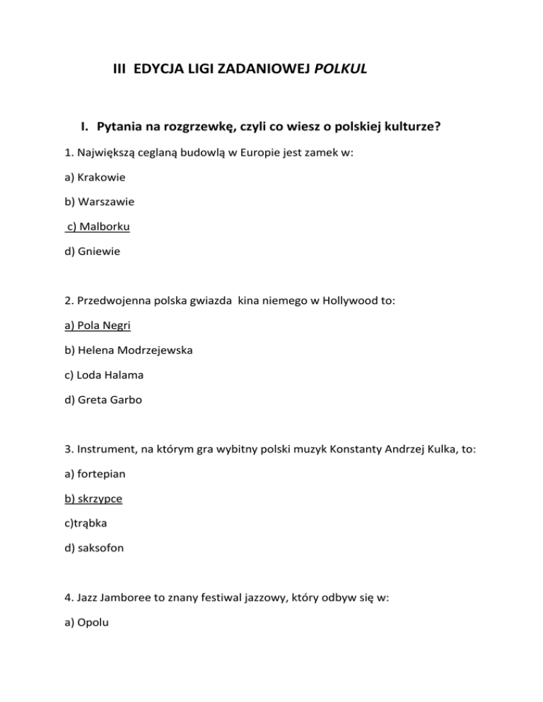 III EDYCJA LIGI ZADANIOWEJ POLKUL I. Pytania na rozgrzewkę