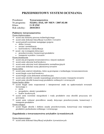 PRZEDMIOTOWY SYSTEM OCENIANIA Przedmiot: Nr programu: Klasa: Rok szkolny: Towaroznawstwo 522[01] /ZSZ, SP/ MEN / 2007.02.08 I i II ZSZ 2010/2011 Podstawy towaroznawstwa Ocena dopuszczająca uczeń zna elementy procesu technologicznego uczeń umie dokonać klasyfikacji wyrobów i towarów uczeń potrafi rozróżniać następujące pojęcia: dobra i towary norma i normalizacja kod kreskowy i identyfikacja uczeń zna wymagania dotyczące: przechowywania i konserwacji produktów transportu wyrobów i towarów Ocena dostateczna uczeń zna powiązania towaroznawstwa z innymi naukami uczeń umie odczytać kod kreskowy uczeń umie odczytać treść dokumentów normalizacyjnych uczeń umie dokonać oceny jakościowej towarów Ocena dobra uczeń umie omówić dziedziny, które są powiązane z technologią i towaroznawstwem uczeń biegle czyta kod kreskowy uczeń biegle czyta dokument normalizacyjny uczeń umie określić warunki racjonalnego przechowywania i transportu towarów uczeń umie określić konserwację produktów roślinnych i zwierzęcych Ocena bardzo dobra uczeń biegle umie rozpoznawać i interpretować znaki na opakowaniach towarach korzystając z: norm prospektów, ulotek i poradników kodów kreskowych uczeń umie rozróżnić niezgodność i wady produktów oraz określić przyczyny ich powstania uczeń umie wskazać prawidłowe zasady dotyczące przechowywania, konserwacji i transportu produktów Ocena celująca uczeń biegle określa i dobiera zasady przechowywania, konserwacji oraz transportu produktów pochodzenia roślinnego i zwierzęcego Zagadnienia z towaroznawstwa artykułów żywnościowych Ocena dopuszczająca uczeń umie dokonać klasyfikacji artykułów żywnościowych uczeń zna działy i gałęzie gospodarki wytwarzające żywność rozróżni podstawowe rodzaje zbóż klasyfikuje mąkę wg różnych kryteriów zaproponuje warunki prawidłowego przechowywania mąki dokona oceny organoleptycznej mąki oraz oceni jej jakość porównując rzeczywiste cechy z wymaganiami jakościowymi zdefiniuje kasze oraz dokona ich podziału zaproponuje warunki prawidłowego przechowywania kasz dokona oceny organoleptycznej kaszy oraz oceni jej jakość porównując rzeczywiste cechy z wymaganiami jakościowymi zdefiniuje otręby wyjaśni co należy rozumieć pod pojęciem makaron, klasyfikuje makarony zaproponuje warunki prawidłowego przechowywania makaronów oceni organoleptycznie makaron definiuje pieczywo, klasyfikuje pieczywo zaproponuje warunki prawidłowego przechowywania pieczywa rozróżnia wady pieczywa, klasyfikuje wady dokona podziału ziemniaków wg różnych kryteriów zaproponuje warunki prawidłowego przechowywania ziemniaków klasyfikuje i charakteryzuje przetwory ziemniaczane zaproponuje warunki przechowywania przetworów ziemniaczanych klasyfikuje owoce określić warunki prawidłowego przechowywania, pakowania i transportu owoców rozpoznaje i charakteryzuje różne owoce krajowe i południowe dokona podziału przetworów owocowych na grupy, scharakteryzuje je określi warunki prawidłowego przechowywania przetworów z owoców dokona oceny sensorycznej wybranych przetworów owocowych klasyfikuje warzywa określić warunki przechowywania, pakowania i transportu warzyw rozpoznaje i charakteryzuje różne warzywa dokona oceny sensorycznej wybranych warzyw dokona podziału przetworów warzywnych na grupy, scharakteryzuje je określi warunki prawidłowego przechowywania przetworów z warzyw dokona oceny sensorycznej wybranych przetworów warzywnych klasyfikuje grzyby, charakteryzuje je określi warunki przechowywania grzybów określi wymagania jakościowe dla grzybów surowych przeznaczonych do sprzedaży wymieni gatunki handlowe cukru białego, charakteryzuje je określi warunki przechowywania cukru dokona podziału wyrobów cukierniczych na grupy, poda przykłady określi warunki przechowywania wybranych wyrobów cukierniczych dokona oceny jakości wybranych wyrobów cukierniczych wg obowiązującej normy dokona klasyfikacji miodu wg różnych kryteriów określi warunki przechowywania miodu wymieni główne składniki odżywcze w mleku wymieni gatunki mleka spożywczego dostępne na rynku przedstawi podział przetworów mlecznych, do każdej z grup podaj 1 przykład wymieni główne składniki odżywcze mięsa potrafi wskazać na schemacie elementy tuszy wieprzowej klasyfikuje wędliny wymieni główne gatunki ptactwa przeznaczonego do spożycia wymieni główne składniki odżywcze mięsa drobiowego, ryb i przetwory z ryb wie co to jest kawior definiuje tłuszcze wymienia tłuszcze do smarowania pieczywa definiuje używki i klasyfikuje zna podstawowe gatunki kawy, herbaty i tytoniu klasyfikuje przyprawy roślinne, wódki, piwo, wino, napojów bezalkoholowych i wody mineralnej Ocena dostateczna u czeń umie dokonać klasyfikacji artykułów żywnościowych wg różnych kryteriów uczeń zna czynniki wpływające na wartość odżywczą artykułów żywnościowych wyróżni wymagania sanitarno - higieniczne obowiązujące w procesie obrotu żywnością narysuje przekrój poprzeczny ziarna zbożowego oraz zaznaczy na tym przekroju podstawowe elementy budowy ziarna zbożowego rozpoznaje mąki określi wartość odżywczą mąki wymieni szkodniki mąki oraz określi sposoby walki z tymi szkodnikami rozpoznaje kasze określi wartość odżywczą kasz rozpoznaje makarony określi wartość odżywczą makaronów, cukru, ziemniaków, owoców i grzybów rozpoznaje pieczywo różnego rodzaju określi wartość odżywczą pieczywa, udzieli porady na temat sprzedawanego pieczywa klasyfikuje i charakteryzuje wybrane przetwory z grzybów określi warunki przechowywania przetworów z grzybów dokona oceny organoleptycznej pieczywa oraz oceni jego jakość porównując rzeczywiste cechy z wymaganiami jakościowymi odczyta i zinterpretuje oznakowania umieszczone na opakowaniach lub etykietach przetworów warzywnych odczyta oznaczenia umieszczone na opakowaniu jednostkowym wybran
