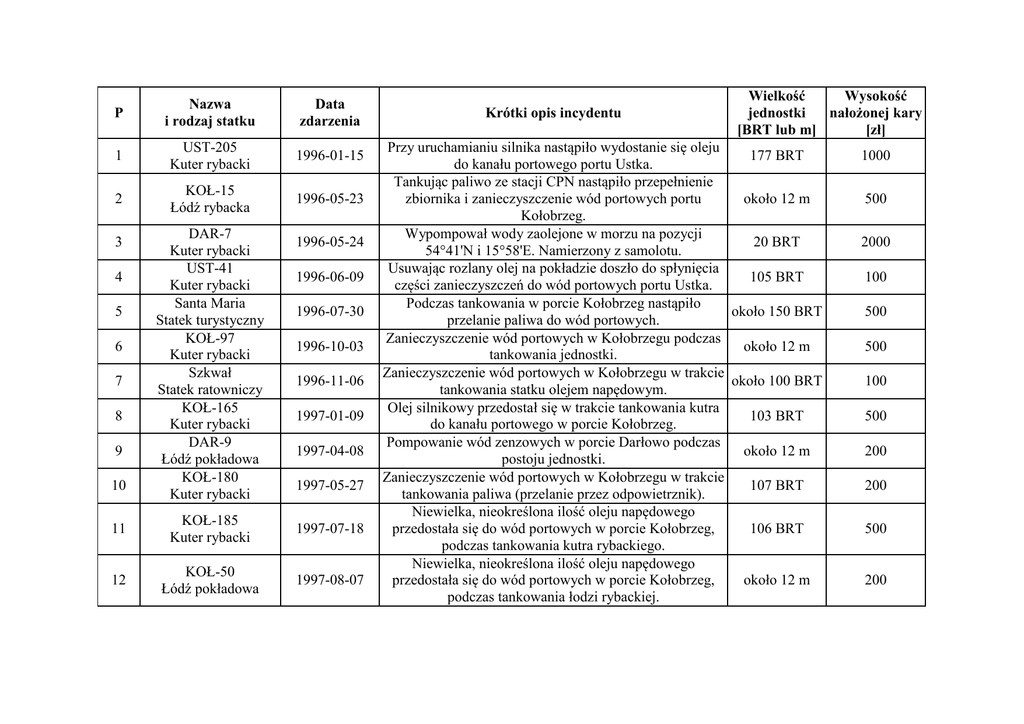 P Nazwa i rodzaj statku Data zdarzenia 1 UST-205 Kuter rybacki 1996-01-15 2 KOŁ-15 Łódź rybacka 1996-05-23 3 4 5 6 7 8 9 10 DAR-7 Kuter rybacki UST-41 Kuter rybacki Santa Maria Statek turystyczny KOŁ-97 Kuter rybacki Szkwał Statek ratowniczy KOŁ-165 Kuter rybacki DAR-9 Łódź pokładowa KOŁ-180 Kuter rybacki 1996-05-24 1996-06-09 1996-07-30 1996-10-03 1996-11-06 1997-01-09 1997-04-08 1997-05-27 11 KOŁ-185 Kuter rybacki 1997-07-18 12 KOŁ-50 Łódź pokładowa 1997-08-07 Krótki opis incydentu Wielkość Wysokość jednostki nałożonej kary [BRT lub m] [zł] Przy uruchamianiu silnika nastąpiło wydostanie się oleju 177 BRT do kanału portowego portu Ustka. Tankując paliwo ze stacji CPN nastąpiło przepełnienie zbiornika i zanieczyszczenie wód portowych portu około 12 m Kołobrzeg. Wypompował wody zaolejone w morzu na pozycji 20 BRT 54°41'N i 15°58'E. Namierzony z samolotu. Usuwając rozlany olej na pokładzie doszło do spłynięcia 105 BRT części zanieczyszczeń do wód portowych portu Ustka. Podczas tankowania w porcie Kołobrzeg nastąpiło około 150 BRT przelanie paliwa do wód portowych. Zanieczyszczenie wód portowych w Kołobrzegu podczas około 12 m tankowania jednostki. Zanieczyszczenie wód portowych w Kołobrzegu w trakcie około 100 BRT tankowania statku olejem napędowym. Olej silnikowy przedostał się w trakcie tankowania kutra 103 BRT do kanału portowego w porcie Kołobrzeg. Pompowanie wód zenzowych w porcie Darłowo podczas około 12 m postoju jednostki. Zanieczyszczenie wód portowych w Kołobrzegu w trakcie 107 BRT tankowania paliwa (przelanie przez odpowietrznik). Niewielka, nieokreślona ilość oleju napędowego przedostała się do wód portowych w porcie Kołobrzeg, 106 BRT podczas tankowania kutra rybackiego. Niewielka, nieokreślona ilość oleju napędowego przedostała się do wód portowych w porcie Kołobrzeg, około 12 m podczas tankowania łodzi rybackiej. 1000 500 2000 100 500 500 100 500 200 200 500 200 13 DAR-40 Kuter rybacki 1997-08-14 14 DWI-3 Łódź pokładowa 1997-08-19 15 KOŁ-179 Kuter rybacki 1997-10-16 16 GDY-1 Kuter rybacki 1997-10-23 17 18 19 20 21 22 23 24 25 KOŁ-5 Kuter rybacki DAR-169 Kuter rybacki KOŁ-174 Kuter rybacki ŁEB-98 Kuter rybacki POGŁĘBIARKA Łęgowski KOŁ-178 Kuter rybacki DZI-54 Łódź rybacka UST-49 Łódź rybacka KOŁ-178 Kuter rybacki 1997-11-17 1998-03-31 1998-07-31 1998-07-31 1998-08-04 1998-08-31 1998-10-08 1998-11-08 1999-01-22 Zanieczyszczenie powietrza i wód portowych pyłem z 79 BRT piaskowania kadłuba kutra w porcie Darłowo. Niewielka, nieokreślona ilość oleju napędowego przedostała się do wód portowych w porcie Kołobrzeg, około 10 m podczas tankowania łodzi rybackiej. Wybicie paliwa przez odpowietrznik do wód portowych w 107 BRT porcie Kołobrzeg. Około 20 litrów oleju napędowego przedostało się do kanału portowego w porcie Kołobrzeg podczas tankowania około 100 BRT kutra. Przelanie paliwa podczas tankowania jednostki w porcie 108 BRT Kołobrzeg. W czasie balastowania jednostki przelało się paliwo 106 BRT poprzez odpowietrznik do wód portowych portu Darłowo. Zanieczyszczenie wód portowych portu Kołobrzeg 114 BRT podczas tankowania jednostki. Zanieczyszczenie wód portowych portu Kołobrzeg 184 BRT podczas tankowania jednostki. Awaria hydrauliki klap refulacyjnych (pęknięcie przewodu elastycznego). Płyn hydrauliczny HV-46 w ilości około 1014 BRT 1000 litrów przedostał się do morza. Podczas awarii statek znajdował się na redzie portu Kołobrzeg. Zanieczyszczenie wód portowych portu Kołobrzeg 107 BRT podczas tankowania jednostki. Podczas przelewania paliwa z beczki do jednostki około 12 m nastąpiło zanieczyszczenie wód portowych portu Ustka. Zanieczyszczenie wód portowych portu Ustka podczas około 12 m tankowania jednostki. Zanieczyszczenie wód portowych portu Kołobrzeg 107 BRT podczas tankowania jednostki. 200 200 300 1800 200 1000 200 200 1000 200 1000 800 100 26 27 28 29 30 31 32 33 34 35 36 37 38 39 DZI-2 Łódź rybacka Bunkierka BGM Ewa MRZ-7 Kuter rybacki KOŁ-97 Kuter rybacki KOŁ-47 Kuter rybacki KOŁ-125 Kuter rybacki m/s CUNENE p.m. Nassau band. Bahama ŚWI-1 Łódź rybacka KOŁ-114 Kuter rybacki KOŁ-125 Kuter rybacki KOŁ-72 Kuter rybacki KOŁ-123 Kuter rybacki KOŁ-170 Kuter rybacki KOŁ-114 Kuter rybacki 2000-08-16 2001-01-25 2001-02-17 2001-02-17 2001-03-07 2001-09-07 2001-11-20 2001-11-27 2001-12-07 2001-12-13 2002-01-09 2002-01-10 2002-01-17 2002-02-10 Wyciek oleju z prawej burty jednostki do wód portowych portu Kołobrzeg. Z powodu braku dozoru przy tankowaniu nastąpił rozlew i zanieczyszczenie wód portowych portu Kołobrzeg. Zanieczyszczenie podczas stacjonowania w porcie Kołobrzeg, nabrzeża olejem z remontowanego silnika. Składowanie beczek z wodami w miejscu niedozwolonym. Remontując kuter zanieczyszczono wody kanału substancją ropopochodną. Zanieczyszczenie na pełnym morzu, w wyniku awarii hydrauliki kutra, wykryte z samolotu przez Morski Oddział Straży Granicznej w Gdańsku. Wyciek do wód portowych oleju hydraulicznego po awarii układu rozładunkowego jednostki cumującej przy nabrzeżu zbożowym portu Kołobrzeg. Zanieczyszczenie wód portowych farbą podczas malowania jednostki. Wyciek do wód portowych oleju z pokładu jednostki cumującej przy nabrzeżu portu Kołobrzeg. Wyciek z wału śrubowego jednostki do wód portowych portu Kołobrzeg. Wyciek oleju silnikowego z pokładu kutra do wód portowych portu Kołobrzeg (pow. zan. ok. 6 m2). Uszkodzenie chłodnicy i wyciek oleju do wód portowych portu Kołobrzeg (pow. ok. 20 m2). Wyciek oleju silnikowego do wód portowych portu Kołobrzeg (awaria płatu śrubowego) - pow. zan. ok. 6 m2. Wyciek oleju hydraulicznego do wód portowych portu Kołobrzeg (pow. ok. 9 m2). około 12 m 100 nu 500 nu 500 nu 100 nu 100 106 BRT 1000 około 1300 DWT 500 około 10 m 100 około 17 m 100 106 BRT 500 121 BRT 700 nu 500 106 BRT 300 220 BRT 300 40 KOŁ-47 Kuter ryb