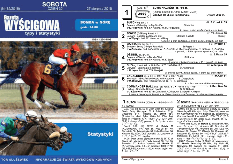 godz. 14 00 1 1 SUMA NAGRÓD 15 750 zł. (I-9000; II-3600; III-1800; IV-900; V-450) Gonitwa dla 3l. i st. koni II grupy. Dystans 2000 m. dż. P.Krowicki 55 BUTCH og. gn. 3 l. Belenus - Baheejay po Big Shuffle tr K.Rogowski, hod. SK Krasne, wł. M. Rogowska St.Monika k. czarn. z biał. szarfami w X, r. i cz. białe 2 3 4 5 6 7 BOWIE (GER) og. kaszt. 4 l. dż. T.Lukasek 60 Samum - Baselga po Second Set St.Black & White okulary tr A.Wyrzyk, hod. W. Heinz, wł. M.Biały k. niebie. z biał. podkową, r. niebie. w biał. gwiazdy, cz. biał. (-3) I.Wójcik 57 BARITONE og. gn. 5 l. Ecosse - Becky Gold po Java Gold St.Pegaz II tr A.Zielińska, hod. A.Zieliński, wł. A. Zieliński, J. Mierzwa Zielińska, R. Zieliński, K. Zielińska k. granat., r. żółte z granat. opaskami, cz. żółta dż. S.Mazur 55 DŻEBEL og. gn. 3 l. Belenus - Dżersis po Be My Chief St.Starka tr K.Rogowski, hod. SK Krasne, wł. K.Stoch k. granat. z białymi szarfami w X, r. granat., cz. biała dż. A.Turgaev 60 SUO og. kaszt. 6 l. 165-184-19,75 / 165-186-19,5 Cloword - Sordina po In Camera St.Annamaria tr M.Łojek, hod. i wł. T.Sobierajski k. zielono-czerw. z białą szarfą, r. białe, cz. biało-czerw. (-1) M.Abik 51 EXCALIBUR og. s. 3 l. 159-178-21 / 163-179-20 Youmzain - Electra Deelites po With Approval St.Długosiodło tr W.Olkowski, hod. R.Gorczyca, wł. G., R. i K. Gorczyca k., r. i cz. w czerw.-żółto-czarne pasy dż. A.Reznikov 60 COMMANDER HALL (GB) og. kaszt. 5 l. 161-183-19 / 163Halling - Dramatic Solo po Nayef St.Dr Dahess tr J.Kozłowski, hod. E. i D.Cantillon i A.Driver, wł. Z.Górski i K.Mirpuri k. biała z czerwonymi karami, r. w biało-czerwoną szachownicę, cz. biała w czerwone pasy 1 BUTCH ’15-5-9 (1050) ’16-5-4-6-1-1-71-7 (22050) 2.07. Hcp. (II) 15750 zł. Cheri-Cheri 56, Królowa Grodu 541/2, Harpagan 62 i Subiectum 621/2, Choupette 611/2, Infigenia 56, Butch 531/2 (A.Kabardov, dyst. 2-1-y, 400m 2-i, 150m 7-y), Time of Freedom 471/2; 1400-1’24,2” (24,4-29,630,2); tor l.elast. (3,0), pewnie, dł. 2 - 1/2 - łeb w łeb 2 - 1 - 11/2 - 11/2. Sopot 9.07. (III) 12250 zł. Butch 60 (K.Grzybowski, 1-y), Felix 56, Free-Lu 58, Hot Chocolate 56, Triumfatorka 58, Helio Bareliere 56, Kasawa 55; 2000-2’06,6”; tor lekki (2,2), pewnie, dł. 3 - 3/4 - 11/2 - 2 - 21/2 - daleko. 14.08. Deer Leapa (Specjalna) (kat.B) 36750 zł. Calmir 56, Madjani 56, Party Animal 56, Tea 55, Bronislav 57, Invicta Varsovia 55, Butch 53 (A.Reznikov, pocz. 2-3-i, pr. odpada); 1300-1’17,8” (19,1-28,7-30); tor elast. (3,5), w walce, szyja - łeb 1 - łeb - 21/2 - 17. Gazeta Wyscigowa 2 BOWIE ’14-6-3-5-3 (4275) ’15-5-3-2-1-22-1-2-3 (25950) ’16-6-2-2-1-2 (17640) 29.05. (II) 15750 zł. Height of Beauty 53, Bowie 59-okulary (M.Abik, dyst. 2-1-y, 300m 2-i), Newman 60, Commander Hall 60, Dżenita 58, Salzburg 60, Crucis Abbey 62, Lascadell 60; 1800-1’52,4” (20,231,2-30,6-30,4); tor l.elast. (3,2), s.wysył., dł. 3/4 szyja - 2 - 3/4 - szyja - 3 - 8. 18.06. (III) 12250 zł. Bowie 62-okulary (M.Abik, rusz. 2-i, dyst. 1-y), Adanero 60, Szarotka 58, Taxiformissbyron 58, Amadora 60, Just Love 57, Dakard 62, Ceylon 57, Dżenita 60, Dunayka 56, Lascadell 62, Jarmuż 59; 1800-1’51,1” (20,5-29,729,9-31,0); tor l.elast. (3,1), s.wysył., szyja - 2 szyja - 1 - łeb - 3/4 - 1/2 - 3/4 - 1/2 - 2 - 21/2. 23.07. Demon Cluba (I) 18550 zł. Masterpower 57, Bowie 56-okulary (M.Abik, 2-i), Neo 52, Nadworna 59, Baritone 57, Dżango 51; 20002’05,3” (34,2-31,0-30,8-29,3); tor l.elast. (3,1), w walce, szyja - 11/2 - 11/4 - 51/2 - 8. Strona 2 3 BARITONE ’13-3-2-2 (9500) ’14-3-5 ’16-1-3- (1400) ’15-1-3-3-1-2-1-3-1 (39000) 10-5 (9330) 21.05. (II) 15750 zł. Wiedzmin 60, Salamija 58, Baritone 60 (T.Lukasek, dyst. 4-8-y, 400m 4-y, 50m 3-i), Captain Aragorn 60, Invicta Varsovia 56, Sambor 60, Party Animal 60, Tybet 60; 14001’24,4” (24,9-28,9-30,6); tor l.elast. (3,0), wysył., dł. 3 /4 - 1/2 - szyja - 11/4 - szyja - 9 - 10. 12.06. (II) 15750 zł. Captain Aragorn 60, Invicta Varsovia 58, Hard Work 59, Crucis Abbey 62, Novitor 60, Tybet 57, Party Animal 60, Super Quick 58, Admiral Quest 58, Baritone 60 (T.Lukasek, dyst. 3-7-y, 400m 8-y, 300m 10-y), Trim 56; 16001’36,5” (7,9-28,4-29,4-30,8); tor l.elast. (2,8), s.wysył., dł. 3/4 - 3/4 - 1/2 - 21/2 - 21/2 - 1/2 - 3/4 - szyja 11/2 - 17. 23.07. Demon Cluba (I) 18550 zł. Masterpower 57, Bowie 56, Neo 52, Nadworna 59, Baritone 57 (T.Lukasek, 5-y), Dżango 51; 2000-2’05,3” (34,231,0-30,8-29,3); tor l.elast. (3,1), w walce, szyja 11/2 - 11/4 - 51/2 - 8. 4 DŻEBEL ’15-6-6-4-4 (1350) ’16-4-4-9-11-3-8-7 (17200) 3.07. (II) 15750 zł. Tabor 59, Defar 58, Dżebel 59 (S.Mazur, dyst. 1-y, 300m 2-i, 100m 3-i), Gared 58, Cordiali Saluti 59, Dentra 54; 1400-1’28,1” (27,430,8-29,9); tor elast. (3,3), w walce, łeb - 11/2 - szyja - 11/4 - 9. 30.07. Hcp. (II) 15750 zł. Dacosse 531/2, Choupette 56, Finalistka 581/2, Harpagan 58, Hard Work 631/2, Subiectum 581/2, Tybet 581/2, Dżebel 521/2 (A.Kabardov, dyst. 4-8-y); 1600-1’39,6” (8,029,4-30,5-31,7); tor elast. (3,8), w walce, łeb - 2 szyja - 1/2 - 3 - 11/2 - 1. 14.08. (II) 15750 zł. Emperor Ajeez 63, Harpagan 57, Novelina 56, Crafty Business 56, Finalistka 53, Campo di Fiori 59, Dżebel 57 (A.Reznikov, dyst.45-y, pr. odpada); 1300-1’19,1” (19,8-29-30,3); tor elast. (3,5), wysył., dł. 1/2 - szyja - 1/2 - kr.łeb - 51/2 41/2. 5 SUO ’12-2-2 (4800) ’13-1-5-6-1-2-3-3-1 (75925) ’14-8-3-3-5-5-2-5-7 (25300) ’15-31-1-5-7-4-4-5-2 (28900) ’16-4-1-2-2-1 (23460) 26.06. (II) 15750 zł. Commander Hall 60, Suo 61 (B.Giedyk, dyst. 2-i, 500m 1-y, 50m 2-i), Newman 60, Pereditta 58, Crucis Abbey 61, Legionary 60; 2000-2’09,1” (35,3-31,4-30,4-32,0); tor elast. (3,3), wysył., szyja - 8 - 6 - 5 - 11. 24.07. (III) 12250 zł. Commander Hall 61, Suo 61 (A.Turgaev, dyst. 7-2-i, 500m 1-y, 400m 2-i), Novitor 60, Newman 60, Nando of Budysin 56, Sopran Pokeer 57, Amoreena 54; 2000-2’05,1” Gazeta Wyscigowa (34,4-30,6-29,5-30,6); 