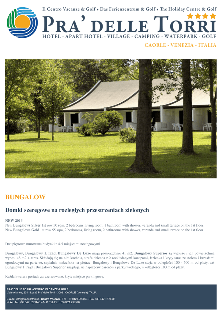 BUNGALOW Domki szeregowe na rozległych przestrzeniach zielonych NEW 2016 New Bungalows Silver 1st row 50 sqm, 2 bedrooms, living room, 1 bathroom with shower, veranda and small terrace on the 1st floor. New Bungalows Gold 1st row 55 sqm, 2 bedrooms, living room, 2 bathrooms with shower, veranda and small terrace on the 1st floor Dwupiętrowe murowane budynki z 4-5 miejscami noclegowymi. Bungalowy, Bungalowy 1. rząd, Bungalowy De Luxe mają powierzchnię 41 m2. Bungalowy Superior są większe i ich powierzchnia wynosi 48 m2 + taras. Składają się na nie: kuchnia, strefa dzienna z 2 rozkładanymi kanapami, łazienka i kryty taras ze stołem i krzesłami ogrodowymi na parterze, sypialnia małżeńska na piętrze. Bungalowy i Bungalowy De Luxe stoją w odległości 100 - 500 m od plaży, zaś Bungalowy 1. rząd i Bungalowy Superior znajdują się naprzeciw basenów i parku wodnego, w odległości 100 m od plaży. Każda kwatera posiada zarezerwowane, kryte miejsce parkingowe. PRA' DELLE TORRI - CENTRO VACANZE & GOLF Viale Altanea, 201 - Loc.tà Pra' delle Torri - 30021 CAORLE (Venezia) ITALIA E-mail: [email protected] - Centro Vacanze: Tel. +39 0421.299063 - Fax +39 0421.299035 Hotel: Tel. +39 0421.299445 - Golf: Tel./Fax +39 0421.299570 Usługi i wyposażenie wliczone w cenę w Bungalow i Bungalow 1. rząd: elektryczność/woda/gaz, kuchenka mikrofalowa, lodówka, łazienka z prysznicem, TV Sat, cotygodniowa zmiana bielizny pościelowej, sprzątanie końcowe, wstęp na baseny i animacja. Usługi i wyposażenie wliczone w cenę w Bungalow De Luxe: elektryczność/woda/gaz, kuchenka mikrofalowa, lodówka, łazienka z prysznicem, suszarka, TV Sat, klimatyzacja, cotygodniowa zmiana bielizny pościelowej i ręczników, usługi plażowe, wstęp na baseny i animacja. Usługi i wyposażenie wliczone w cenę w Bungalow Superior: elektryczność/woda/gaz, kuchenka mikrofalowa, lodówka, zmywarka, łazienka z prysznicem, suszarka, TV Sat, klimatyzacja, cotygodniowa zmiana bielizny pościelowej i ręczników, usługi plażowe, wstęp na baseny i animacja. Osoby niepełnosprawne: Niektóre z Bungalowów De Luxe (typu B) są dostosowane do potrzeb osób niepełnosprawnych. PRA' DELLE TORRI - CENTRO VACANZE & GOLF Viale Altanea, 201 - Loc.tà Pra' delle Torri - 30021 CAORLE (Venezia) ITALIA E-mail: [email protected] - Centro Vacanze: Tel. +39 0421.299063 - Fax +39 0421.299035 Hotel: Tel. +39 0421.299445 - Golf: Tel./Fax +39 0421.299570 Powered by TCPDF (www.tcpdf.org)