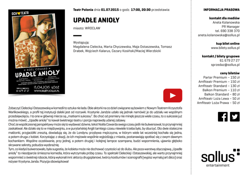 Teatr Polonia dnia 01.07.2015 o godz. 17:00, 20:30 przedstawia: UPADŁE ANIOŁY miasto: WROCŁAW Występują: Magdalena Cielecka, Marta Chyczewska, Maja Ostaszewska, Tomasz Drabek, Wojciech Kalarus, Cezary Kosiński/Maciej Wierzbicki INFORMACJA PRASOWA kontakt dla mediów Aneta Kolanowska PR Manager tel. 690 338 370 [email protected] kup bilet online www.bilety.sollus.pl kontakt / bilety grupowe 61 679 27 27 [email protected] REŻ Y ERI A KRY TYN A JAN DA PRE IER A 17 RU DN IA 20 14 rezerwacja telefoniczna 13.04.2015 ŁódŹ 61 679 27 27 www.bilety.sollus.pl Zobaczyć Cielecką i Ostaszewską w komedii to sztuka nie lada. Obie aktorki na co dzień związane są bowiem z Nowym Teatrem Krzysztofa Warlikowskiego, a profil tej instytucji daleki jest od rozrywki. Krystynie Jandzie udało się jednak namówić je do udziału we wspólnym przedsięwzięciu. I to one w głównej mierze są „matkami sukcesu”. Bo choć od premiery nie minęło jeszcze wiele czasu, to o sukcesie już można mówić. „Upadłe anioły” to kawał świetnego teatru i porcja naprawdę udanej zabawy. Choć ze współczesnej perspektywy może się to wydawać dziwne, tekst Noëla Cowarda swego czasu jeśli nie bulwersował, to przynajmniej zaskakiwał. Ale działo się to w międzywojniu, a w purytańskiej Anglii tamtego czasu niewiele trzeba było, by oburzyć. Oto dwie stateczne małżonki, przyjaciółki zresztą, dowiadują się, że do Londynu przybywa mężczyzna, w którym wiele lat wcześniej kochała się jedna, a potem druga z kobiet. Korzystając z okazji, że ich mężowie wspólnie wyjeżdżają z miasta, postanawiają spotkać się z owym dawnym kochankiem. Wspólne oczekiwanie, przy jednej, a potem drugiej i kolejnej lampce szampana, budzi wspomnienia, ujawnia głęboko skrywane sekrety, pobudza wyobraźnię. Tym, co kiedyś bulwersowało, była sugestia, że kobieta może nie dochować czystości aż do ślubu. Ale poza warstwą obyczajową „Upadłe anioły” to nieodparcie śmieszna komedia, która wytrzymała próbę czasu. To spektakl Cieleckiej i Ostaszewskiej, ale warto przynajmniej wspomnieć o świetnej robocie, którą wykonali inni: aktorzy drugoplanowi, twórcy kostiumów i scenografii (wypisz wymaluj art déco) oraz reżyser Krystyna Janda. Pozycja obowiązkowa! ceny biletów Parter Premium – 150 zł Amfiteatr Premium – 150 zł Amfiteatr Standard – 130 zł Balkon Premium – 110 zł Balkon Standard – 80 zł Amfiteatr Loża Lewa – 50 zł Amfiteatr Loża Prawa – 50 zł