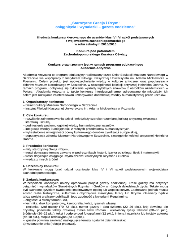 „Starożytne Grecja i Rzym: osiągnięcia i wynalazki – gazeta codzienna” III edycja konkursu kierowanego do uczniów klas IV i VI szkół podstawowych z województwa zachodniopomorskiego w roku szkolnym 2015/2016 Konkurs pod patronatem Zachodniopomorskiego Kuratora Oświaty Konkurs organizowany jest w ramach programu edukacyjnego Akademia Antyczna Akademia Antyczna to program edukacyjny realizowany przez Dział Edukacji Muzeum Narodowego w Szczecinie we współpracy z Instytutem Filologii Klasycznej Uniwersytetu im. Adama Mickiewicza w Poznaniu. Celem projektu jest upowszechnianie wiedzy o kulturze antycznej oraz popularyzacja zbiorów Muzeum Narodowego w Szczecinie, w szczególności kolekcji antycznej Heinricha Dohrna. W ramach programu odbywają się cyklicznie wykłady wybitnych znawców z ośrodków akademickich w Polsce. Akademia Antyczna to także konkursy interdyscyplinarne, adresowane do młodzieży. Ich celem jest rozwijanie zainteresowań i zdobywanie dodatkowej wiedzy humanistycznej przez uczniów. 1. Organizatorzy konkursu: – Dział Edukacji Muzeum Narodowego w Szczecinie – Instytut Filologii Klasycznej Uniwersytetu im. Adama Mickiewicza w Poznaniu 2. Cele konkursu: – rozwijanie zainteresowania dzieci i młodzieży szeroko rozumianą kulturą antyczną zwłaszcza literaturą i sztuką, – podniesienie poziomu ogólnej wiedzy humanistycznej uczniów, – integracja wiedzy i umiejętności z różnych przedmiotów humanistycznych, – wykształcenie umiejętności oceny kulturowego dorobku cywilizacji europejskiej, – popularyzacja zbiorów Muzeum Narodowego w Szczecinie, szczególnie kolekcji antycznej Heinricha Dohrna. 3. Przedmiot konkursu: – mity starożytnej Grecji i Rzymu. – treści dotyczące tematu zawarte w podręcznikach historii, języka polskiego, fizyki i matematyki – treści dotyczące osiągnięć i wynalazków Starożytnych Rzymian i Greków – wiedza z innych źródeł 4. Uczestnicy konkursu: W konkursie mogą brać udział uczniowie klas IV i VI szkół podstawowych województwa zachodniopomorskiego. 5. Zadania konkursowe: W zespołach klasowych należy opracować projekt gazety codziennej. Treść gazety ma dotyczyć osiągnięć i wynalazków Starożytnych Rzymian i Greków w różnych dziedzinach życia. Teksty mogą być tworzone językiem swobodnie inspirowanym epoką lub współczesnym. Zachowane jednak muszą zostać realia historyczne, kulturowe i obyczajowe starożytnej Grecji lub Rzymu. Oceniany będzie także projekt graficzny publikacji i jego zgodność z kryteriami Regulaminu: – objętość: 4 strony formatu A3, – technika: druk komputerowy, kserografia, kolaż, rysunek własny, – czcionka: tytuł gazety (70–72 pkt.), numer gazety i data dzienna (22–26 pkt.), krój dowolny, ale czytelny; pozostałe teksty czcionką Times New Roman i wielkością: tytuły tekstów (30–36 pkt.), śródtytuły (20–22 pkt.), tekst i podpisy pod fotografiami (12 pkt.), imiona i nazwiska lub inicjały autorów (do 10 pkt.), stopka redakcyjna (do 10 pkt.), – gazeta powinna zawierać następujące tematy i gatunki dziennikarskie: a) wydarzenie dnia (relacja prasowa), 1 b) list do Redakcji, c) wywiad prasowy, d) reklama, e) sport, kulinaria, moda, f) maksymalnie 5 fotografii (10cm x 15cm). 6. Projekt gazety należy złożyć osobiście lub przesłać pocztą na adres: Muzeum Narodowe w Szczecinie Dział Edukacji Ul. Wały Chrobrego 3 70-502 Szczecin z dopiskiem „KONKURS–GAZETA” do 22 kwietnia 2016 roku (decyduje data stempla pocztowego). Do projektu należy dołączyć dane zespołu redakcyjnego: imiona i nazwiska Redaktorów; numer, adres i telefon szkoły; imię i nazwisko nauczyciela prowadzącego. 7. Skład Komisji Konkursowej: – Monika Gapińska, dziennikarka Kuriera Szczecińskiego – dr Dariusz Kacprzak, dyrektor ds. naukowych Muzeum Narodowego w Szczecinie – Krystyna Milewska, kierownik Działu Edukacji Muzeum Narodowego w Szczecinie – Dorota Baumgarten-Szczyrska, pracownik Działu Edukacji Muzeum Narodowego w Szczecinie – Dorota Obalek, pracownik Działu Edukacji Muzeum Narodowego w Szczecinie. 8. Ogłoszenie wyników, wręczenie nagród i pokaz prac odbędzie się podczas uroczystości podsumowującej projekt edukacyjny Akademia Antyczna w roku szkolnym 2015/2016, 13 maja 2016 (piątek) o godz. 12.00 w Muzeum Narodowym w Szczecinie przy ulicy Wały Chrobrego 3. 9. We wszystkich sprawach organizacyjnych należy kontaktować się z sekretarzem Konkursu Krystyną Milewską Kierownik Działu Edukacji Muzeum Narodowego w Szczecinie tel. 91 43 15 269 lub 797 705 269 [email protected] Uwaga! Dzieci biorące udział w konkursie będą mogły uczestniczyć w bezpłatnych warsztatach dziennikarskich prowadzonych przez Panią Monikę Gapińską (dziennikarkę Kuriera Szczecińskiego) odbywających się w lutym i marcu 2016. Nauczycieli zainteresowanych zorganizowaniem warsztatów dla klasy prosimy o kontakt z: Dorota Obalek tel. 797 400 438 [email protected] 2