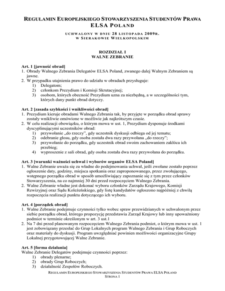 REGULAMIN EUROPEJSKIEGO STOWARZYSZENIA STUDENTÓW PRAWA ELSA POLAND UCHWALONY W DNIU 28 LISTOPADA 2009R. W SIERAKOWIE WIELKOPOLSKIM ROZDZIAŁ I WALNE ZEBRANIE Art. 1 [jawność obrad] 1. Obrady Walnego Zebrania Delegatów ELSA Poland, zwanego dalej Walnym Zebraniem są jawne. 2. W przypadku utajnienia prawo do udziału w obradach przysługuje: 1) Delegatom; 2) członkom Prezydium i Komisji Skrutacyjnej; 3) osobom, których obecność Prezydium uzna za niezbędną, a w szczególności tym, których dany punkt obrad dotyczy. Art. 2 [zasada szybkości i wnikliwości obrad] 1. Prezydium kieruje obradami Walnego Zebrania tak, by przyjęte w porządku obrad sprawy zostały wnikliwie omówione w możliwie jak najkrótszym czasie. 2. W celu realizacji obowiązku, o którym mowa w ust. 1, Prezydium dysponuje środkami dyscyplinującymi uczestników obrad: 1) przywołanie „do rzeczy”, gdy uczestnik dyskusji odbiega od jej tematu; 2) odebranie głosu, gdy osoba została dwa razy przywołana „do rzeczy”; 3) przywołanie do porządku, gdy uczestnik obrad swoim zachowaniem zakłóca ich przebieg; 4) wyproszenie z sali obrad, gdy osoba została dwa razy przywołana do porządku. Art. 3 [warunki ważności uchwal i wyborów organów ELSA Poland] 1. Walne Zebranie uważa się za władne do podejmowania uchwał, jeśli zwołane zostało poprzez ogłoszenie daty, godziny, miejsca spotkania oraz zaproponowanego, przez zwołującego, wstępnego porządku obrad w sposób umożliwiający zapoznanie się z tym przez członków Stowarzyszenia, na co najmniej 30 dni przed rozpoczęciem Walnego Zebrania. 2. Walne Zebranie władne jest dokonać wyboru członków Zarządu Krajowego, Komisji Rewizyjnej oraz Sądu Koleżeńskiego, gdy listę kandydatów ogłoszono najpóźniej z chwilą rozpoczęcia realizacji punktu dotyczącego ich wyboru. Art. 4 [porządek obrad] 1. Walne Zebranie podejmuje czynności tylko wobec spraw przewidzianych w uchwalonym przez siebie porządku obrad, którego propozycję przedstawia Zarząd Krajowy lub inny upoważniony podmiot w terminie określonym w art. 3 ust.1 2. Na 7 dni przed planowanym rozpoczęciem Walnego Zebrania podmiot, o którym mowa w ust. 1 jest zobowiązany przesłać do Grup Lokalnych program Walnego Zebrania i Grup Roboczych oraz materiały do dyskusji. Program uwzględniać powinien możliwości organizacyjne Grupy Lokalnej przygotowującej Walne Zebranie. Art. 5 [forma działania] Walne Zebranie Delegatów podejmuje czynności poprzez: 1) obrady plenarne; 2) obrady Grup Roboczych; 3) działalność Zespołów Roboczych. REGULAMIN EUROPEJSKIEGO STOWARZYSZENIA STUDENTÓW PRAWA ELSA POLAND STRONA 1 Art. 6 [obrady plenarne] Przedmiot obrad plenarnych stanowią w szczególności: 1) wybór Prezydium oraz Komisji Skrutacyjnej; 2) wybór Zarządu Krajowego, Komisji Rewizyjnej oraz Sądu Koleżeńskiego ELSA Poland; 3) rozpatrywanie projektów uchwał na podstawie rekomendacji zgłoszonych przez uprawnione podmioty; 4) uchwalanie budżetu Stowarzyszenia; 5) sprawy finansowe dotyczące wszystkich Grup Lokalnych; 6) głosowanie w przedmiocie absolutorium dla członków Zarządu Krajowego; 7) ocena działalności Stowarzyszenia; 8) kreowanie działań Stowarzyszenia. Art. 7 [prawo zorganizowania Walnego Zebrania] 1. Walne Zebranie podejmuje uchwałę o wyborze Grupy Lokalnej organizującej kolejne Walne Zebranie, po zapoznaniu się z prezentacjami zainteresowanych Grup Lokalnych. 2. Uchwałę, o której mowa w ust. 1, podejmuje się z uwzględnieniem możliwości Grup Lokalnych. 3. W sytuacji, gdy żadna Grupa Lokalna nie zgłosi się do organizacji Walnego Zebrania, Zarząd Krajowy organizuje Walne Zebranie sam albo w porozumieniu z wybraną przez siebie Grupą Lokalną. 4. Wiosenne Walne Zebranie odbywa się w kwietniu lub maju natomiast jesienne Walne Zebranie w listopadzie każdego roku. 5. Wybór miejsca i organizacja nadzwyczajnego Walnego Zebrania, o którym mowa w §21 ust. 3 zdanie 2 Statutu Europejskiego Stowarzyszenia Studentów Prawa ELSA Poland, zwanego dalej Statutem - jest obowiązkiem zwołującego. Art. 8 [rozpoczęcie Walnego Zebrania] Po sprawdzeniu kworum Sekretarz Generalny Zarządu Krajowego otwiera Walne Zebranie poprzez realizację pierwszego punktu porządku obrad. W przypadku jego nieobecności, Walne Zebranie otwiera inny członek Zarządu Krajowego. Art. 9 [zamknięcie Walnego Zebrania] Prowadzący obrady zamyka Walne Zebranie po zakończeniu realizacji ostatniego punktu porządku obrad. Art. 10 [rozwiązanie Walnego Zebrania] Prowadzący obrady zarządza rozwiązanie Walnego Zebrania, jeżeli liczba Delegatów na obradach plenarnych nie pozwala na podjęcie uchwały i jest mało prawdopodobne, by ta sytuacja mogła ulec zmianie w ciągu najbliższych 12 godzin. Art. 11 [legitymacja i obowiązki Delegatów] 1. Delegaci dostarczają na obrady plenarne wyciąg z protokołu Walnego Zebrania Grupy Lokalnej. 2. Wyciąg, o którym mowa w ust. 1 musi zawierać w szczególności: 1) datę i miejsce obrad; 2) określenie kworum i ilości obecnych osób uprawnionych do głosowania; 3) punkt stwierdzający wybór Delegatów wraz z wynikami głosowania; 4) podpis Sekretarza Generalnego Grupy Lokalnej; 5) pieczęć Grupy Lokalnej. 3. Delegata obowiązuje obecność i czynny udział w obradach plenarnych. Art. 12 [mandaty Delegatów] 1. Sekretarz Generalny Zarządu Krajowego przekazuje mandaty do głosowania Delegatom z Grup Lokalnych, którzy dostarczyli wyciąg, o którym mowa w art. 11. REGULAMIN EUROPEJSKIEGO STOWARZYSZENIA STUDENTÓW PRAWA ELSA POLAND STRONA 2 2. Sekretarz Generalny Zarządu Krajowego nie wydaje mandatów do głosowania Delegatom z Grup Lokalnych, które nie mają uregulowanej sytuacji finansowej względem Zarządu Krajowego. 3. W przypadku jego nieobecności, mandaty do głosowania przekazuje inny członek Zarządu Krajowego. Art. 13 [instrukcje dla Delegatów] Delegaci, głosując w czasie obrad plenarnych, nie są związani instrukcj