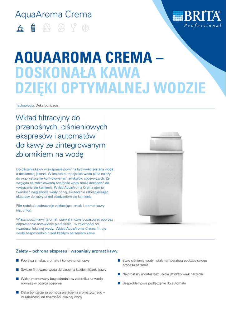 AquaAroma Crema AQUAAROMA CREMA – DOSKONAŁA KAWA DZIĘKI OPTYMALNEJ WODZIE Technologia: Dekarbonizacja Wkład filtracyjny do przenośnych, ciśnieniowych ekspresów i automatów do kawy ze zintegrowanym zbiornikiem na wodę Do parzenia kawy w ekspresie powinna być wykorzystana woda o doskonałej jakości. W krajach europejskich woda pitna należy do rygorystycznie kontrolowanych artykułów spożywczych. Ze względu na zróżnicowaną twardość wody może dochodzić do wytrącania się kamienia. Wkład AquaAroma Crema obniża twardość węglanową wody pitnej, skutecznie zabezpieczając ekspresy do kawy przed osadzaniem się kamienia. Filtr redukuje substancje zakłócające smak i aromat kawy (np. chlor). Właściwości kawy (aromat, pianka) można dopasować poprzez odpowiednie ustawienie pierścienia, w zależności od twardości lokalnej wody. Wkład AquaAroma Crema filtruje wodę bezpośrednio przed każdym parzeniem kawy. Zalety – ochrona ekspresu i wspaniały aromat kawy. Poprawa smaku, aromatu i konsystencji kawy S tałe ciśnienie wody i stała temperatura podczas całego procesu parzenia Świeżo filtrowana woda do parzenia każdej filiżanki kawy Najprostszy montaż bez użycia jakichkolwiek narzędzi W kład montowany bezpośrednio w zbiorniku na wodę, również w pozycji poziomej D ekarbonizacja za pomocą pierścienia aromatycznego – w zależności od twardości lokalnej wody Bezproblemowe podłączenie do automatu AquaAroma Crema Delektuj się wspaniałą kawą Wkłady filtracyjne do zastosowania w ekspresach do kawy ze zintegrowanym zbiornikiem na wodę (działanie na zasadzie zasysania). Wkłady filtracyjne AquaAroma Crema przeznaczone są do użytku w automatach do kawy ze specjalnie przygotowanymi, zintegrowanymi zbiornikami na wodę – woda jest zasysana przez wkład. Filtry do wody BRITA Professional są dopuszczone do kontaktu z żywnością na podstawie testów i monitoringu prowadzonego przez niezależne instytuty. Dzięki pierścieniowi aromatycznemu wydajność filtra AquaAroma Crema może być dopasowana do lokalnych właściwości wody. Aby prawidłowo ustawić pierścień, zgodnie z twardością wody lokalnej do każdego wkładu dołączony jest pasek testowy. Typowa wydajność – przy uwzględnieniu lokalnej twardości węglanowej 1 Ustawienie Twardość wody Wydajność1 Filiżanki 35 ml Filiżanki 150 ml Poziom A dla miękkiej wody 220 l 6.300 1.470 Poziom B dla średniotwardej wody 150 l 4.300 1.000 Poziom C dla twardej wody 80 l 2.300 540 AquaAroma Crema Wymiary pojemnika wkładu (szer. / wys. / gł.) 42,8 / 106,9 / 60,8 mm Temperatura wody na wejściu 4 – 30 °C Numer katalogowy Pack 1 101831 Podane wydajności wynikają z badań i obliczeń przeprowadzonych dla typowych zastosowań, warunków i typów urządzeń. Ze względu na wpływ zewnętrznych czynników (na przykład zmiennej jakości wody kranowej i / lub typu urządzenia) wartości te mogą być inne w rzeczywistości. PN: 502840-002b blösch.partner 02/15 Filtry BRITA przeznaczone są wyłącznie do wody dopuszczonej do spożycia przez ludzi. Centrala firmy BRITA GmbH Heinrich-Hertz-Straße 4 D – 65232 Taunusstein BRITA Polska Sp. z o.o. Ołtarzew, ul. Domaniewska 6 PL – 05 – 850 Ożarów Mazowiecki Tel.:+48 (0) 22 721 24 20 Fax:+48 (0) 22 721 24 49 [email protected] www.brita.pl