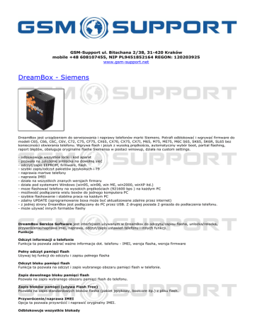 GSM-Support ul. Bitschana 2/38, 31-420 Kraków mobile +48 608107455, NIP PL9451852164 REGON: 120203925 www.gsm-support.net DreamBox - Siemens DreamBox jest urządzeniem do serwisowania i naprawy telefonów marki Siemens. Potrafi odblokować i wgrywać firmware do modeli C65, C66, C6C, C6V, C72, C75, CF75, CX65, CX70, CX75, CX7I, M65, M75, ME75, M6C S65, SK65, SK6R, SL65 bez konieczności otwierania telefonu. Wgrywa flash i jezyk z wysoką prędkościa, automatyczny wybór boot, partial flashing, raport błędów, obsługuje oryginalne flashe Siemensa w postaci winswup, działa na custom settings. - odblokowuje wszystkie locki i kod aparat pozwala na zalożenie simlocka na dowolną sieć odczyt/zapis EEPROM, firmware, flash szybki zapis/odczyt pakietów językowych i T9 naprawia martwe telefony naprawia IMEI działa na wszystkich znanych wersjach firmaru działa pod systemami Windows (win95, win98, win ME, win2000, winXP itd.) moze flashować telefony na wysokich prędkościach (921600 bps ) na każdym PC możliwość podłączenia wielu boxów do jednego komputera PC szybkie flashowanie i stabilna praca na każdym PC zdalny UPDATE (oprogramowanie boxa może być aktualizowane zdalnie przez internet) z jednej strony DreamBox jest podłączany do PC przez USB. Z drugiej posiada 2 gniazda do podłaczenia telefonu. może używać innych formatów flashy DreamBox Service Software jest interfejsem używanym w DreamBox do odczytu/zapisu flasha, unlocka/relocka, przywrócenie/naprawa imei, naprawa, odczyt/zapis ustawień telefonu i innych funkcji. Funkcje Odczyt informacji o telefonie Funkcja ta pozwala zebrać ważne informacje dot. telefonu - IMEI, wersja flasha, wersja firmware Pełny odczyt pamięci flash Używaj tej funkcji do odczytu i zapisu pełnego flasha Odczyt bloku pamięci flash Funkcja ta pozwala na odczyt i zapis wybranego obszaru pamięci flash w telefonie. Zapis dowolnego bloku pamięci flash Pozwala na zapis wybranego obszaru pamięci flash do telefonu. Zapis bloków pamięci (używa Flash Tree) Pozwala na zapis standardowych bloków flasha (pakiet językowy, bootcore itp.) z pliku flash. Przywrócenie/naprawa IMEI Opcja ta pozwala przywrócić i naprawić oryginalny IMEI. Odblokowuje wszystkie blokady Aut-blokowanie do sieci Użyj tej opcji do blokowania telefonu do konkretnej sieci - na podst. karety sim. Blokowanie do sieci Użyj tej opcji do założenia blokady simlock pod dowolna sieć. Odczyt/zapis ustawień telefonu Użyj tej opcji do odczytu uztawień telefonu i zapisuj pliku lub do wgrania ich z pliku do telefonu. Obsługiwane modele telefonów: A series Siemens A31 Siemens A50 Siemens A51 Siemens A52 Siemens A52M Siemens A52V Siemens A55 Siemens A57 Siemens A60 Siemens A62 Siemens A62C Siemens A65 Siemens A65C Siemens A70 Siemens A75 Siemens AF51 Siemens AX72 Siemens AX75 C series Siemens C45 Siemens C55 Siemens C60 Siemens C65 Siemens C66 Siemens C6C Siemens C6V Siemens C70 Siemens C72 Siemens C72V Siemens C75 Siemens CF110 Siemens CF62 Siemens CF75 Siemens CX65 Siemens CX6C Siemens CX6V Siemens CX70 Siemens CX75 Siemens CX7C Siemens CX7i Siemens CX7V M series Siemens M46 Siemens M55 Siemens M65 Siemens M6C Siemens M75 Siemens MC60 Siemens ME45 Siemens ME75 Siemens MT50 S series Siemens S45 Siemens S45i Siemens S46 Siemens S55 Siemens S65 Siemens S66 Siemens Siemens Siemens Siemens Siemens Siemens Siemens Siemens Siemens Siemens Siemens Siemens S6C S6V S75 SK65 SK6R SL45 SL45i SL55 SL65 SL6C SL75 SX1 Other series Siemens 3618 Siemens 6618 Modele Siemens, które nie wymagają otwierania telefonu C45 C65 C66 C6C C6V C72 C75 CF75 CX65 CX70 CX75 CX7i M65 M75 ME75 M6C ME45 MT50 S45 S45i S65 SK65 SK6R SL45 SL45i SL65 3618 6618 C72V CX6C CX6V CX7C CX7V SL6C S6V S6C S66 S46 Modele Siemens, które wymagają otwierania telefonu A50 A51 A52 A52V A55 A57 A60 A65 A70 A75 AX75 C55 C60 CF62 M46 M55 MC60 S55 SL55 A65C A52M CF110 A62C C70 SX1 A62 AX72 Specyfikacja techniczna: Charakterystyka Wymiary: 82x66x28 mm Zasilanie: 40 - 250 mA Rodzaj kabla: USB Prędkość transmisji PC - Dreambox: 1.5 Mbps Prędkość transmisji PC - telefon : 921600 bps Konstrukcja: obudowa aluminiowa Wymagania sprzętowe Microsoft Windows 98/Me/2000/XP CPU: 400MHz RAM: 16Mb Grafika VGA USB z zasilaniem 500mA Wymagania do aktualizacji Microsoft Windows 98/Me/2000/XP Internet Explorer 5.0 Możliwość uruchomienia kontrolek ActiveX i firewall zezwalający na zewnętrzne połączenia TCP przez port 80 Port USB Zestaw zawiera: 1 1 1 1 1 x x x x x DreamBox Kabel do test pointow i zasilania Kabel PC - USB Kabel do starszych modeli Siemens Kabel do nowych modeli Siemens ©2012 www.gsm-support.net Opis ten nie stanowi oferty w rozumieniu Kodeksu Cywilnego. GSM-Support zastrzega sobie prawo do możliwych błędów w opisie produktu. Prosimy o weryfikację z Państwa strony, a w razie wątpliwości o kontakt. GSM-Support ul. Bitschana 2/38 31-420 Kraków POLSKA tel. 608107455 e-mail: [email protected] Powered by TCPDF (www.tcpdf.org)