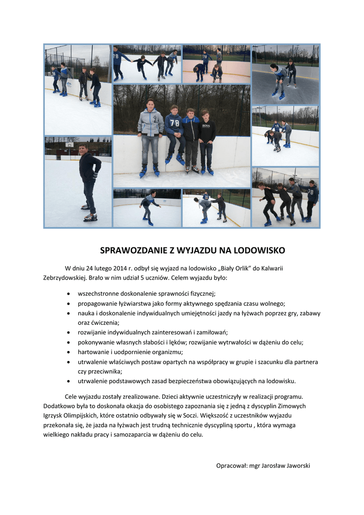 SPRAWOZDANIE Z WYJAZDU NA LODOWISKO W dniu 24 lutego 2014 r. odbył się wyjazd na lodowisko „Biały Orlik” do Kalwarii Zebrzydowskiej. Brało w nim udział 5 uczniów. Celem wyjazdu było:         wszechstronne doskonalenie sprawności fizycznej; propagowanie łyżwiarstwa jako formy aktywnego spędzania czasu wolnego; nauka i doskonalenie indywidualnych umiejętności jazdy na łyżwach poprzez gry, zabawy oraz ćwiczenia; rozwijanie indywidualnych zainteresowań i zamiłowań; pokonywanie własnych słabości i lęków; rozwijanie wytrwałości w dążeniu do celu; hartowanie i uodpornienie organizmu; utrwalenie właściwych postaw opartych na współpracy w grupie i szacunku dla partnera czy przeciwnika; utrwalenie podstawowych zasad bezpieczeństwa obowiązujących na lodowisku. Cele wyjazdu zostały zrealizowane. Dzieci aktywnie uczestniczyły w realizacji programu. Dodatkowo była to doskonała okazja do osobistego zapoznania się z jedną z dyscyplin Zimowych Igrzysk Olimpijskich, które ostatnio odbywały się w Soczi. Większość z uczestników wyjazdu przekonała się, że jazda na łyżwach jest trudną technicznie dyscypliną sportu , która wymaga wielkiego nakładu pracy i samozaparcia w dążeniu do celu. Opracował: mgr Jarosław Jaworski