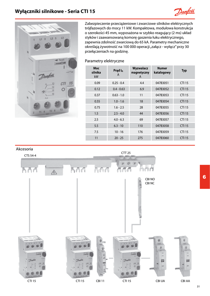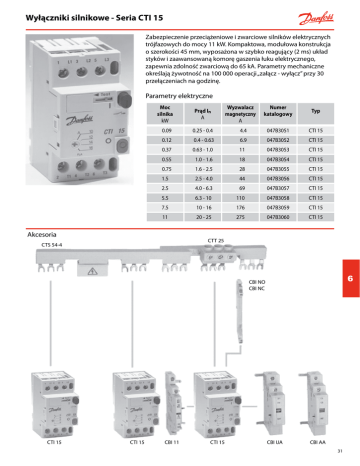 Wyłączniki silnikowe - Seria CTI 15 Zabezpieczenie przeciążeniowe i zwarciowe silników elektrycznych trójfazowych do mocy 11 kW. Kompaktowa, modułowa konstrukcja o szerokości 45 mm, wyposażona w szybko reagujący (2 ms) układ styków i zaawansowaną komorę gaszenia łuku elektrycznego, zapewnia zdolność zwarciową do 65 kA. Parametry mechaniczne określają żywotność na 100 000 operacji „załącz - wyłącz” przy 30 przełączeniach na godzinę. Parametry elektryczne Moc silnika kW Prąd In A 0.09 0.25 - 0.4 0.12 Numer katalogowy Typ 4.4 047B3051 CTI 15 0.4 - 0.63 6.9 047B3052 CTI 15 0.37 0.63 - 1.0 11 047B3053 CTI 15 0.55 1.0 - 1.6 18 047B3054 CTI 15 0.75 1.6 - 2.5 28 047B3055 CTI 15 1.5 2.5 - 4.0 44 047B3056 CTI 15 2.5 4.0 - 6.3 69 047B3057 CTI 15 5.5 6.3 - 10 110 047B3058 CTI 15 7.5 10 - 16 176 047B3059 CTI 15 11 20 - 25 275 047B3060 CTI 15 CBI UA CBI AA Akcesoria Wyzwalacz magnetyczny A CTT 25 CTS 54-4 CBI NO CBI NC CTI 15 CTI 15 CBI 11 CTI 15 31 Wyłączniki silnikowe - Seria CTI 15 - akcesoria cd. Montaż styków pomocniczych wewnętrznych CBI - NO, CBI - NC -NO -NC Montaż styków pomocniczych wewnętrznych CBI - 11 Montaż wyzwalaczy CBI AA, CBI UA -AA -UA Wyzwalacz podnapięciowy (UA) służy do zdalnego wyłączenia wyłącznika silnikowego z chwilą zaniku napięcia w obwodzie sterowniczym (pełni funkcję elementu bezpieczeństwa). Wyzwalacz wybijakowy (AA) służy do zdalnego wyłączenia wyłącznika silnikowego poprzez podanie napięcia na zaciski obwodu sterowniczego. Oba wyzwalacze dokonują jedynie zdalnego rozłączenia obwodu elektrycznego. 32 Wyłączniki silnikowe - Seria CTI 15 - akcesoria cd. Akcesoria cd. Typ Opis Nr katalogowy CBI NO CBI NC Styk pomocniczy wewnętrzny Styk pomocniczy wewnętrzny 047B3040 047B3042 CBI 11 Styk pomocniczy zewnętrzny 1 NO + 1 NC 047B3049 CBI UA CBI AA Wyzwalacz podnapięciowy 230 V Wyzwalacz wybijakowy 230 V 047B3061 047B3067 CTT 25 Blok zasilający maks. 16 mm2 047B3076 CTS Szyny grzebieniowe - modul 45 mm CTS 45 - 2 CTS 45 - 3 CTS 45 - 4 CTS 45 - 5 Szyny grzebieniowe - modul 54 mm CTS 54 - 2 CTS 54 - 3 CTS 54 - 4 CTS 54 - 5 047B3084 047B3096 047B3085 047B3086 047B3087 047B3097 047B3088 047B3089 BXI Obudowa do CTI 15 IP 55 Przyłącza do dławic kablowych 4 Pg 16 / 4 Pg 21 047B3091 CTC Mostek łączący wyłącznik ze stycznikiem CTI 15 + CI 6 - CI 15 047B3002 Dane techniczne: Zdolność zwarciowa Określa wielkość prądu zwarcia nie powodującego zniszczenia aparatu. Icc - przewidywana wartość prądu zwarcia, płynącego przez obwód nie zabezpieczony w żaden sposób Icu - maksymalna wartość prądu zwarcia - graniczna, która jest dopuszczalna dla danego aparatu przy założeniach zawartych w normie IEC 947-2 oraz EN 60947-2 33 Wyłączniki silnikowe - Seria CTI 15 - dane techniczne cd. Ics - znamionowa wartość prądu zwarcia - eksploatacyjna, która jest dopuszczalna dla danego aparatu przy założeniach zawartych w normie IEC 947-2 oraz EN 60947-2 Koordynacja zabezpieczeń: Typ 1:Po zwarciu w obwodzie dopuszcza się uszkodzenie aparatów łączeniowych i zabezpieczeń. Obwody zabezpiecza się według parametru Icu. Typ 2:Po zwarciu w obwodzie nie dopuszcza się uszkodzenia elementów łączeniowych i zabezpieczeń, dopuszcza się jedynie lekkie zgrzanie styków. Obwody zabezpiecza się według parametru Ics. Moc silnika kW 0.09 0.12 0.37 0.55 0.75 1.5 2.5 5.5 7.5 11 Prąd In A 0.25 - 0.4 0.4 - 0.63 0.63 - 1.0 1.0 - 1.6 1.6 - 2.5 2.5 - 4.0 4.0 - 6.3 6.3 - 10 10 - 16 10 - 25 400V Icu kA 65 65 65 65 50 10 10 10 8 8 Ics kA 65 65 65 65 50 10 10 10 6 6 Drut lub linka Linka z tulejką [mm2] 1-6 0.75 - 4 0.75 - 4 0.75 - 4 0.75 - 4 6 - 25 [mm2] 1-4 0.75 - 2.5 0.75 - 2.5 0.75 - 2.5 0.75 - 2.5 4 - 16 Bezpiecznik Icc>Icu A 63 50 50 Podłączenia Typ CTI CBI NO / NC CBI 11 CBI AA CBI UA CTT 25 Podłączenie Śruba z podkładką Śruba z podkładką Śruba z podkładką Śruba z podkładką Śruba z podkładką Śruba z podkładką Moment zaciskowy [Nm] 2.5 2.5 2.5 2.5 2.5 4 Charakterystyka działania: 1.Zabezpieczenie silnika przed przeciążeniem jest gwarantowane przez regulowane, zależne od natężenia prądu i działające z opóźnieniem elementy termobimetaliczne. Wykres podaje przeciętne wartości czasu reakcji przy temperaturze otoczenia 20°C. Gdy aparat się rozgrzeje, czas wyzwalania jest krótszy od czasu wyzwalania w stanie zimnym, lub odpowiada temu czasowi. Dokładna nastawa zapewnia zabezpieczenie silnika nawet w przypadku zaniku fazy. 2.Zabezpieczenie silnika przed zwarciem. Elektromagnetyczne wyzwalacze błyskawicznego działania reagują na ustawione wartości natężenia prądu. Przy ustawieniu najwyższym wartość ta odpowiada 11 (jedenastokrotnej) wartości nastawy prądowej. A - czas reakcji [s] ; B - krotność nastawy x In. 34 Wyłączniki silnikowe - Seria CTI 15 - wymiary 18 4 44 4 25 45 45 9 88 25 60 35