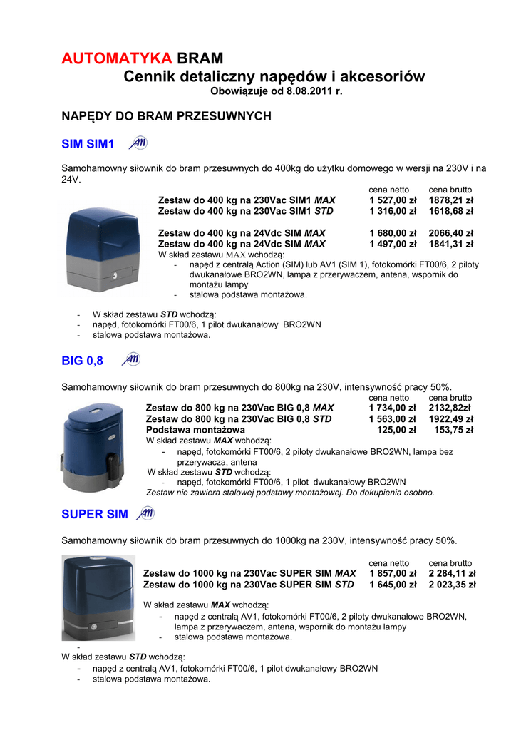 AUTOMATYKA BRAM Cennik detaliczny napędów i akcesoriów Obowiązuje od 8.08.2011 r. NAPĘDY DO BRAM PRZESUWNYCH SIM SIM1 Samohamowny siłownik do bram przesuwnych do 400kg do użytku domowego w wersji na 230V i na 24V. cena netto cena brutto Zestaw do 400 kg na 230Vac SIM1 MAX Zestaw do 400 kg na 230Vac SIM1 STD 1 527,00 zł 1 316,00 zł 1878,21 zł 1618,68 zł Zestaw do 400 kg na 24Vdc SIM MAX Zestaw do 400 kg na 24Vdc SIM MAX 1 680,00 zł 1 497,00 zł 2066,40 zł 1841,31 zł W skład zestawu MAX wchodzą: - napęd z centralą Action (SIM) lub AV1 (SIM 1), fotokomórki FT00/6, 2 piloty dwukanałowe BRO2WN, lampa z przerywaczem, antena, wspornik do montażu lampy - stalowa podstawa montażowa. - W skład zestawu STD wchodzą: napęd, fotokomórki FT00/6, 1 pilot dwukanałowy BRO2WN stalowa podstawa montażowa. BIG 0,8 Samohamowny siłownik do bram przesuwnych do 800kg na 230V, intensywność pracy 50%. Zestaw do 800 kg na 230Vac BIG 0,8 MAX Zestaw do 800 kg na 230Vac BIG 0,8 STD Podstawa montażowa cena netto cena brutto 1 734,00 zł 1 563,00 zł 125,00 zł 2132,82zł 1922,49 zł 153,75 zł W skład zestawu MAX wchodzą: - napęd, fotokomórki FT00/6, 2 piloty dwukanałowe BRO2WN, lampa bez przerywacza, antena W skład zestawu STD wchodzą: - napęd, fotokomórki FT00/6, 1 pilot dwukanałowy BRO2WN Zestaw nie zawiera stalowej podstawy montażowej. Do dokupienia osobno. SUPER SIM Samohamowny siłownik do bram przesuwnych do 1000kg na 230V, intensywność pracy 50%. Zestaw do 1000 kg na 230Vac SUPER SIM MAX Zestaw do 1000 kg na 230Vac SUPER SIM STD cena netto cena brutto 1 857,00 zł 1 645,00 zł 2 284,11 zł 2 023,35 zł W skład zestawu MAX wchodzą: - napęd z centralą AV1, fotokomórki FT00/6, 2 piloty dwukanałowe BRO2WN, lampa z przerywaczem, antena, wspornik do montażu lampy - stalowa podstawa montażowa. W skład zestawu STD wchodzą: - napęd z centralą AV1, fotokomórki FT00/6, 1 pilot dwukanałowy BRO2WN - stalowa podstawa montażowa. NAPĘDY DO BRAM GARAŻOWYCH PRAKT Przeznaczony do użytku domowego, siła ciągu 600N- Prakt 60 i 1200N- Prakt 120. Zasilanie silnika 24Vdc. cena netto cena brutto Zestaw do bramy garażowej PRAKT 60 Zestaw do bramy garażowej PRAKT 120 Kompletna przedłużka 1m do napędu Prakt 1 227,00 zł 1 395,00 zł 177,00 zł 1 509,21 zł 1 715,85 zł 217,71 zł W skład zestawu wchodzą: - siłownik PRAKT na 24Vdc z centralą Action wyposażony w enkoder - 1 pilot dwukanałowy BRO2WN - szyna aluminiowa składana 2x1,5 m z łańcuchem do bram o maksymalnej wysokości 2500 mm* . * Przy niskim nadprożu. Przy wysokim nadprożu maksymalna wysokość bramy, do której może zostać zainstalowany napęd ulegnie zmniejszeniu. SPEEDY Przeznaczony do użytku domowego, siła ciągu 600N, zasilanie silnika 24Vdc. Zestaw do bramy garażowej SPEEDY 60 cena netto cena brutto 700,00 zł 861,00 zł W skład zestawu wchodzą: - siłownik SPEEDY na 24Vdc z centralą CTR 47 i magnetycznymi wyłącznikami krańcowymi - 1 pilot dwukanałowy TRK 4 - szyna aluminiowa składana 3x1 m z łańcuchem do bram o maksymalnej wysokości 2500 mm. NAPĘDY DO BRAM SKRZYDŁOWYCH AX 222 Siłownik na 230V przeznaczony do użytku domowego. Maksymalna szerokość skrzydła bramy do 2m przy masie do 200kg. Zestaw do bramy dwuskrzydło wej AX 222 MAX cena netto cena brutto 1 990,00 zł 2 447,70 zł W skład zestawu wchodzą: - dwa siłowniki AX 222 na 230Vac - centrala C2 w skrzynce do zewnętrznej instalacji - dwa piloty dwukanałowe BRO2WN, komplet fotokomórek FT00, lampa bez przerywacza, wspornik do montażu lampy. TYTAN 2005 Elektromechaniczny siłownik o konstrukcji tubowej na 230V przeznaczony do użytku domowego oraz firm i wspólnot mieszkaniowych. Skok 300, 400 oraz 600mm. cena netto cena brutto Komplet siłowników tytan 2005-300 1 045,00zł 1 285,35 zł 1 045,00zł 1 285,35 zł 1 108,00zł 1 362,84 zł Do skrzydła o długości do 2 m i masie do 300 kg, skok300mm Komplet siłowników tytan 2005-400 Do skrzydła o długości do 3 m i masie do 300 kg, skok 400mm Komplet siłowników tytan 2005-600 Do skrzydła o długości do 4 m i masie do 300 kg, skok 600mm Siłowniki sprzedawane są bez elektroniki. Komplet siłowników zawiera: – dwa siłowniki Tytan 2005 (lewy i prawy) z mocowaniami – dwa kondensatory. PLUS Siłownik o skoku 340mm na 230V, przeznaczony do pracy średnio intensywnej (50%). Maksymalna szerokość skrzydła 3,5 m, masa skrzydła do 400kg. cena netto cena brutto Zestaw Plus do bramy dwuskrzydłowej 2 850,00zł 3505,50 zł W skład zestawu wchodzą: - dwa siłowniki Plus na 230Vac z mocowaniami - centrala Argo 2 w skrzynce do zewnętrznej instalacji - 2 piloty dwukanałowe BRO2WN, komplet fotokomórek FT00. TINY Siłownik o konstrukcji tubowej o skoku 400mm na 230V. Przeznaczony do użytku domowego. Komplet siłowników tytan 2005-300 1 045,00zł 1 285,35 zł Do skrzydła o maksymalnej długości 3 m i masie do 250 kg, skok 400mm, intensywność pracy 35%. Siłowniki sprzedawane są bez elektroniki. Komplet siłowników zawiera: – dwa siłowniki Tytan 2005 (lewy i prawy) z mocowaniami – dwa kondensatory. CENTRALE STERUJĄCE Centrale Allmatic AV1 centrala do bram przesuwnych na 230V, odbiornik IB1, bez regulacji siły Hermes centrala do bram przesuwnych na 230V z regulatorem siły, odbiornik IB1, zwolnienie, fototest, sygnalizacja błędów Action centrala do bram przesuwnych na 24V enkoder, odbiornik IB1 Action centrala do bram segmentowych na 24V, enkoder, odbiornik IB1 C2 centrala do bram skrzydłowych na 2 silniki 230V, odbiornik IB1, bez regulacji siły Argo2 centrala do bram skrzydłowych na 2 silniki, odbiornik IB1 zwolnienie, fototest, sygnalizacja błędów RPEC1 regulator siły do central AV1, C2 cena netto 280,00 zł 321,00 zł cena brutto 344,40 zł 394,83 zł 291,00 zł 320,00 zł 345,00 zł 357,93 zł 393,60 zł 424,35 zł 552,00 zł 678,96 zł 32,00 zł 39,36 zł RADIOLINIE Radiolinie Allmatic cena netto IB1 szerokopasmowy moduł radiowy na 433,