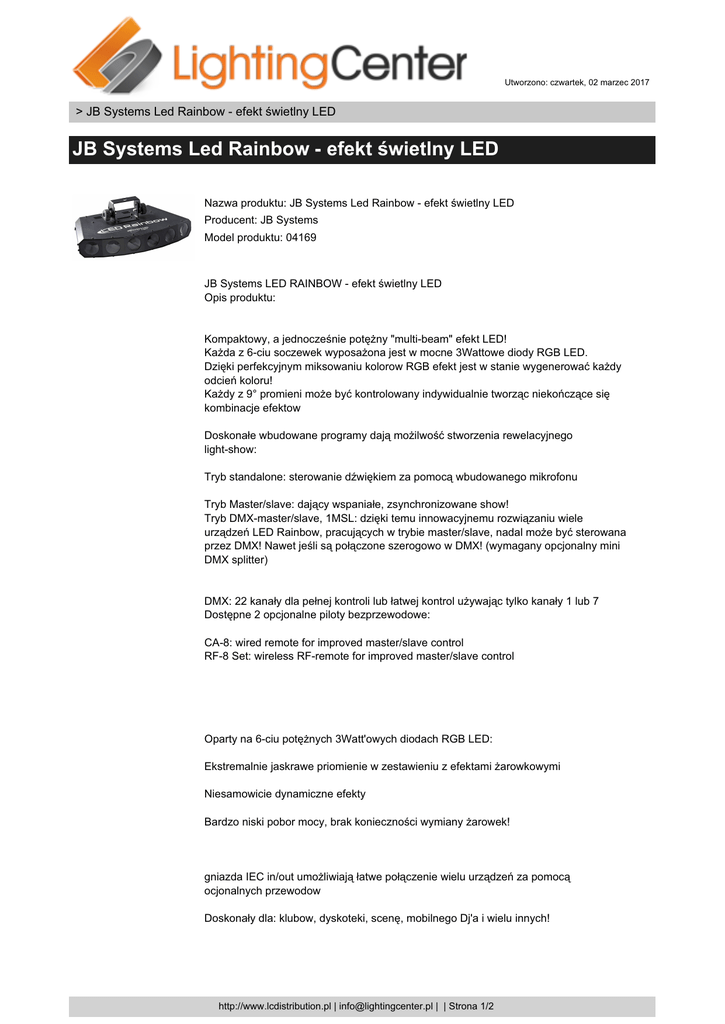 Utworzono: czwartek, 02 marzec 2017 > JB Systems Led Rainbow - efekt świetlny LED JB Systems Led Rainbow - efekt świetlny LED Nazwa produktu: JB Systems Led Rainbow - efekt świetlny LED Producent: JB Systems Model produktu: 04169 JB Systems LED RAINBOW - efekt świetlny LED Opis produktu: Kompaktowy, a jednocześnie potężny "multi-beam" efekt LED! Każda z 6-ciu soczewek wyposażona jest w mocne 3Wattowe diody RGB LED. Dzięki perfekcyjnym miksowaniu kolorow RGB efekt jest w stanie wygenerować każdy odcień koloru! Każdy z 9° promieni może być kontrolowany indywidualnie tworząc niekończące się kombinacje efektow Doskonałe wbudowane programy dają możilwość stworzenia rewelacyjnego light-show: Tryb standalone: sterowanie dźwiękiem za pomocą wbudowanego mikrofonu Tryb Master/slave: dający wspaniałe, zsynchronizowane show! Tryb DMX-master/slave, 1MSL: dzięki temu innowacyjnemu rozwiązaniu wiele urządzeń LED Rainbow, pracujących w trybie master/slave, nadal może być sterowana przez DMX! Nawet jeśli są połączone szerogowo w DMX! (wymagany opcjonalny mini DMX splitter) DMX: 22 kanały dla pełnej kontroli lub łatwej kontrol używając tylko kanały 1 lub 7 Dostępne 2 opcjonalne piloty bezprzewodowe: CA-8: wired remote for improved master/slave control RF-8 Set: wireless RF-remote for improved master/slave control Oparty na 6-ciu potężnych 3Watt'owych diodach RGB LED: Ekstremalnie jaskrawe priomienie w zestawieniu z efektami żarowkowymi Niesamowicie dynamiczne efekty Bardzo niski pobor mocy, brak konieczności wymiany żarowek! gniazda IEC in/out umożliwiają łatwe połączenie wielu urządzeń za pomocą ocjonalnych przewodow Doskonały dla: klubow, dyskoteki, scenę, mobilnego Dj'a i wielu innych! http://www.lcdistribution.pl | [email protected] | | Strona 1/2 Utworzono: czwartek, 02 marzec 2017 > JB Systems Led Rainbow - efekt świetlny LED JB Systems Led Rainbow - efekt świetlny LED Specyfikacja techniczna: Zasilacznie: AC100V~240V 50/60Hz Pobor mocy: 39 Watt Zabezpieczenie: 250V T6.3A (20mm glass) Tryb sound: wbudowany mikrofon Złącza DMX: 3pin XLR male / female Kanały DMX: 1, 7, 22 kanały Żrodło światła: 6x 3Watt Tri-color LEDs Wymiary: 424 x 251 x 65 cm (z uchwytem: 138mm) Waga: 3,6kg Prezentacja video: http://www.lcdistribution.pl | [email protected] | | Strona 2/2