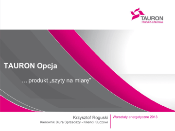 TAURON Opcja … produkt „szyty na miarę” Krzysztof Roguski Kierownik Biura Sprzedaży - Klienci Kluczowi Warsztaty energetyczne 2013 TRUDNE PYTANIE: Zmienność cen Cena Na Hurtowym Rynku Energii Elektrycznej Zakup po cenie FIX Spadek ceny o 8 zł ! 5 dni Koszty FIRMY zawyżone o 80 000 zł DOBRA ODPOWIEDŹ: TAURON Opcja OSZCZĘDNOŚĆ - obniżenie ceny sprzedaży energii elektrycznej po akceptacji oferty/zawarciu umowy. MOŻLIWOŚĆ WYBORU - dwa warianty zmiany ceny do wyboru. PRZEJRZYSTOŚĆ - Zmiana ceny może nastąpić jednorazowo po zamkniętym okresie od przyjęcia oferty (30 lub 60 dni) lub we wskazanym przez Klienta dniu od przyjęcia oferty (w zależności od wybranego wariantu). GWARANCJA – stała gwarantowana cena sprzedaży w całym okresie umownym. Struktura ceny energii elektrycznej Informacje podstawowe 8% 1% 2% 0% ZIELONE (BEZ AKCYZY) CZERWONE 1% 10% ŻÓŁTE 3% FIOLETOWE BIAŁE akcyza 75% profil+koszty+marża energia konwencjonalna Rynki na Towarowej Giełdzie Energii Informacje ogólne Towarowa Giełda Energii (TGE) prowadzi rynki umożliwiające handel: energią elektryczną prawami majątkowymi uprawnieniami do emisji CO2 W zakresie handlu energią elektryczną funkcjonują: Rynek Dnia Następnego (RDN) Rynek Terminowy Towarowy (RTT) Rynek Dnia Bieżącego (RDB) Aukcje energii notowania indeksu BASE_Y-rr TAURON Opcja Warianty TAURON Opcja Wariant I Automatyczne wyliczenie korekty ceny następuje po 30 lub 60 dniach od akceptacji oferty Wariant II Wskazanie przez Klienta optymalnego momentu wyliczenia korekty ceny w okresie 30 lub 60 dni od akceptacji oferty WARIANT I Jak działa? Cena ofertowa = 205,00 zł/MWh GWARANCJA CENY OFERTOWEJ Cena CBASE_WI = 170 zł/MWh Moment wyceny COF W=0 Cref = 160 zł/MWh W=Cref- CBASE_WI CBASE_WI = 148 zł/MWh 30 lub 60 dni dzień rekalkulacji ceny KORZYŚĆ DLA FIRMY 120 000 zł WARIANT II Jak działa? Cena ofertowa = 205,00 zł/MWh GWARANCJA CENY OFERTOWEJ Cena CBASE_WI = 170 zł/MWh Moment wyceny COF W=0 Cref = 160 zł/MWh W=Cref- CBASE_WI CBASE_WI = 145 zł/MWh 30 lub 60 dni dzień rekalkulacji ceny Wniosek o rekalkulację ceny KORZYŚĆ DLA FIRMY 150 000 zł TAURON Opcja Dla kogo Dla segmentu Klientów Kluczowych o rocznym zużyciu od 3 GWh. Produkt TAURON Opcja może być oferowany Klientom z umowami sprzedaży oraz umowami kompleksowymi jako bezpieczna forma zakupu energii na rok 2014 i/lub 2015. Dla obecnych Klientów TAURON Sprzedaż jak również Klientów, którzy w przeszłości podjęli decyzję o zmianie sprzedawcy. Z produktu mogą również skorzystać nasi potencjalni Klienci. TAURON Opcja Warunkiem przeprowadzenia rekalkulacji jest podpisanie umowy przez Klienta przed dniem rekalkulacji. dzień przyjęcia oferty dzień podpisania umowy dzień rekalkulacji Cs=Cof-W dzień przyjęcia oferty dzień rekalkulacji dzień podpisania umowy Cs=Cof Zamknięty okres sprzedaży - produkt jest sprzedawany do 25 października 2013 r. Ograniczenie kwotowe monitorowane przez TAURON Sprzedaż – w razie jego przekroczenia przed 25 października 2013 r. zamknięcie sprzedaży produktu. Co Państwo zyskujecie korzystając z TAURON Opcja OSZCZĘDNOŚĆ - obniżenie ceny sprzedaży energii elektrycznej po akceptacji oferty/zawarciu umowy. MOŻLIWOŚĆ WYBORU - dwa warianty zmiany ceny do wyboru. PRZEJRZYSTOŚĆ – klarowne i jasne zasady naliczania opustu. GWARANCJA – stała gwarantowana cena sprzedaży w całym okresie umownym. Dziękuję za uwagę Krzysztof Roguski Kierownik Biura Sprzedaży - Klienci Kluczowi Warsztaty energetyczne 2013