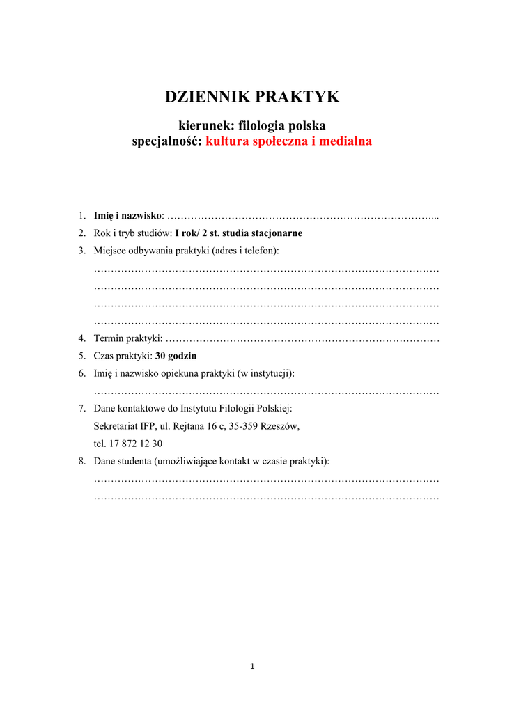 DZIENNIK PRAKTYK kierunek: filologia polska specjalność: kultura społeczna i medialna 1. Imię i nazwisko: ……………………………………………………………………... 2. Rok i tryb studiów: I rok/ 2 st. studia stacjonarne 3. Miejsce odbywania praktyki (adres i telefon): ………………………………………………………………………………………… ………………………………………………………………………………………… ………………………………………………………………………………………… ………………………………………………………………………………………… 4. Termin praktyki: ……………………………………………………………………… 5. Czas praktyki: 30 godzin 6. Imię i nazwisko opiekuna praktyki (w instytucji): ………………………………………………………………………………………… 7. Dane kontaktowe do Instytutu Filologii Polskiej: Sekretariat IFP, ul. Rejtana 16 c, 35-359 Rzeszów, tel. 17 872 12 30 8. Dane studenta (umożliwiające kontakt w czasie praktyki): ………………………………………………………………………………………… ………………………………………………………………………………………… 1 WYTYCZNE W SPRAWIE PRAKTYKI SPECJALIZACYJNEJ studentów studiów II stopnia filologii polskiej (studia stacjonarne) specjalność: kultura społeczna i medialna 1. W ramach przygotowania zawodowego studenci filologii polskiej (specjalność językowe kreowanie wizerunku) zaliczają praktykę w następującym wymiarze: o 2-tygodniowa praktyka ciągła w instytucjach użyteczności publicznej dla studentów dziennych po I roku studiów drugiego stopnia we wrześniu w terminie ustalonym w danym roku akademickim o dzienny wymiar czasu na praktykę to 3 godziny (15 godzin na tydzień x 2 tygodnie, czyli 30 godzin), przy czym opiekun praktyki ma prawo zmodyfikować ten wymiar dzienny, dostosowując czas praktyki do konkretnych zadań. o student za zgodą Dziekana Wydziału Filologicznego może odbyć praktykę w innym terminie, motywując konieczność wprowadzanych zmian. 2. Na początku praktyki student wspólnie z opiekunem (rzecznik prasowy lub osoba reprezentująca instytucję w kontaktach z mediami) ustala plan praktyki (sporządza harmonogram zajęć), który ma obowiązek przesłać do kierownika praktyki w Instytucie Filologii Polskiej. 3. W pierwszych trzech dniach praktyki studenci powinni przede wszystkim obserwować pracę opiekuna, biernie uczestniczyć w jego zajęciach, a w kolejnych dniach czynnie włączyć się do konkretnych zadań. 4. Student w czasie praktyki powinien zaznajomić się ze strukturą wybranej jednostki użyteczności publicznej oraz organizacją pracy w danej instytucji. 5. Zakres zadań dla studenta ustala opiekun, on też wyznacza konkretne obowiązki zgodnie ze swoim harmonogramem zajęć w czasie odbywania przez studenta praktyki. 6. W miarę możliwości studentowi odbywającemu praktykę dana instytucja powinna umożliwić różny zakres czynności, m.in. zredagowanie krótkiej notatki prasowej, przeprowadzenie wywiadu, przygotowanie wypowiedzi publicznej (np. oświadczenie, przeproszenie, sprostowanie, itp.), pełnienie w obecności opiekuna dyżuru telefonicznego dla interesantów. 7. O ile dyrektor danej instytucji wyrazi zgodę, to student powinien uczestniczyć w naradach pracowników, zebraniach, konferencjach. 8. Student ma obowiązek prowadzenia dziennika praktyk, w którym odnotowuje zajęcia z poszczególnych dni, co potwierdza opiekun swoim podpisem. 9. Zajęcia, w których uczestniczy student, może hospitować opiekun, również dyrektor instytucji użyteczności publicznej, w której student odbywa praktykę, a także nauczyciele akademiccy opiekun praktyk oraz kierownik praktyk. 10. Po zakończeniu praktyki opiekun przygotowuje stosowną opinię (arkusz uwag i spostrzeżeń) na temat predyspozycji kandydata do pracy w zawodzie rzecznika prasowego. Dokument ten musi być potwierdzony przez dyrektora instytucji stosowną pieczęcią i podpisem. Razem z dziennikiem praktyk stanowi podstawę do zaliczenia praktyki przez opiekuna praktyk w Instytucie Filologii Polskiej. 11. Sprawami związanymi z zawieraniem umów i wynagrodzeniem opienkunów zajmuje się Sekcja Kształcenia Praktycznego UR, Dział Toku Studiów, 35-601 Rzeszów, ul. M. Ćwiklińskiej, tel. 0178721769. Kierownik praktyk: dr Maria Krauz, opiekun praktyk: dr Wioletta Kochmańska Kierownik Zakładu Języka Polskiego: prof. dr hab. Kazimierz Ożóg, zastępca Dyrektora Instytutu Filologii Polskiej: dr Magdalena Patro-Kucab 2 EFEKTY KSZTAŁCENIA Absolwenci tej specjalności przygotowani zostają przede wszystkim do wykonywania zawodu rzecznika prasowego różnych instytucji życia publicznego, a także do pracy w mediach. Studenci zdobywają wiedzę teoretyczną i umiejętności praktyczne w zakresie sprawnego i poprawnego komunikowania w języku ojczystym (odmianie pisanej, jak i mówionej). Poznają zasady pisania i redagowania tekstów o charakterze informacyjnym, pisania oświadczeń dla prasy, udzielania wywiadów dla mediów, prowadzenia konferencji prasowych, przygotowywania mów okolicznościowych, redagowania strony internetowej. Wyposażeni zostaną w podstawowe kompetencje potrzebne do zarządzania wizerunkiem i informacją, planowania i realizowania strategii public relations, budowania tekstowych strategii prezentacyjnych i autoprezentacyjnych, zarządzania komunikacją w sytuacjach kryzysowych oraz w wiedzę dotyczącą podstaw prawnych i etycznych działań PR. Absolwenci potrafią świadomie, skutecznie i poprawnie językowo pośredniczyć w komunikacji społecznej. Ponadto, po ukończeniu kształcenia absolwenci specjalności komunikacja społeczna i medialna będą dysponowali kwalifikacjami zawodowym