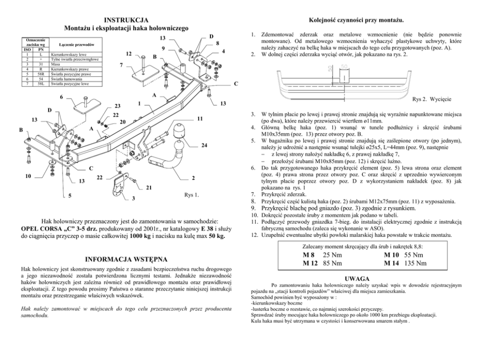 Kolejność czynności przy montaŜu. INSTRUKCJA MontaŜu i eksploatacji haka holowniczego Oznaczenie zacisku wg ISO PN 1 L 2 + 3 31 4 R 5 58R 6 54 7 58L 1. D 13 8 Łączenie przewodów 9 12 Kierunkowskazy lewe Tylne światła przeciwmgłowe Masa Kierunkowskazy prawe Światła pozycyjne prawe Światła hamowania Światła pozycyjne lewe 4 2. B 7 Zdemontować zderzak oraz metalowe wzmocnienie (nie będzie ponownie montowane). Od metalowego wzmocnienia wyhaczyć plastykowe uchwyty, które naleŜy zahaczyć na belkę haka w miejscach do tego celu przygotowanych (poz. A). W dolnej części zderzaka wyciąć otwór, jak pokazano na rys. 2. 50 C A 6 D 22 13 11 20 A B 24 C 10 13 22 2 21 5 Rys 2. Wycięcie 13 1 23 3 Rys 1. 3. W tylnim płacie po lewej i prawej stronie znajdują się wyraźnie napunktowane miejsca (po dwa), które naleŜy przewiercić wiertłem ø11mm. 4. Główną belkę haka (poz. 1) wsunąć w tunele podłuŜnicy i skręcić śrubami M10x35mm (poz. 13) przez otwory poz. B. 5. W bagaŜniku po lewej i prawej stronie znajdują się zaślepione otwory (po jednym), naleŜy je udroŜnić a następnie wsunąć tulejki ø25x5, L=44mm (poz. 9), następnie − z lewej strony nałoŜyć nakładkę 6, z prawej nakładkę 7, − przełoŜyć śrubami M10x85mm (poz. 12) i skręcić luźno. 6. Do tak przygotowanego haka przykręcić element (poz. 5) lewa strona oraz element (poz. 4) prawa strona przez otwory poz. C oraz skręcić z uprzednio wywierconym tylnym płacie poprzez otwory poz. D z wykorzystaniem nakładek (poz. 8) jak pokazano na rys. 1 7. Przykręcić zderzak. 8. Przykręcić część kulistą haka (poz. 2) śrubami M12x75mm (poz. 11) z wyposaŜenia. 9. Przykręcić blachę pod gniazdo (poz. 3) zgodnie z rysunkiem. Hak holowniczy przeznaczony jest do zamontowania w samochodzie: OPEL CORSA „C” 3-5 drz. produkowany od 2001r., nr katalogowy E 38 i słuŜy do ciągnięcia przyczep o masie całkowitej 1000 kg i nacisku na kulę max 50 kg. 10. Dokręcić pozostałe śruby z momentem jak podano w tabeli. 11. Podłączyć przewody gniazdka 7-bieg. do instalacji elektrycznej zgodnie z instrukcją fabryczną samochodu (zaleca się wykonanie w ASO). 12. Uzupełnić ewentualne ubytki powłoki malarskiej haka powstałe w trakcie montaŜu. Zalecany moment skręcający dla śrub i nakrętek 8,8: INFORMACJA WSTĘPNA Hak holowniczy jest skonstruowany zgodnie z zasadami bezpieczeństwa ruchu drogowego a jego niezawodność została potwierdzona licznymi testami. JednakŜe niezawodność haków holowniczych jest zaleŜna równieŜ od prawidłowego montaŜu oraz prawidłowej eksploatacji. Z tego powodu prosimy Państwa o staranne przeczytanie niniejszej instrukcji montaŜu oraz przestrzeganie właściwych wskazówek. Hak naleŜy zamontować w miejscach do tego celu przeznaczonych przez producenta samochodu. M 8 25 Nm M 12 85 Nm M 10 55 Nm M 14 135 Nm UWAGA Po zamontowaniu haka holowniczego naleŜy uzyskać wpis w dowodzie rejestracyjnym pojazdu na „stacji kontroli pojazdów” właściwej dla miejsca zamieszkania. Samochód powinien być wyposaŜony w : -kierunkowskazy boczne -lusterka boczne o rozstawie, co najmniej szerokości przyczepy. Sprawdzać śruby mocujące haka holowniczego po około 1000 km przebiegu eksploatacji. Kula haka musi być utrzymana w czystości i konserwowana smarem stałym . WyposaŜenie haka: PPUH AUTO-HAK S.J. Produkcja Haków Holowniczych Henryk & Zbigniew Nejman 76-200 SŁUPSK ul. Słoneczna 16K tel/fax (059) 8-414-414; 8-414-413 E-mail: [email protected] www. autohak.com.pl Hak holowniczy bez wyposaŜenia elektrycznego Klasa: A50-X Nr kat. E38 Przeznaczony do zamontowania w samochodzie: Producent: OPEL Model: CORSA Typ: 3-5 drz. produkowanego od 2001r. KARTA GWARANCYJNA Dane techniczne: Wartość siły D : 5,73 kN maksymalna masa przyczepy: 1000 kg maksymalny nacisk na kulę: 50 kg Numer homologacji zgodnie z wytycznymi regulaminu EKG/ONZ 55.01: E20-55R-01 0804 Numer certyfikatu: B/1/199/2000 Producent udziela gwarancji niniejszą kartą gwarancyjną na okres 24 miesięcy licząc od dnia zakupu haka holowniczego do samochodu: INFORMACJA WSTĘPNA OPEL CORSA „C” 3-5 drz. produkowany od 2001 r. Data produkcji .............................. Data zakupu......................................... Zakres gwarancji obejmuje wyłącznie wady jakościowe wynikające z winy producenta. Gwarancja nie obejmuje natomiast uszkodzeń zawinionych przez nabywcę, wynikających z niewłaściwego montaŜu, uŜytkowania lub konserwacji, uszkodzeń mechanicznych, normalnego zuŜycia podczas eksploatacji itp. Gwarancja udzielona na zakupiony towar nie wyłącza, nie ogranicza ani nie zawiesza uprawnień kupującego wynikających z niezgodności towaru z umową. Reklamacje naleŜy zgłaszać w punkcie sprzedaŜy, składając jednocześnie kartę gwarancyjną. Usunięcie "wady" następuje po stwierdzeniu przez punkt sprzedaŜy wspólnie z producentem słuszności złoŜonej reklamacji. Reklamacja powinna być załatwiona w ciągu czternastu dni od dnia uznania reklamacji. Karta gwarancyjna jest niewaŜna jeŜeli nie jest wypełniona i podpisana. Data zgłoszenia reklamacji: ................................................................... Hak holowniczy jest skonstruowany zgodnie z zasadami bezpieczeństwa ruchu drogowego. Hak holowniczy jest elementem wpływającym na bezpieczeństwo jazdy i moŜe zostać zainstalowany wyłącznie przez personel wyspecjalizowany. Niedopuszczalne jest dokonywanie jakichkolwiek zmian w konstrukcji haka. Powoduje to wygaśniecie dopuszczenia do stosowania. W przypadku obecności masy izolacyjnej lub osłony podwozia w miejscu przylegania haka, naleŜy ją usunąć. Nieosłonięte miejsca karoserii oraz wywiercone otwory naleŜy pomalować farbą antykorozyjną. Informacjami wiąŜącymi odnośnie wartości obciąŜeń są dane podawane przez producenta samochodu, względnie wartości maksymalnej masy przyczepy oraz maksymalnego nacisku na kulę, przy cz