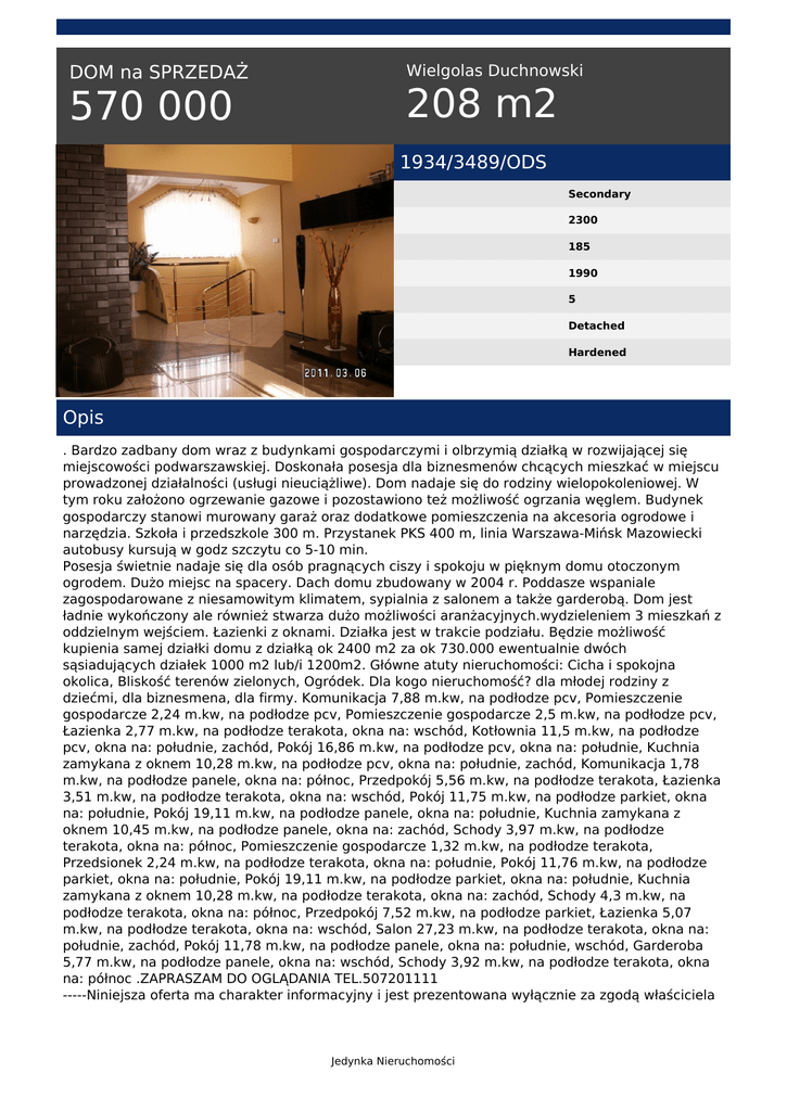 DOM na SPRZEDAŻ 570 000 Wielgolas Duchnowski 208 m2 1934/3489/ODS Secondary 2300 185 1990 5 Detached Hardened Opis . Bardzo zadbany dom wraz z budynkami gospodarczymi i olbrzymią działką w rozwijającej się miejscowości podwarszawskiej. Doskonała posesja dla biznesmenów chcących mieszkać w miejscu prowadzonej działalności (usługi nieuciążliwe). Dom nadaje się do rodziny wielopokoleniowej. W tym roku założono ogrzewanie gazowe i pozostawiono też możliwość ogrzania węglem. Budynek gospodarczy stanowi murowany garaż oraz dodatkowe pomieszczenia na akcesoria ogrodowe i narzędzia. Szkoła i przedszkole 300 m. Przystanek PKS 400 m, linia Warszawa-Mińsk Mazowiecki autobusy kursują w godz szczytu co 5-10 min. Posesja świetnie nadaje się dla osób pragnących ciszy i spokoju w pięknym domu otoczonym ogrodem. Dużo miejsc na spacery. Dach domu zbudowany w 2004 r. Poddasze wspaniale zagospodarowane z niesamowitym klimatem, sypialnia z salonem a także garderobą. Dom jest ładnie wykończony ale również stwarza dużo możliwości aranżacyjnych.wydzieleniem 3 mieszkań z oddzielnym wejściem. Łazienki z oknami. Działka jest w trakcie podziału. Będzie możliwość kupienia samej działki domu z działką ok 2400 m2 za ok 730.000 ewentualnie dwóch sąsiadujących działek 1000 m2 lub/i 1200m2. Główne atuty nieruchomości: Cicha i spokojna okolica, Bliskość terenów zielonych, Ogródek. Dla kogo nieruchomość? dla młodej rodziny z dziećmi, dla biznesmena, dla firmy. Komunikacja 7,88 m.kw, na podłodze pcv, Pomieszczenie gospodarcze 2,24 m.kw, na podłodze pcv, Pomieszczenie gospodarcze 2,5 m.kw, na podłodze pcv, Łazienka 2,77 m.kw, na podłodze terakota, okna na: wschód, Kotłownia 11,5 m.kw, na podłodze pcv, okna na: południe, zachód, Pokój 16,86 m.kw, na podłodze pcv, okna na: południe, Kuchnia zamykana z oknem 10,28 m.kw, na podłodze pcv, okna na: południe, zachód, Komunikacja 1,78 m.kw, na podłodze panele, okna na: północ, Przedpokój 5,56 m.kw, na podłodze terakota, Łazienka 3,51 m.kw, na podłodze terakota, okna na: wschód, Pokój 11,75 m.kw, na podłodze parkiet, okna na: południe, Pokój 19,11 m.kw, na podłodze panele, okna na: południe, Kuchnia zamykana z oknem 10,45 m.kw, na podłodze panele, okna na: zachód, Schody 3,97 m.kw, na podłodze terakota, okna na: północ, Pomieszczenie gospodarcze 1,32 m.kw, na podłodze terakota, Przedsionek 2,24 m.kw, na podłodze terakota, okna na: południe, Pokój 11,76 m.kw, na podłodze parkiet, okna na: południe, Pokój 19,11 m.kw, na podłodze parkiet, okna na: południe, Kuchnia zamykana z oknem 10,28 m.kw, na podłodze terakota, okna na: zachód, Schody 4,3 m.kw, na podłodze terakota, okna na: północ, Przedpokój 7,52 m.kw, na podłodze parkiet, Łazienka 5,07 m.kw, na podłodze terakota, okna na: wschód, Salon 27,23 m.kw, na podłodze terakota, okna na: południe, zachód, Pokój 11,78 m.kw, na podłodze panele, okna na: południe, wschód, Garderoba 5,77 m.kw, na podłodze panele, okna na: wschód, Schody 3,92 m.kw, na podłodze terakota, okna na: północ .ZAPRASZAM DO OGLĄDANIA TEL.507201111 -----Niniejsza oferta ma charakter informacyjny i jest prezentowana wyłącznie za zgodą właściciela Jedynka Nieruchomości nieruchomości.---------BIURO NIERUCHOMOŚCI JEDYNKA prowadzi działalność w zakresie pośrednictwa w obrocie nieruchomościami na terenie Sulejówka i jego okolic, jak również Otwocka.---------Zapraszamy na naszą stronę internetową WWW.BN1.COM.PL-- Sylwia Slowik tel. 507 20 11 11 tel. 22 783 22 80 email: [email protected] Jedynka Nieruchomości Powered by TCPDF (www.tcpdf.org)