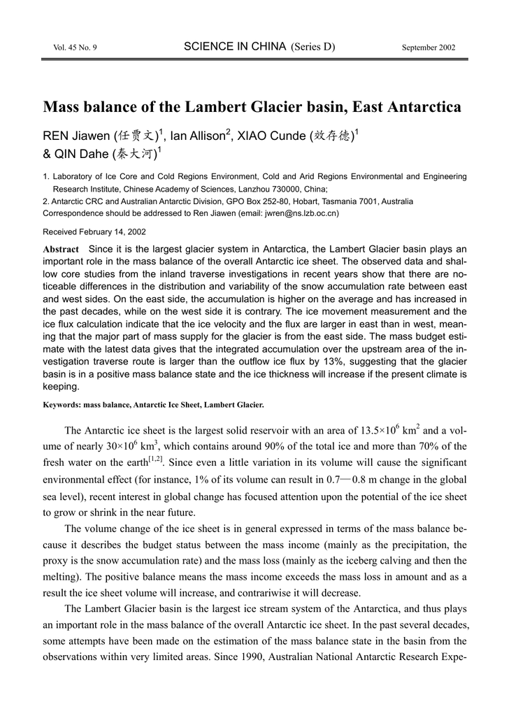 Vol. 45 No. 9 SCIENCE IN CHINA (Series D) September 2002 Mass balance of the Lambert Glacier basin, East Antarctica REN Jiawen ()1, Ian Allison2, XIAO Cunde ()1 & QIN Dahe ()1 1. Laboratory of Ice Core and Cold Regions Environment, Cold and Arid Regions Environmental and Engineering Research Institute, Chinese Academy of Sciences, Lanzhou 730000, China; 2. Antarctic CRC and Australian Antarctic Division, GPO Box 252-80, Hobart, Tasmania 7001, Australia Correspondence should be addressed to Ren Jiawen (email: [email protected]) Received February 14, 2002 Abstract Since it is the largest glacier system in Antarctica, the Lambert Glacier basin plays an important role in the mass balance of the overall Antarctic ice sheet. The observed data and shallow core studies from the inland traverse investigations in recent years show that there are noticeable differences in the distribution and variability of the snow accumulation rate between east and west sides. On the east side, the accumulation is higher on the average and has increased in the past decades, while on the west side it is contrary. The ice movement measurement and the ice flux calculation indicate that the ice velocity and the flux are larger in east than in west, meaning that the major part of mass supply for the glacier is from the east side. The mass budget estimate with the latest data gives that the integrated accumulation over the upstream area of the investigation traverse route is larger than the outflow ice flux by 13%, suggesting that the glacier basin is in a positive mass balance state and the ice thickness will increase if the present climate is keeping. Keywords: mass balance, Antarctic Ice Sheet, Lambert Glacier. The Antarctic ice sheet is the largest solid reservoir with an area of 13.5×106 km2 and a volume of nearly 30×106 km3, which contains around 90% of the total ice and more than 70% of the fresh water on the earth[1,2]. Since even a little variation in its volume will cause the significant environmental effect (for instance, 1% of its volume can result in 0.7ü 0.8 m change in the global sea level), recent interest in global change has focused attention upon the potential of the ice sheet to grow or shrink in the near future. The volume change of the ice sheet is in general expressed in terms of the mass balance because it describes the budget status between the mass income (mainly as the precipitation, the proxy is the snow accumulation rate) and the mass loss (mainly as the iceberg calving and then the melting). The positive balance means the mass income exceeds the mass loss in amount and as a result the ice sheet volume will increase, and contrariwise it will decrease. The Lambert Glacier basin is the largest ice stream system of the Antarctica, and thus plays an important role in the mass balance of the overall Antarctic ice sheet. In the past several decades, some attempts have been made on the estimation of the mass balance state in the basin from the observations within very limited areas. Since 1990, Australian National Antarctic Research Expe- No. 9 LAMBERT GLACIER MASS BALANCE 843 dition (ANARE) carried out the inland traverses over the basin along a route with about 2500 m elevation, but the emphasis was put in west part of the basin. Chinese National Antarctic Research Expedition (CHINARE) has taken an inland ice sheet investigation along the transect from the Zhongshan Station to Dome A in east part of the basin (fig. 1). Moreover, some Chinese scholars also participated in the ANARE’s work. These long distance traverse investigations have covered the main interior region of the basin. From in situ measurement of the accumulation rate and shallow core studies, some results of the accumulation rate distribution and variability in partial sections of the investigation routes have been presented, such as in west part of the basin by Goodwin et al.[3] and Ren et al.[4 ü6] . Besides, Higham et al.[7,8] reported the data on the accumulation meas- urement along the ANARE traverse route, and Fricker et al.[9] discussed the ice flow flux and the mass balance along the route. In the present paper, we would like to make an attempt at presenting a comprehensive discussion on the distribution and variations of the surface accumulation rate over the basin, the ice flow flux across the investigation sections and the total integrated accumulation and the mass balance state over the upstream area using all available data from traverses along both ANARE and CHINARE routes. Nevertheless, we lay the emphasis upon the calculation and discussion of the present state of the mass balance. 1 Research area and field work The Lambert Glacier lies in a deep rift valley in the East Antarctica. In directions of west, south and east within a large extent ice flows convergently into the glacier and then drains into the Amery Ice Shelf. So the Lambert Glacier basin contains three parts: Amery Ice Shelf, Lambert Glacier and the upstream area (fig. 1). The total area of the basin is 1550000 km2, including 69000 km2 of floating ice in the Amery Ice Shelf [9]. Since there are many exposed mounts in the Lambert Glacier, it is rather difficult to make the mass balance measurement. The alternative method is the investigation of the accumulation and the ice flux over the upstream area. As shown in fig. 1, the Lambert Glacier basin traverse route (hereafter referred to as the LGB) starts at LGB00 about 130 km from the coast (the Mawson Station) on the west side and ends at LGB72 about 70 km from the coast (the Zhongshan Station) on the east side, with a total distance of 2014 km and an elevation of around 2500 m. The Zhongshan-Dome A traverse route (hereafter referred to as the DT) starts near Zhongshan , coincides with LGB within the initial 300 km and then extends from LDB65 toward Dome A almost along 77eE with a total distance of 1100 km. Along LGB route five time traverses were made during 1990ü1994. Of them two are for the whol