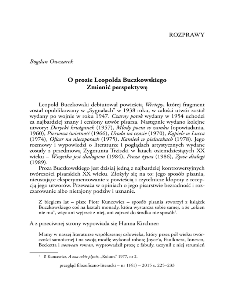 ROZPRAWY Bogdan Owczarek O prozie Leopolda Buczkowskiego Zmienić perspektywę Leopold Buczkowski debiutował powieścią Wertepy, której fragment został opublikowany w „Sygnałach” w 1938 roku, w całości utwór został wydany po wojnie w roku 1947. Czarny potok wydany w 1954 uchodzi za najbardziej znany i ceniony utwór pisarza. Następnie wydano kolejne utwory: Dorycki krużganek (1957), Młody poeta w zamku (opowiadania, 1960), Pierwsza świetność (1966), Uroda na czasie (1970), Kąpiele w Lucca (1974), Oficer na nieszporach (1975), Kamień w pieluszkach (1978). Jego rozmowy i wypowiedzi o literaturze i poglądach artystycznych wydane zostały z przedmową Zygmunta Trziszki w latach osiemdziesiątych XX wieku – Wszystko jest dialogiem (1984), Proza żywa (1986), Żywe dialogi (1989). Proza Buczkowskiego jest dzisiaj jedną z najbardziej kontrowersyjnych twórczości pisarskich XX wieku. Złożyły się na to: jego sposób pisania, nieustające eksperymentowanie z powieścią i czytelnicze kłopoty z recepcją jego utworów. Przeważa w opiniach o jego pisarstwie bezradność i rozczarowanie albo nietajony podziw i uznanie. Z biegiem lat – pisze Piotr Kuncewicz – sposób pisania stworzył z książek Buczkowskiego coś na kształt monady, która wystarcza sobie samej, a że „okien nie ma”, więc ani wyjrzeć z niej, ani zajrzeć do środka nie sposób1. A z przeciwnej strony wypowiada się Hanna Kirchner: Mamy w naszej literaturze współczesnej człowieka, który przez pół wieku twórczości samoistnej i na swoją modłę wykonał robotę Joyce’a, Faulknera, Ionesco, Becketta i nouveau roman, wyprowadził prozę z fabuły, uczynił z niej strumień 1 P. Kuncewicz, A ona sobie płynie, „Kultura” 1977, nr 2. przegląd filozoficzno-literacki – nr 1(41) – 2015 s. 225–233 Bogdan Owczarek mowy. Stworzył też jeden z najbardziej wstrząsających obrazów wojny i zagłady narodów2. Utrzymuje się dość zgodna opinia, że „wojenne implikacje – pisze Tadeusz Błażejewski – zrosły się z tkanką prozy Buczkowskiego tak głęboko, iż dla ogółu pozostał on przede wszystkim twórcą Czarnego potoku – książki w tym zakresie najbardziej artystycznie wyrazistej i najbardziej moralnie przejmującej”3. Nie ulega wątpliwości, że Czarny potok, Dorycki krużganek i Pierwsza świetność mówią o II wojnie światowej, o zagładzie Żydów, o skomplikowanych losach żołnierzy i partyzantów. Nie to jednak jest istotą rzeczy. Pierwsza świetność i następne utwory wnoszą do pisarstwa Buczkowskiego nowe tony, nowe formy, nową problematykę i nowe komplikacje. Zdarzenia wojenne właściwie nie znikają w twórczości pisarza, tylko tyle że w późnej twórczości pisze o nich zupełnie inaczej. To powoduje, że utwory czytane zwykle jako tematyczne okazują się w istocie nienarracyjne, a proza Buczkowskiego gdzieś od Urody na czasie różni się dość wyraźnie od wcześniejszych utworów. Proza Buczkowskiego jest po prostu niejednolita. Zauważyli to zresztą niektórzy krytycy i historycy literatury. Poczynając od Młodego poety w zamku – pisze T. Błażejewski – podstawą zrozumienia pisarstwa Buczkowskiego staje się rekonstrukcja znaczeniowa tekstu. Dla uzyskania komunikatywności konieczne jest przezwyciężenie bezładu i pozornej nieczytelności, wydobycie sensownego kontekstu dla kolejnych całostek znaczeniowych4. Rozstrzygającym kontekstem jest dla badacza intertekstualna gra autora z utworem Thomasa Carlyle’a Sartor Resartus (takie rozumienie po raz pierwszy zaproponował Ryszard Nycz5). Odmienność Pierwszej świetności dostrzegł także Sławomir Buryła. „Samotnik z Konstancina przynajmniej od Pierwszej świetności funkcjonuje jako znak rozpoznawczy tych wszystkich zagrożeń, jakie niosą ze sobą eksperymenty z formą”6. Interesujące z tego punktu widzenia są dwie recenzje Jana Błońskiego z Doryckiego 2 H. Kirchner, Leopold Buczkowski albo uroda na czasie, w: Sporne postaci polskiej literatury współczesnej: kontynuacje, red. A. Brodzka i L. Burska, Wydawnictwo IBL, Warszawa 1996, s. 89. 3 T. Błażejewski, Przemoc świata. Pisarstwo Leopolda Buczkowskiego, Wydawnictwo UŁ, Łódź 1991, s. 8. 4 Ibidem, s. 78. 5 R. Nycz, Teufelsdröckh redivivus albo o pewnym dialogu tekstowym, „Teksty” 1978, nr 1. 6 S. Buryła, Prawda mitu i literatury. O pisarstwie Tadeusza Borowskiego i Leopolda Buczkowskiego, Universitas, Kraków 2003, s. 13. 226 O prozie Leopolda Buczkowskiego krużganku i Pierwszej świetności, publikowane w odstępie dziewięciu lat. Ale dopiero czytane razem zyskują właściwą perspektywę oceny omawianych utworów Buczkowskiego. Czytane oddzielnie Bezdroże omawiające Pierwszą świetność uchodziło zazwyczaj za typową recenzję krytyczną, odrzucającą utwór pisarza. Tymczasem obie recenzje łącznie, porównywane ze sobą, ukazują wyraźną odmienność Czarnego potoku i Doryckiego krużganku od Pierwszej świetności. Jak pisze krytyk – Czarny potok był jeszcze „historią”, chociaż „zmąconą i ciemną”, a Dorycki krużganek jest już tylko „sytuacją”. Pierwsza świetność zaś czytana była, zdaniem Błońskiego, jako „zbiór wszystkich skojarzeń powstałych podczas pisania utworu”7. Recenzje Błońskiego wnoszą jednocześnie do oceny Buczkowskiego pewien krytyczny ton, uwydatniający niejednolitość spuścizny Buczkowskiego, obejmującej teraz utwory „czytelne” – Czarny potok i Dorycki krużganek – i „nieczytelne” – Pierwszą świetność. „Pierwsza świetność – pisze – nie słucha żadnego porządku, nie poddaje się żadnemu kluczowi”8. Najprościej ujmując, Błoński zarzuca utworowi pisarza „chaotyczność”, co oznacza dla niego „nieczytelność”. A przeciwieństwem chaosu jest zazwyczaj spójność. To właśnie pojęcie spójności odegrało w literaturoznawstwie i recepcji pisarza rolę znaczącego i pozytywnego kon