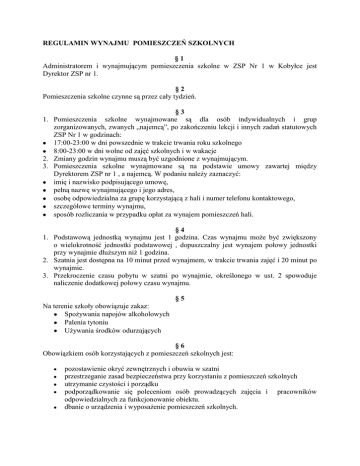 REGULAMIN WYNAJMU POMIESZCZEŃ SZKOLNYCH §1 Administratorem i wynajmującym pomieszczenia szkolne w ZSP Nr 1 w Kobyłce jest Dyrektor ZSP nr 1. §2 Pomieszczenia szkolne czynne są przez cały tydzień. §3 1. Pomieszczenia szkolne wynajmowane są dla osób indywidualnych i grup zorganizowanych, zwanych „najemcą”, po zakończeniu lekcji i innych zadań statutowych ZSP Nr 1 w godzinach: 17:00-23:00 w dni powszednie w trakcie trwania roku szkolnego 8:00-23:00 w dni wolne od zajęć szkolnych i w wakacje 2. Zmiany godzin wynajmu muszą być uzgodnione z wynajmującym. 3. Pomieszczenia szkolne wynajmowane są na podstawie umowy zawartej między Dyrektorem ZSP nr 1 , a najemcą. W podaniu należy zaznaczyć: imię i nazwisko podpisującego umowę, pełną nazwę wynajmującego i jego adres, osobę odpowiedzialna za grupę korzystającą z hali i numer telefonu kontaktowego, szczegółowe terminy wynajmu, sposób rozliczania w przypadku opłat za wynajem pomieszczeń hali. §4 1. Podstawową jednostką wynajmu jest 1 godzina. Czas wynajmu może być zwiększony o wielokrotność jednostki podstawowej , dopuszczalny jest wynajem połowy jednostki przy wynajmie dłuższym niż 1 godzina. 2. Szatnia jest dostępna na 10 minut przed wynajmem, w trakcie trwania zajęć i 20 minut po wynajmie. 3. Przekroczenie czasu pobytu w szatni po wynajmie, określonego w ust. 2 spowoduje naliczenie dodatkowej połowy czasu wynajmu. §5 Na terenie szkoły obowiązuje zakaz: Spożywania napojów alkoholowych Palenia tytoniu Używania środków odurzających §6 Obowiązkiem osób korzystających z pomieszczeń szkolnych jest: pozostawienie okryć zewnętrznych i obuwia w szatni przestrzeganie zasad bezpieczeństwa przy korzystaniu z pomieszczeń szkolnych utrzymanie czystości i porządku podporządkowanie się poleceniom osób prowadzących zajęcia i pracowników odpowiedzialnych za funkcjonowanie obiektu. dbanie o urządzenia i wyposażenie pomieszczeń szkolnych. §7 Korzystając z pomieszczeń szkolnych nie wolno powodować sytuacji zagrażających bezpieczeństwu osób tam przebywających. §8 Wynajmujący ma prawo kontrolować zajęcia pod kątem stosowania się do postanowień niniejszego regulaminu, a w razie stwierdzenia uchybień – zakazać dalszego korzystania z pomieszczeń szkolnych. §9 Za przedmioty pozostawione w pomieszczeniach szkolnych wynajmujący nie ponosi odpowiedzialności. § 10 Osoby naruszające porządek publiczny lub przepisy niniejszego regulaminu będą usuwane z terenu pomieszczeń szkolnych niezależnie od ewentualnego skierowania sprawy na drogę postępowania administracyjnego. § 11 Odpowiedzialność za porządek oraz stan sprzętu spoczywa na najemcy. § 12 Przed rozpoczęciem zajęć należy: 1. Pobrać klucze do wynajmowanych pomieszczeń. Pobrać klucze może wyłącznie osoba odpowiedzialna za grupę. 2. Cała grupa zbiera się przy wejściu głównym, zmienia obuwie i wraz z opiekunem grupy udaje się do wynajmowanych pomieszczeń szkolnych. 3. Zgłosić pracownikowi szkoły ewentualne problemy uniemożliwiające rozpoczęcie zajęć, dostrzeżone nieprawidłowości. 4. Za wszelkie powstałe szkody podczas wynajmu odpowiedzialność materialną ponosi najemca. § 13 Po skończonych zajęciach należy wynajmowane pomieszczenia oraz szatnie pozostawić w stanie niezmienionym, pobrane klucze zwrócić. § 14 Za bezpieczeństwo uczestników zajęć oraz powierzony sprzęt odpowiedzialny jest najemca. § 15 Uwagi należy zgłaszać do administratora obiektów sportowych. Najemca zobowiązany jest wynajmowanych pomieszczeń. do § 16 zapoznania osoby korzystające z regulaminem CENNIK WYNAJMU POMIESZCZEŃ SZKOLNYCH 1. Cennik wynajmu duża sala • Za zajęcia treningowe piłka nożna -osoby fizyczne, instytucje, zakłady pracy • Za zajęcia treningowe piłka siatkowa, piłka ręczna, koszykówka -osoby fizyczne, instytucje, zakłady pracy 80 zł/h 60 zł/h 2. Cennik wynajmu mała sala • Za zajęcia treningowe, taneczne -osoby fizyczne, instytucje, zakłady pracy 40 zł/h 3. Cennik wynajmu boisko szkolne • Za zajęcia treningowe 40 zł/h • Za zajęcia treningowe 60 zł/h z oświetleniem 4. Cennik wynajmu sal lekcyjnych • Za zajęcia z języków obcych, zajęć dodatkowych, spotkań, itp. - szkoły językowe, osoby fizyczne, instytucje, zakłady pracy 25 zł/h 5. Po uprzednim uzgodnieniu z Dyrektorem ZSP nr 1, istnieje możliwość zniżki w opłatach w szczególnych przypadkach.
