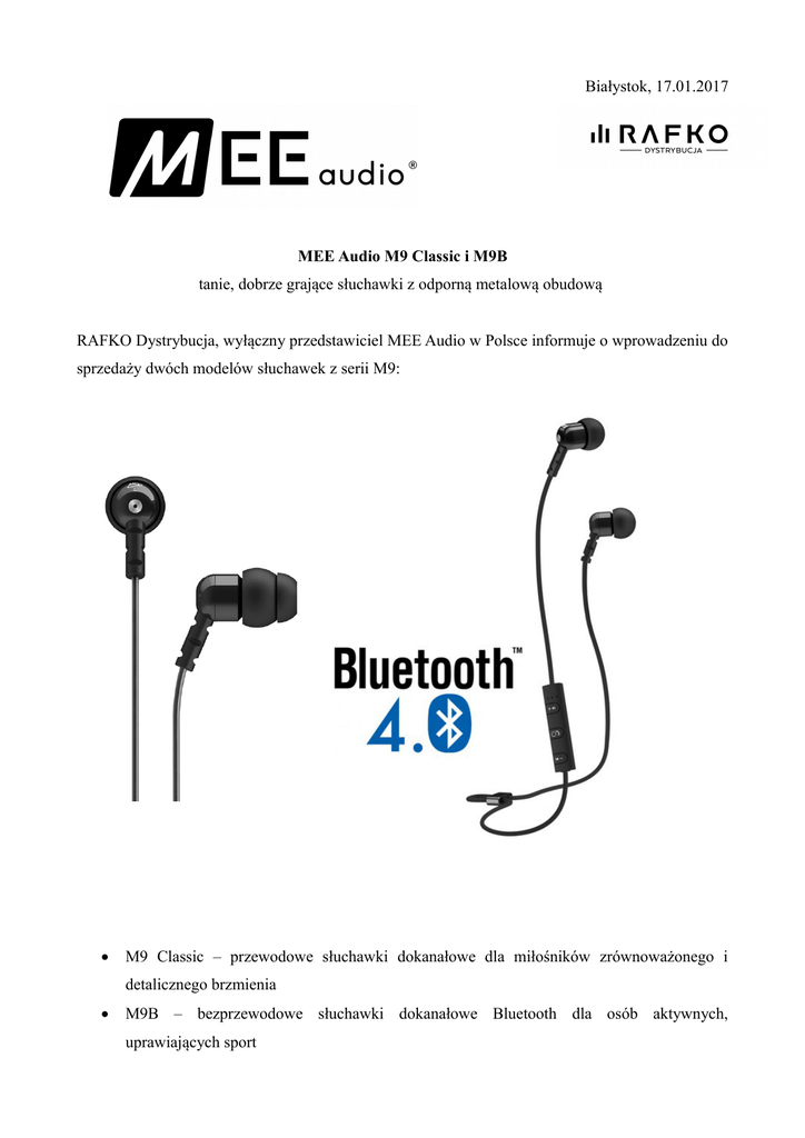 Białystok, 17.01.2017 MEE Audio M9 Classic i M9B tanie, dobrze grające słuchawki z odporną metalową obudową RAFKO Dystrybucja, wyłączny przedstawiciel MEE Audio w Polsce informuje o wprowadzeniu do sprzedaży dwóch modelów słuchawek z serii M9: M9 Classic – przewodowe słuchawki dokanałowe dla miłośników zrównoważonego i detalicznego brzmienia M9B – bezprzewodowe słuchawki dokanałowe Bluetooth dla osób aktywnych, uprawiających sport Najważniejsze cechy M9 Classic: wykonane ze stopu lekkich metali – zbudowane tak aby przetrwać wiele lat nieplączący się kabel odporny na efekt mikrofonowania 30 procent mniejsza obudowa w stosunku do modelu M9 pomimo skrajnie niskiej ceny komplet 4 wkładek silikonowych o różnych rozmiarach zoptymalizowane pod kątem jak najlepszego - zrównoważonego i muzykalnego brzmienia w swojej cenie – wyposażone w autorski firmowy przetwornik 9mm bazujący na doświadczeniach w rozwoju słuchawek dla muzyków M6Pro oraz słuchawek audiofilskich Pinnacle Cena: 59zł Najważniejsze cechy M9B: Wbudowany mikrofon i kontroler poziomu głośności - dla rozmów telefonicznych oraz komfortowego odsłuchu muzyki Technologia Bluetooth 4.0 - dzięki wbudowanemu modułowi Bluetooth w wersji 4.0, słuchawki M9B mogą współpracować z dwoma urządzeniami nadawczymi jednocześnie. Oznacza to, że możesz oglądać film na tablecie lub laptopie i jednocześnie odbierać rozmowy telefoniczne ze swojego telefonu! Obudowa słuchawek wykonana z aluminium - dzięki temu słuchawki są odporne na warunki atmosferyczne. Dodatkowa korzyść to większa sztywność, która znacząco poprawia jakość dźwięku. 4 rodzaje gumek dokanałowych - dla dokładnego wygłuszenia otoczenia, bezpiecznego zainstalowania słuchawki w uchu, oraz poprawienia przetwarzania niskich tonów oraz dynamiki dźwięku Cena: 169zł O marce MEE Audio MEE Audio to firma specjalizująca się w produkcji słuchawek sportowych i Bluetooth. Założona w 2005 roku z siedzibą USA, w stanie Kalifornia, nieopodal Los Angeles. Zespół MEE Audio stawia sobie za cel produkcję przenośnych słuchawek łączących bardzo przystępną cenę z jakością wykonania i wygodą użytkowania zdecydowanie przewyższającą standardy obowiązujące w danym segmencie cenowym. Ponadto słuchawki MEE Audio zdobyły sobie wśród użytkowników amerykańskich for internetowych opinie produktów oferujących wysoką jakość dźwięku przy zadziwiająco niskiej cenie. Produkty MEE Audio zyskały sobie liczną rzeszę ambasadorów. Od modelki fitness Victorii Lomba przez liczne grono perkusistów takich jak: Cody Stewart, Johnny Michals, Andrew Holzbaur, kończąc na jednym z najbardziej wpływowych bębniarzy młodego pokolenia Joey'ym Muha. Na portfolio MEE Audio składają się produkty takie jak: przenośne słuchawki do smartfonów przenośne słuchawki sportowe przenośne słuchawki dokanałowe dla muzyków (profesjonalne) przenośne słuchawki dla audiofilów transmitery Bluetooth przenośne słuchawki nauszne Bluetooth przenośne słuchawki sportowe Bluetooth dziecięce słuchawki nauszne z limiterem poziomu głośności wykonane z plastiku wolnego od BPA (non toxic plastic) Dodatkowych informacji udziela: Andrzej Lemański e-mail: [email protected] tel. kom. 607 266 622 W kwestiach technicznych produktów MEE Audio: Rafał Koc e-mail: [email protected] tel. (85) 747 97 51