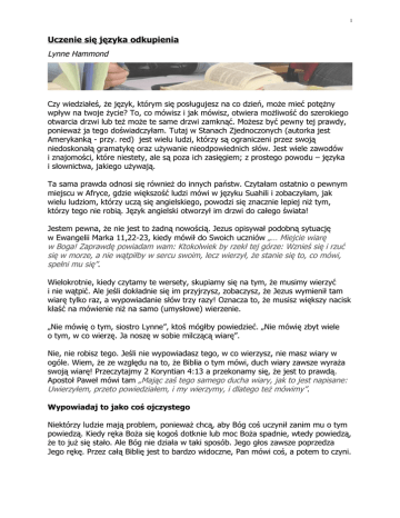 1 Uczenie się języka odkupienia Lynne Hammond Czy wiedziałeś, że język, którym się posługujesz na co dzień, może mieć potężny wpływ na twoje życie? To, co mówisz i jak mówisz, otwiera możliwość do szerokiego otwarcia drzwi lub też może te same drzwi zamknąć. Możesz być pewny tej prawdy, ponieważ ja tego doświadczyłam. Tutaj w Stanach Zjednoczonych (autorka jest Amerykanką - przy. red) jest wielu ludzi, którzy są ograniczeni przez swoją niedoskonałą gramatykę oraz używanie nieodpowiednich słów. Jest wiele zawodów i znajomości, które niestety, ale są poza ich zasięgiem; z prostego powodu – języka i słownictwa, jakiego używają. Ta sama prawda odnosi się również do innych państw. Czytałam ostatnio o pewnym miejscu w Afryce, gdzie większość ludzi mówi w języku Suahili i zobaczyłam, jak wielu ludziom, którzy uczą się angielskiego, powodzi się znacznie lepiej niż tym, którzy tego nie robią. Język angielski otworzył im drzwi do całego świata! Jestem pewna, że nie jest to żadną nowością. Jezus opisywał podobną sytuację w Ewangelii Marka 11,22-23, kiedy mówił do Swoich uczniów „… Miejcie wiarę w Boga! Zaprawdę powiadam wam: Ktokolwiek by rzekł tej górze: Wznieś się i rzuć się w morze, a nie wątpiłby w sercu swoim, lecz wierzył, że stanie się to, co mówi, spełni mu się”. Wielokrotnie, kiedy czytamy te wersety, skupiamy się na tym, że musimy wierzyć i nie wątpić. Ale jeśli dokładnie się im przyjrzysz, zobaczysz, że Jezus wymienił tam wiarę tylko raz, a wypowiadanie słów trzy razy! Oznacza to, że musisz większy nacisk kłaść na mówienie niż na samo (umysłowe) wierzenie. „Nie mówię o tym, siostro Lynne”, ktoś mógłby powiedzieć. „Nie mówię zbyt wiele o tym, w co wierzę. Ja noszę w sobie milczącą wiarę”. Nie, nie robisz tego. Jeśli nie wypowiadasz tego, w co wierzysz, nie masz wiary w ogóle. Wiem, że ze względu na to, że Biblia o tym mówi, duch wiary zawsze wyraża swoją wiarę! Przeczytajmy 2 Koryntian 4:13 a przekonamy się, że jest to prawdą. Apostoł Paweł mówi tam „Mając zaś tego samego ducha wiary, jak to jest napisane: Uwierzyłem, przeto powiedziałem, i my wierzymy, i dlatego też mówimy”. Wypowiadaj to jako coś ojczystego Niektórzy ludzie mają problem, ponieważ chcą, aby Bóg coś uczynił zanim mu o tym powiedzą. Kiedy ręka Boża się kogoś dotknie lub moc Boża spadnie, wtedy powiedzą, że to już się stało. Ale Bóg nie działa w taki sposób. Jego głos zawsze poprzedza Jego rękę. Przez całą Biblię jest to bardzo widoczne, Pan mówi coś, a potem to czyni. 2 W Pierwszej Księdze Mojżeszowej rozdziale pierwszym, Bóg powiedział coś, a potem to się stało, „Niech powstanie światło!” i powstało światło. W Dziejach Apostolskich, kiedy Bóg chciał wylać Ducha Świętego na pogan, posłał Piotra, aby powiedział o tym wszystkim zgromadzonym w domu Korneliusza. Biblia mówi nam: „Podczas, gdy Piotr jeszcze mówił … Duch Święty spadł na wszystkich, którzy słuchali tego słowa”. (Dz.Ap. 10, 44). Jeden z największych Bożych sług, jakich znam, opowiadał kiedyś, jak Pan lata temu, nauczył go pewnej zasady. Kiedy wołał do Boga o swoje finanse, mówiąc jak wielkie ma rachunki do zapłacenia i jak tragiczna jest jego sytuacja, mówiąc: „Oh, Boże, potrzebuję cudu”. Pan przemówił do niego i rzekł: „Nigdy nie módl się w taki sposób o pieniądze, ponieważ pieniądze, których potrzebujesz, nie są zgromadzone w niebie. A ja nie przyjdę i nie wydrukuję ci ich, posyłając je do ciebie pocztą, nie jestem tym oszustem i malwersantem. „Pieniądze, jakich potrzebujesz są na ziemi i w imieniu Jezusa masz władzę, aby rozkazać im do ciebie przyjść. Nigdy nie wypowiadaj tego, że ci czegokolwiek brakuje, ponieważ to trzyma pieniądze z dala od ciebie. Im więcej narzekasz i jęczysz na temat tego, czego nie masz, tym bardziej te potrzeby będą cię nękać. Więc po prostu rozkaż tym pieniądzom do ciebie przyjść. Powiedz też szatanowi, aby zabrał swoje łapska od twoich pieniędzy, powiedz też aniołom, aby przyszli i spowodowali, aby twoje pieniądze wróciły do ciebie. A potem zacznij wywyższać Mnie i dziękować”. Czy widzisz, czego Bóg nauczył tego pastora? Nauczył go, aby zaczął mówić językiem odkupienia, kiedy niepokoi się o swoje finanse. „Ale ja próbowałam mówić w taki sposób i to w moim przypadku nie działa”. To dlatego, że tylko próbowałaś. Powiedziałaś kilka słów wiary a potem powróciłaś do swojego starego sposobu mówienia. Jeśli rzeczywiście chcesz aby język odkupienia zaczął otwierać tobie drzwi, potrzebujesz stać się stałą i biegłą w tej sztuce. Musisz umieścić to głęboko w swoim sercu a potem zacząć wypowiadać… umieścić głęboko w sercu a potem wypowiadać to swoimi ustami… cały czas i bez ustanku, znów i znów, dopóki nie stanie się to twoim głównym językiem. Nie przestawaj używać tego języka dopóki nie zaczniesz posiadać go, jakby był twoim ojczystym językiem. W rzeczywistości duchowej on naprawdę jest twoim ojczystym językiem. Od kiedy narodziłeś się na nowo, stałeś się dzieckiem Bożym, nie jesteś już obywatelem świata zdominowanego przez choroby, wątpliwości, strach i przygnębienie. Jesteś obywatelem nieba. Jesteś, jak mówi list do Efezjan 2,19 „Tak więc już nie jesteście obcymi i przychodniami, lecz współobywatelami świętych i domownikami Boga”. Czy myślisz, że w niebie mówi z jakimkolwiek przestrachem i z niedowierzaniem, czy myślisz, że ktokolwiek tam myśli o chorobach i problemach? Czy myślisz, że oni tam wzdychają i narzekają, jak ciężko im tam jest? Z całą pewnością nie! Raczej cieszą się z ich niebiańskiego zaopatrzenia. Rozmawiają o obfitości i Bożym błogosławieństwie. Mówią o języku odkupienia. 3 To cudowne, 