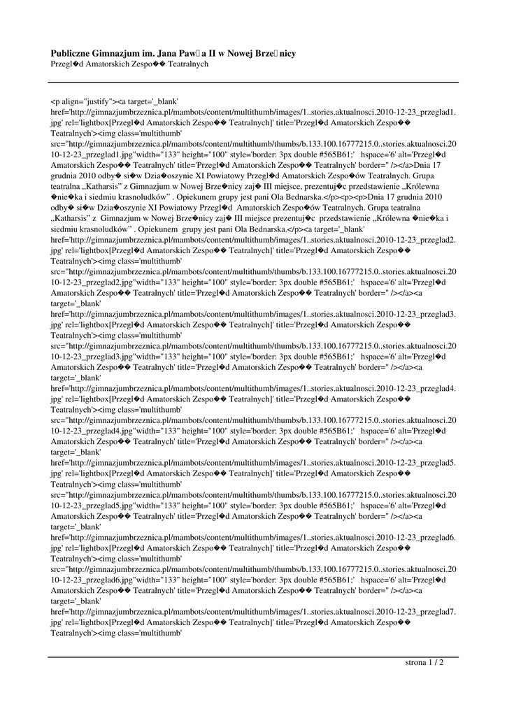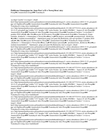 Publiczne Gimnazjum im. Jana Paw�a II w Nowej Brze�nicy Przegl�d Amatorskich Zespo�� Teatralnych <p align="justify"><a target='_blank' href='http://gimnazjumbrzeznica.pl/mambots/content/multithumb/images/1..stories.aktualnosci.2010-12-23_przeglad1. jpg' rel='lightbox[Przegl�d Amatorskich Zespo�� Teatralnych]' title='Przegl�d Amatorskich Zespo�� Teatralnych'><img class='multithumb' src="http://gimnazjumbrzeznica.pl/mambots/content/multithumb/thumbs/b.133.100.16777215.0..stories.aktualnosci.20 10-12-23_przeglad1.jpg"width="133" height="100" style='border: 3px double #565B61;' hspace='6' alt='Przegl�d Amatorskich Zespo�� Teatralnych' title='Przegl�d Amatorskich Zespo�� Teatralnych' border='' /></a>Dnia 17 grudnia 2010 odby� si�w Dzia�oszynie XI Powiatowy Przegl�d Amatorskich Zespo�ów Teatralnych. Grupa teatralna „Katharsis” z Gimnazjum w Nowej Brze�nicy zaj� III miejsce, prezentuj�c przedstawienie „Królewna �nie�ka i siedmiu krasnoludków” . Opiekunem grupy jest pani Ola Bednarska.</p><p><p>Dnia 17 grudnia 2010 odby� si�w Dzia�oszynie XI Powiatowy Przegl�d Amatorskich Zespo�ów Teatralnych. Grupa teatralna „Katharsis” z Gimnazjum w Nowej Brze�nicy zaj� III miejsce prezentuj�c przedstawienie „Królewna �nie�ka i siedmiu krasnoludków” . Opiekunem grupy jest pani Ola Bednarska.</p><a target='_blank' href='http://gimnazjumbrzeznica.pl/mambots/content/multithumb/images/1..stories.aktualnosci.2010-12-23_przeglad2. jpg' rel='lightbox[Przegl�d Amatorskich Zespo�� Teatralnych]' title='Przegl�d Amatorskich Zespo�� Teatralnych'><img class='multithumb' src="http://gimnazjumbrzeznica.pl/mambots/content/multithumb/thumbs/b.133.100.16777215.0..stories.aktualnosci.20 10-12-23_przeglad2.jpg"width="133" height="100" style='border: 3px double #565B61;' hspace='6' alt='Przegl�d Amatorskich Zespo�� Teatralnych' title='Przegl�d Amatorskich Zespo�� Teatralnych' border='' /></a><a target='_blank' href='http://gimnazjumbrzeznica.pl/mambots/content/multithumb/images/1..stories.aktualnosci.2010-12-23_przeglad3. jpg' rel='lightbox[Przegl�d Amatorskich Zespo�� Teatralnych]' title='Przegl�d Amatorskich Zespo�� Teatralnych'><img class='multithumb' src="http://gimnazjumbrzeznica.pl/mambots/content/multithumb/thumbs/b.133.100.16777215.0..stories.aktualnosci.20 10-12-23_przeglad3.jpg"width="133" height="100" style='border: 3px double #565B61;' hspace='6' alt='Przegl�d Amatorskich Zespo�� Teatralnych' title='Przegl�d Amatorskich Zespo�� Teatralnych' border='' /></a><a target='_blank' href='http://gimnazjumbrzeznica.pl/mambots/content/multithumb/images/1..stories.aktualnosci.2010-12-23_przeglad4. jpg' rel='lightbox[Przegl�d Amatorskich Zespo�� Teatralnych]' title='Przegl�d Amatorskich Zespo�� Teatralnych'><img class='multithumb' src="http://gimnazjumbrzeznica.pl/mambots/content/multithumb/thumbs/b.133.100.16777215.0..stories.aktualnosci.20 10-12-23_przeglad4.jpg"width="133" height="100" style='border: 3px double #565B61;' hspace='6' alt='Przegl�d Amatorskich Zespo�� Teatralnych' title='Przegl�d Amatorskich Zespo�� Teatralnych' border='' /></a><a target='_blank' href='http://gimnazjumbrzeznica.pl/mambots/content/multithumb/images/1..stories.aktualnosci.2010-12-23_przeglad5. jpg' rel='lightbox[Przegl�d Amatorskich Zespo�� Teatralnych]' title='Przegl�d Amatorskich Zespo�� Teatralnych'><img class='multithumb' src="http://gimnazjumbrzeznica.pl/mambots/content/multithumb/thumbs/b.133.100.16777215.0..stories.aktualnosci.20 10-12-23_przeglad5.jpg"width="133" height="100" style='border: 3px double #565B61;' hspace='6' alt='Przegl�d Amatorskich Zespo�� Teatralnych' title='Przegl�d Amatorskich Zespo�� Teatralnych' border='' /></a><a target='_blank' href='http://gimnazjumbrzeznica.pl/mambots/content/multithumb/images/1..stories.aktualnosci.2010-12-23_przeglad6. jpg' rel='lightbox[Przegl�d Amatorskich Zespo�� Teatralnych]' title='Przegl�d Amatorskich Zespo�� Teatralnych'><img class='multithumb' src="http://gimnazjumbrzeznica.pl/mambots/content/multithumb/thumbs/b.133.100.16777215.0..stories.aktualnosci.20 10-12-23_przeglad6.jpg"width="133" height="100" style='border: 3px double #565B61;' hspace='6' alt='Przegl�d Amatorskich Zespo�� Teatralnych' title='Przegl�d Amatorskich Zespo�� Teatralnych' border='' /></a><a target='_blank' href='http://gimnazjumbrzeznica.pl/mambots/content/multithumb/images/1..stories.aktualnosci.2010-12-23_przeglad7. jpg' rel='lightbox[Przegl�d Amatorskich Zespo�� Teatralnych]' title='Przegl�d Amatorskich Zespo�� Teatralnych'><img class='multithumb' strona 1 / 2 Publiczne Gimnazjum im. Jana Paw�a II w Nowej Brze�nicy Przegl�d Amatorskich Zespo�� Teatralnych src="http://gimnazjumbrzeznica.pl/mambots/content/multithumb/thumbs/b.133.100.16777215.0..stories.aktualnosci.20 10-12-23_przeglad7.jpg"width="133" height="100" style='border: 3px double #565B61;' hspace='6' alt='Przegl�d Amatorskich Zespo�� Teatralnych' title='Przegl�d Amatorskich Zespo�� Teatralnych' border='' /></a><a target='_blank' href='http://gimnazjumbrzeznica.pl/mambots/content/multithumb/images/1..stories.aktualnosci.2010-12-23_przeglad8. jpg' rel='lightbox[Przegl�d Amatorskich Zespo�� Teatralnych]' title='Przegl�d Amatorskich Zespo�� Teatralnych'><img class='multithumb' src="http://gimnazjumbrzeznica.pl/mambots/content/multithumb/thumbs/b.133.100.16777215.0..stories.aktualnosci.20 10-12-23_przeglad8.jpg"width="133" height="100" style='border: 3px double #565B61;' hspace='6' alt='Przegl�d Amatorskich Zespo�� Teatralnych' title='Przegl�d Amatorskich Zespo�� Teatralnych' border='' /></a><a target='_blank' href='http://gimnazjumbrzeznica.pl/mambots/content/multithumb/images/1..stories.aktualnosci.2010-12-23_przeglad9. jpg' rel='lightbox[Przegl�d Amatorskich Zespo�� Teatralnych]' title=